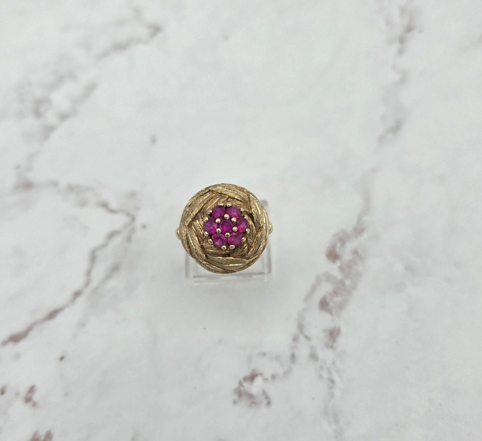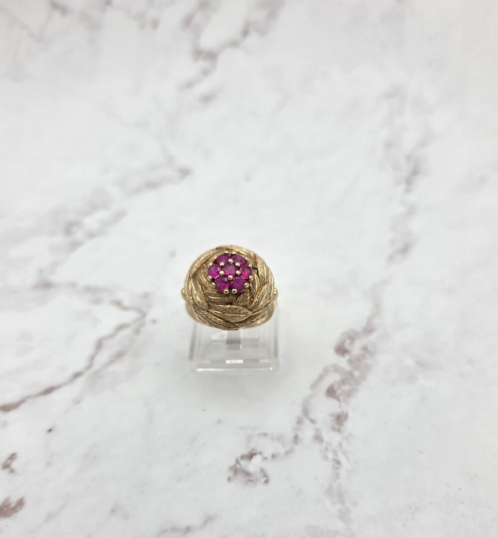 A ring in 585 thousandths yellow gold, decorated with chased foliage and 7 synthetic rubies in the centre - PB: 8.2g - Size: 53