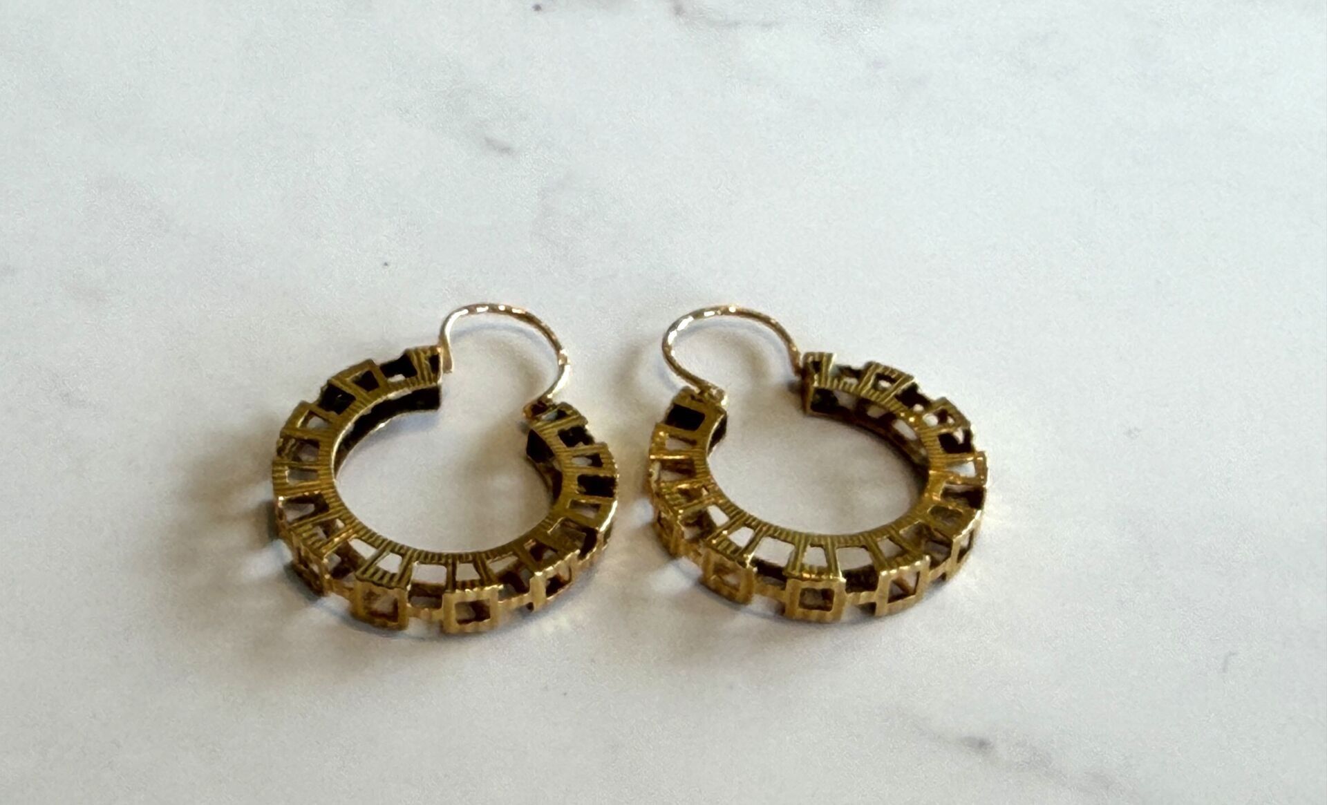 Pair of 750 thousandths yellow gold hoop earrings, guilloché and openwork decoration, weight: 3 g, diameter: 2.2 cm, eagle's head hallmark.