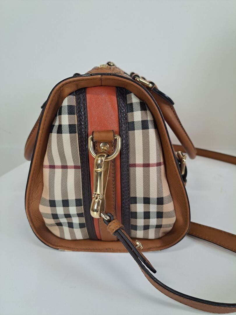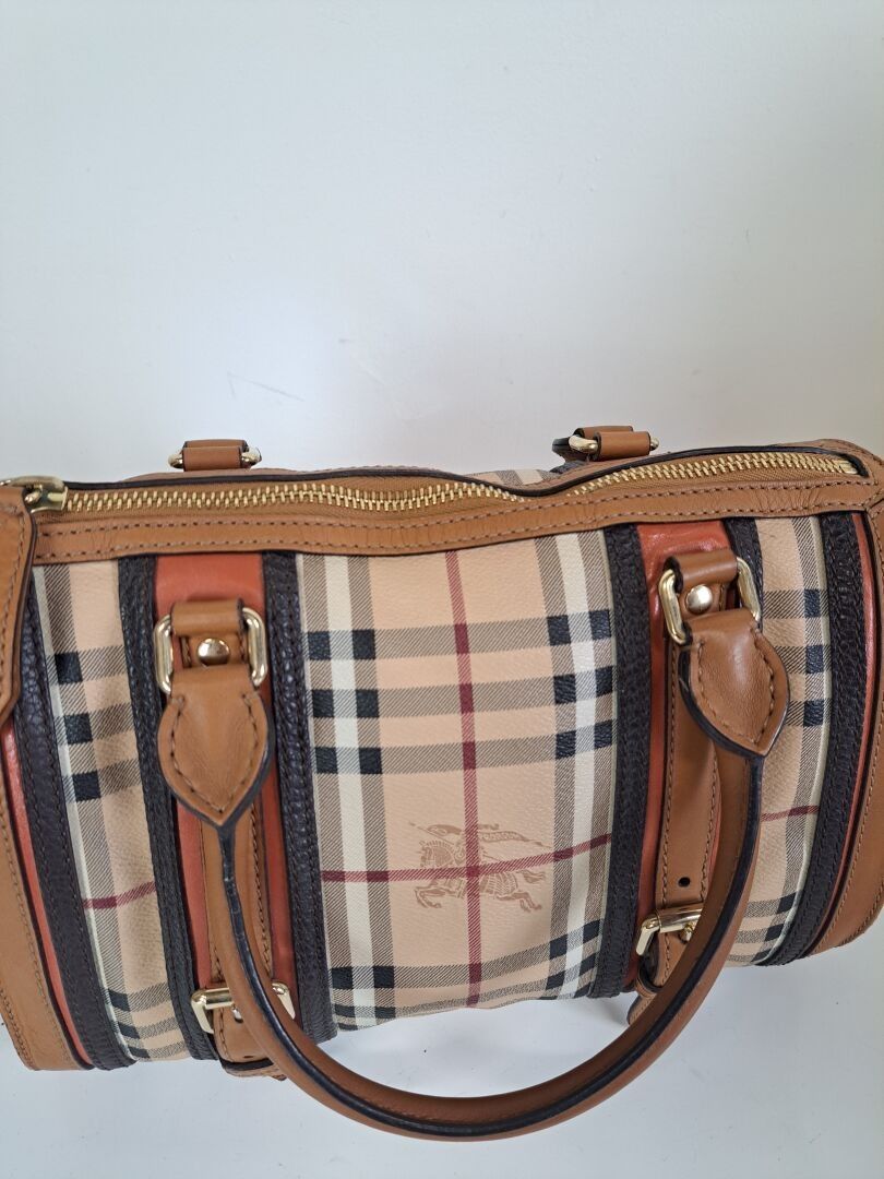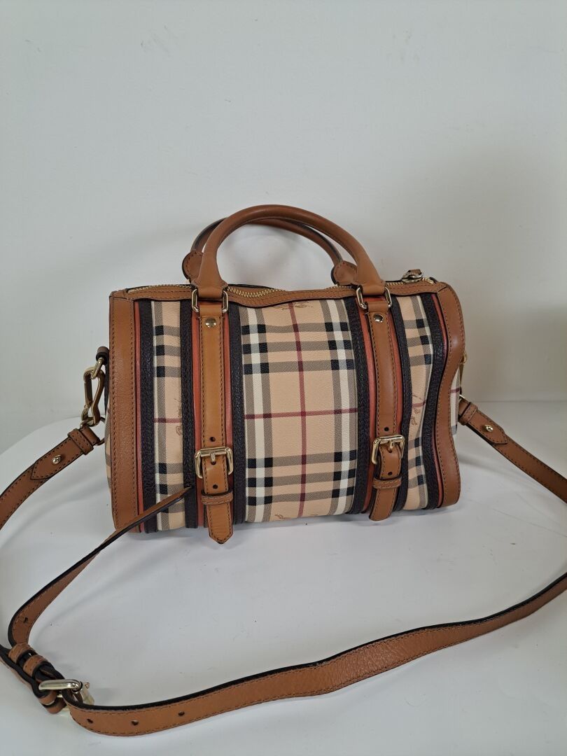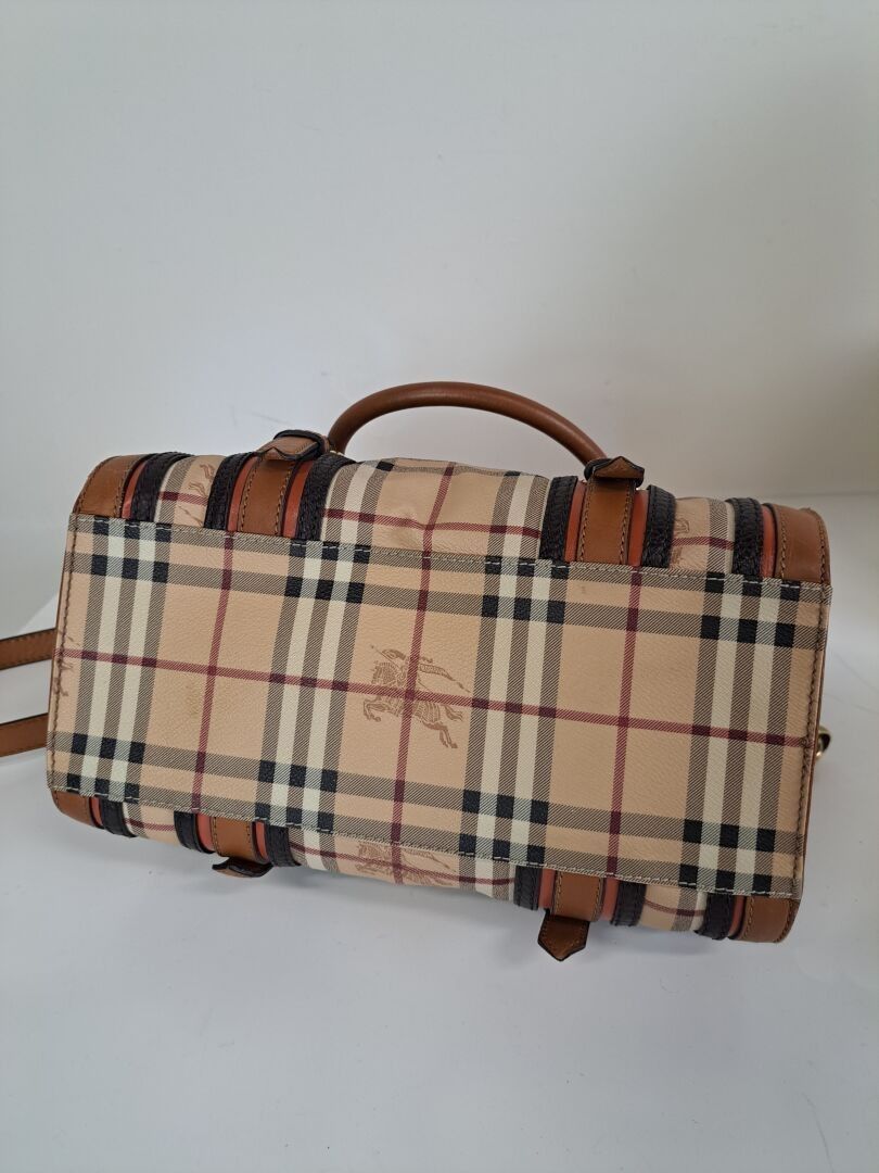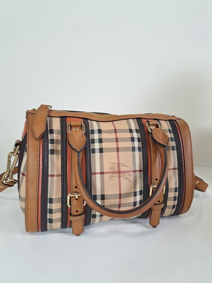 BURBERRY - Boston bag in iconic Burberry House Check canvas in beige, black, red and white with tan leather trim. Top zip fastening, two round leather handles and matching detachable shoulder strap. Gilded metal finish, inner fabric lining. Burberry Equestrian Knight logo embroidered on front. - 30 x 20 x 16 cm (approx.) - Very good condition