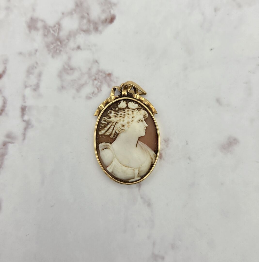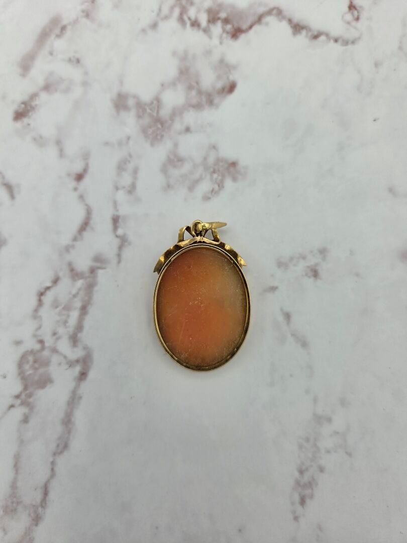 Oval pendant in 750 thousandths yellow gold set with a shell cameo with a female profile, embellished at the top with a ribbon knot motif, weight: 6.5 g, height: 4.2 cm