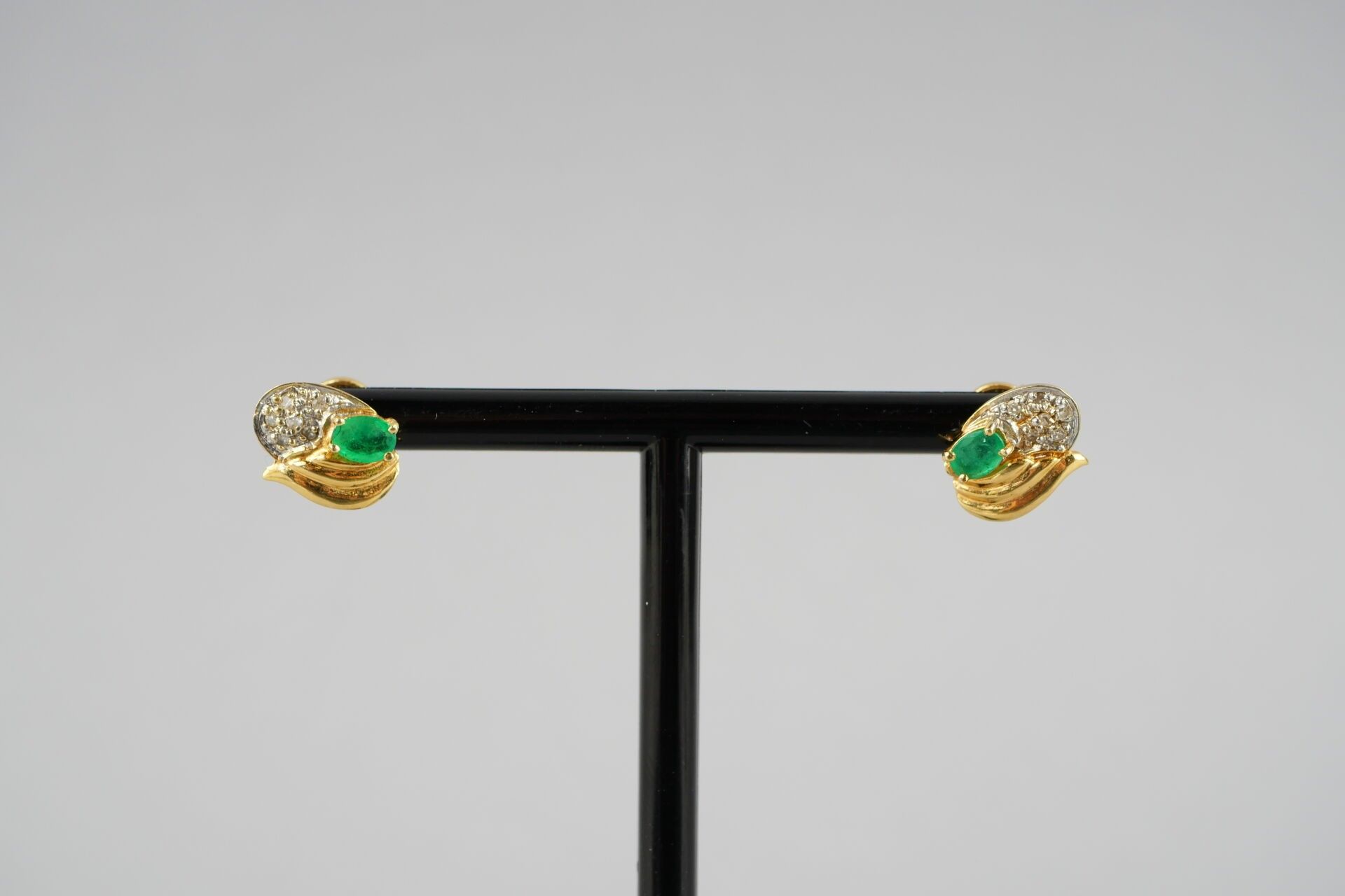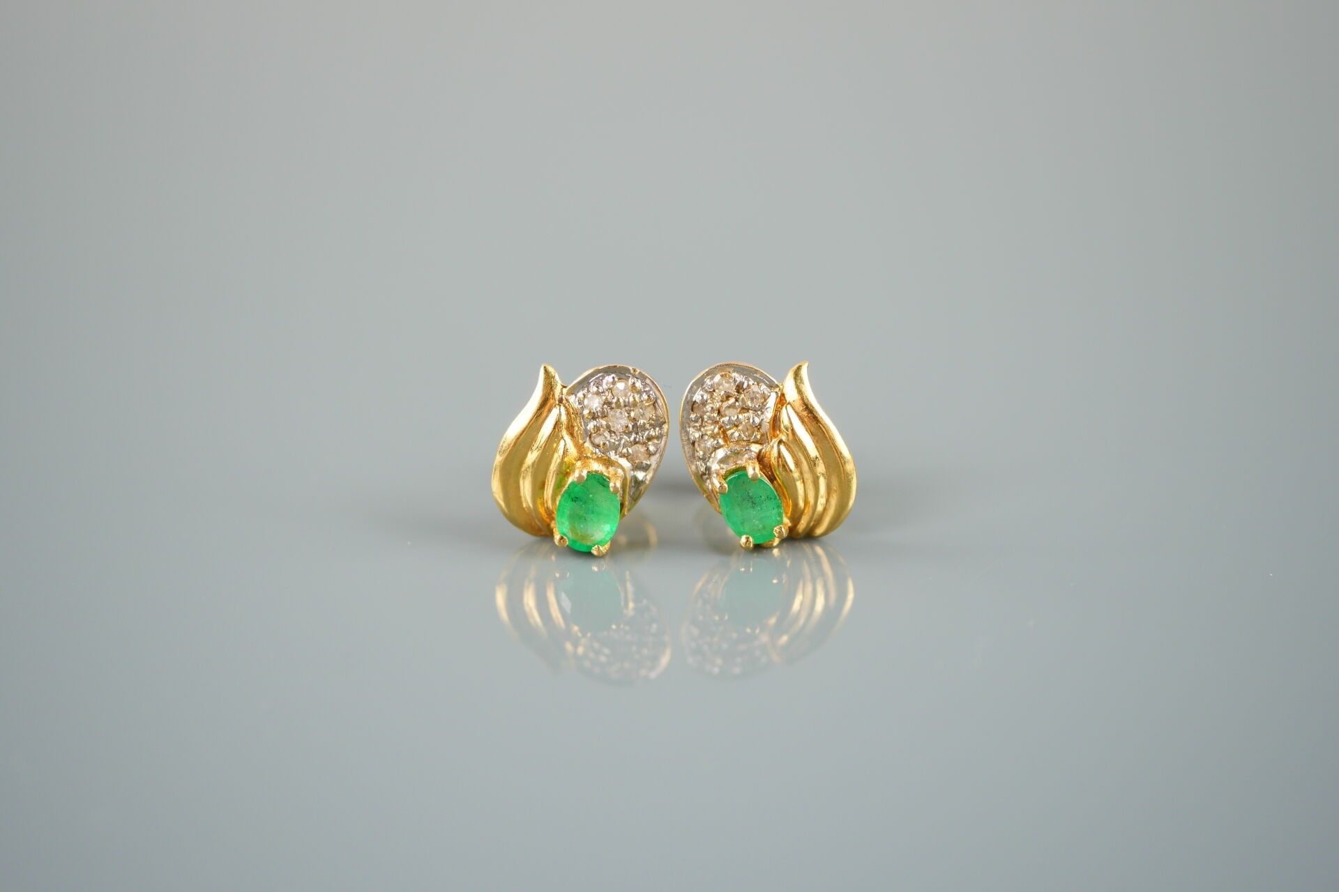 Pair of 18K-750 thousandths yellow gold ear studs set with small diamonds and probably an emerald.