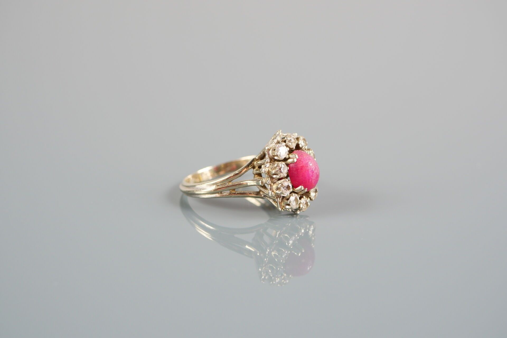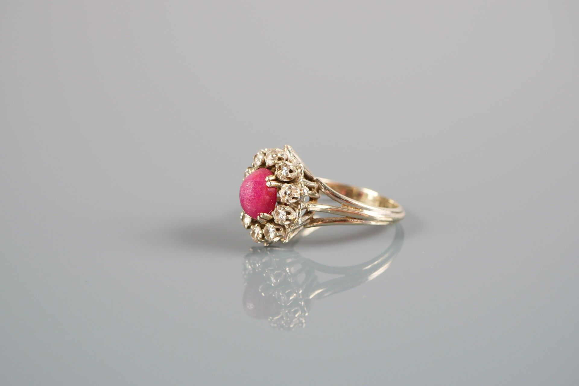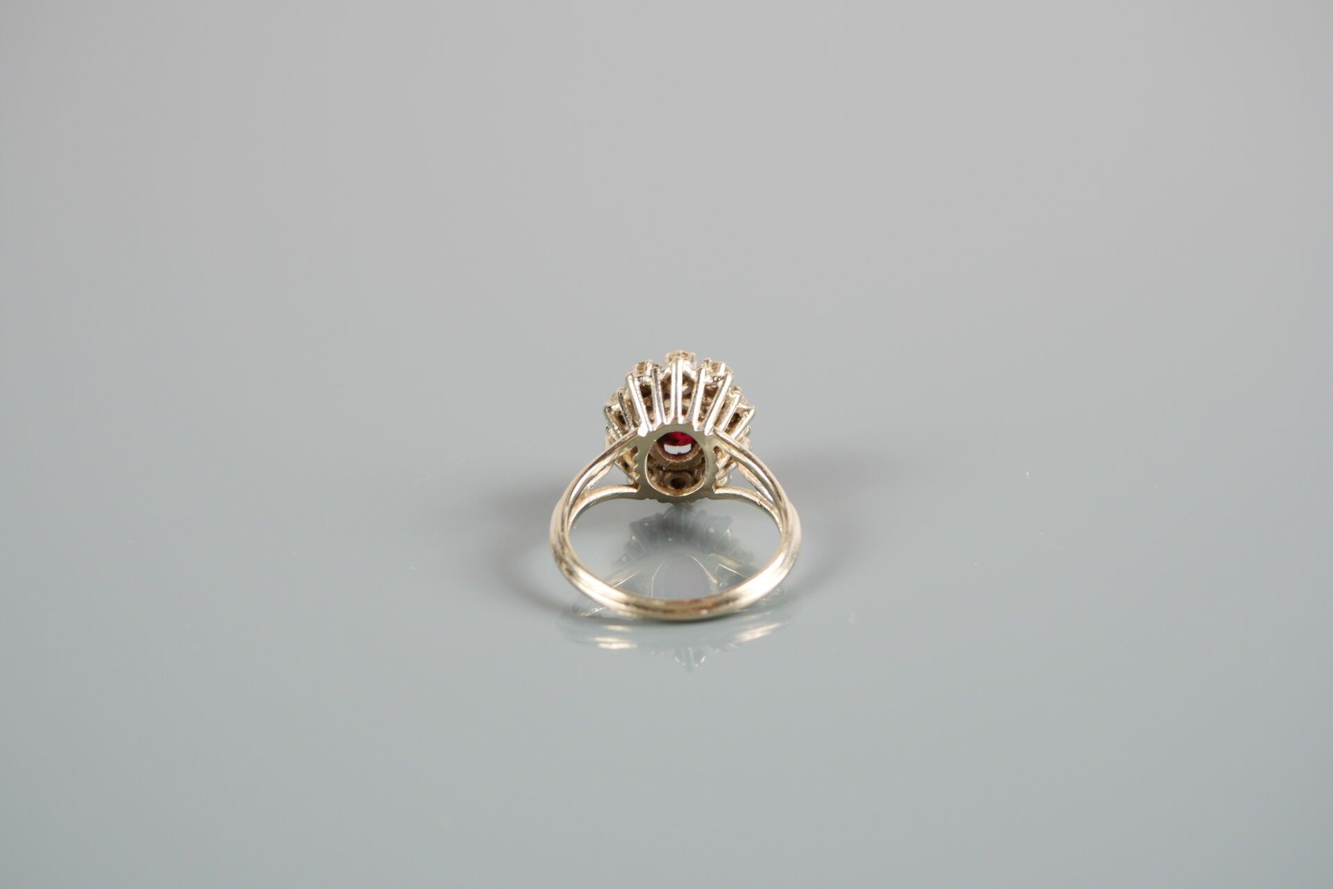 Pompadour ring in 18K-750 thousandths white gold, possibly set with a ruby in a setting of 10 diamonds.