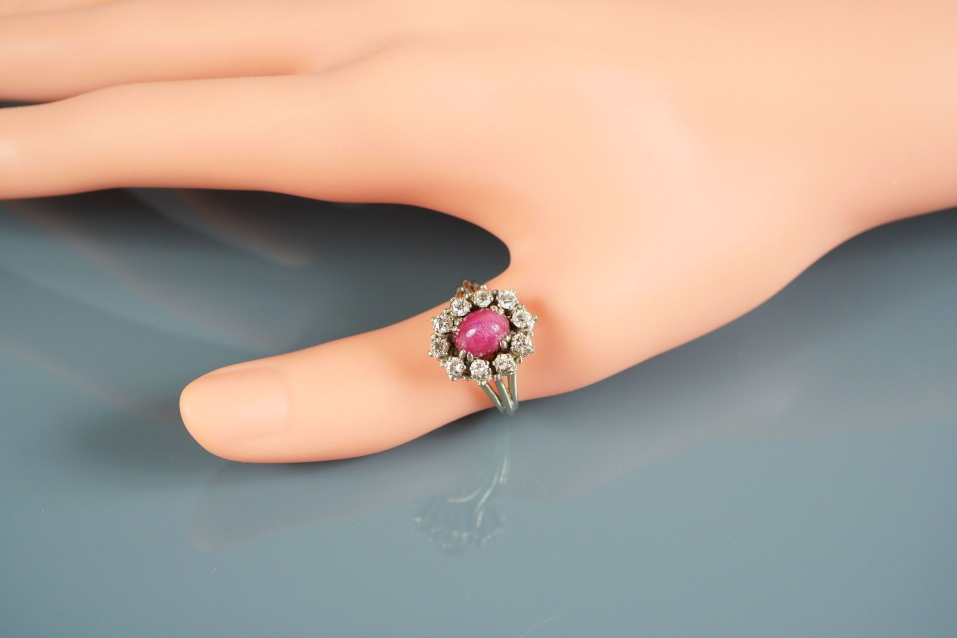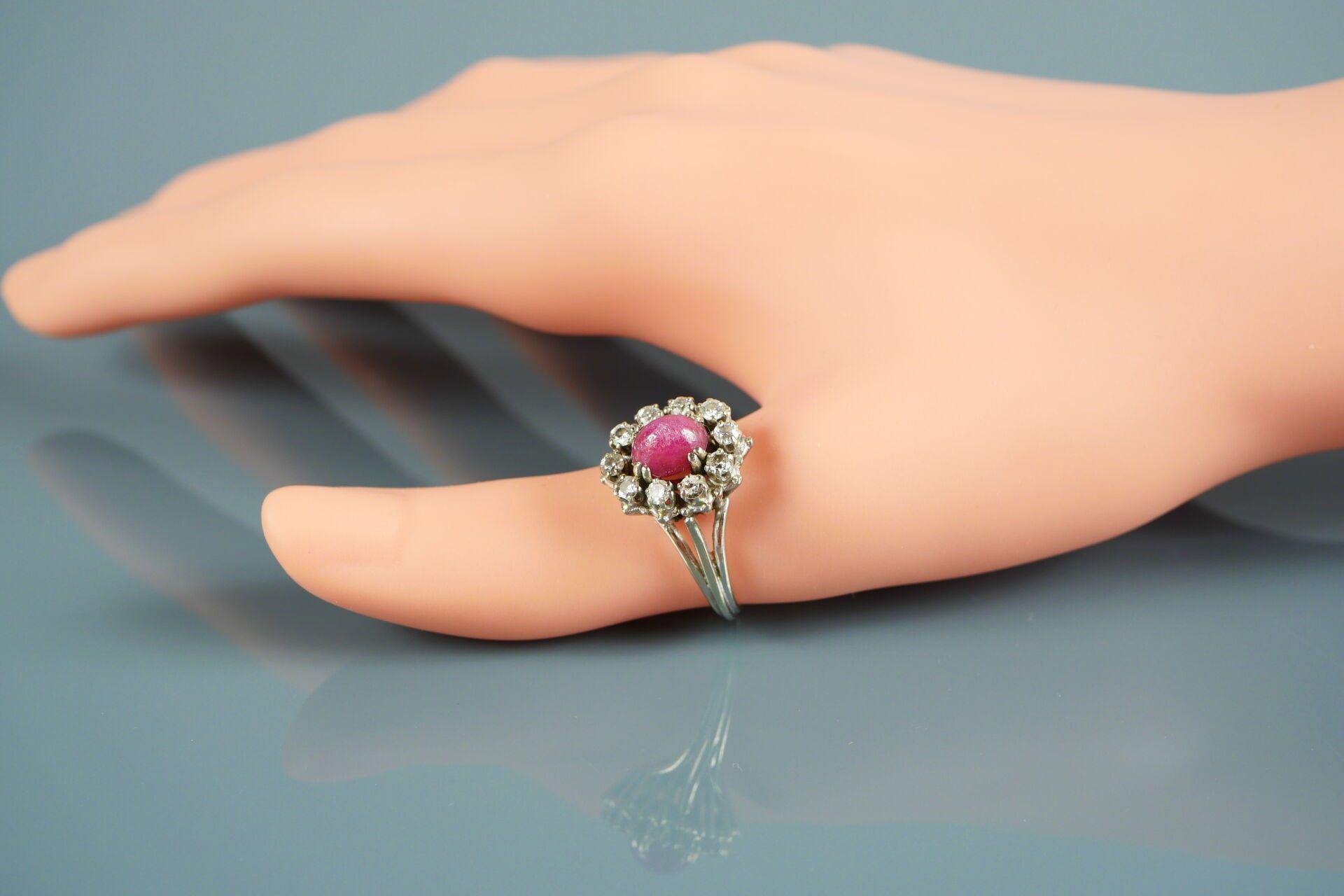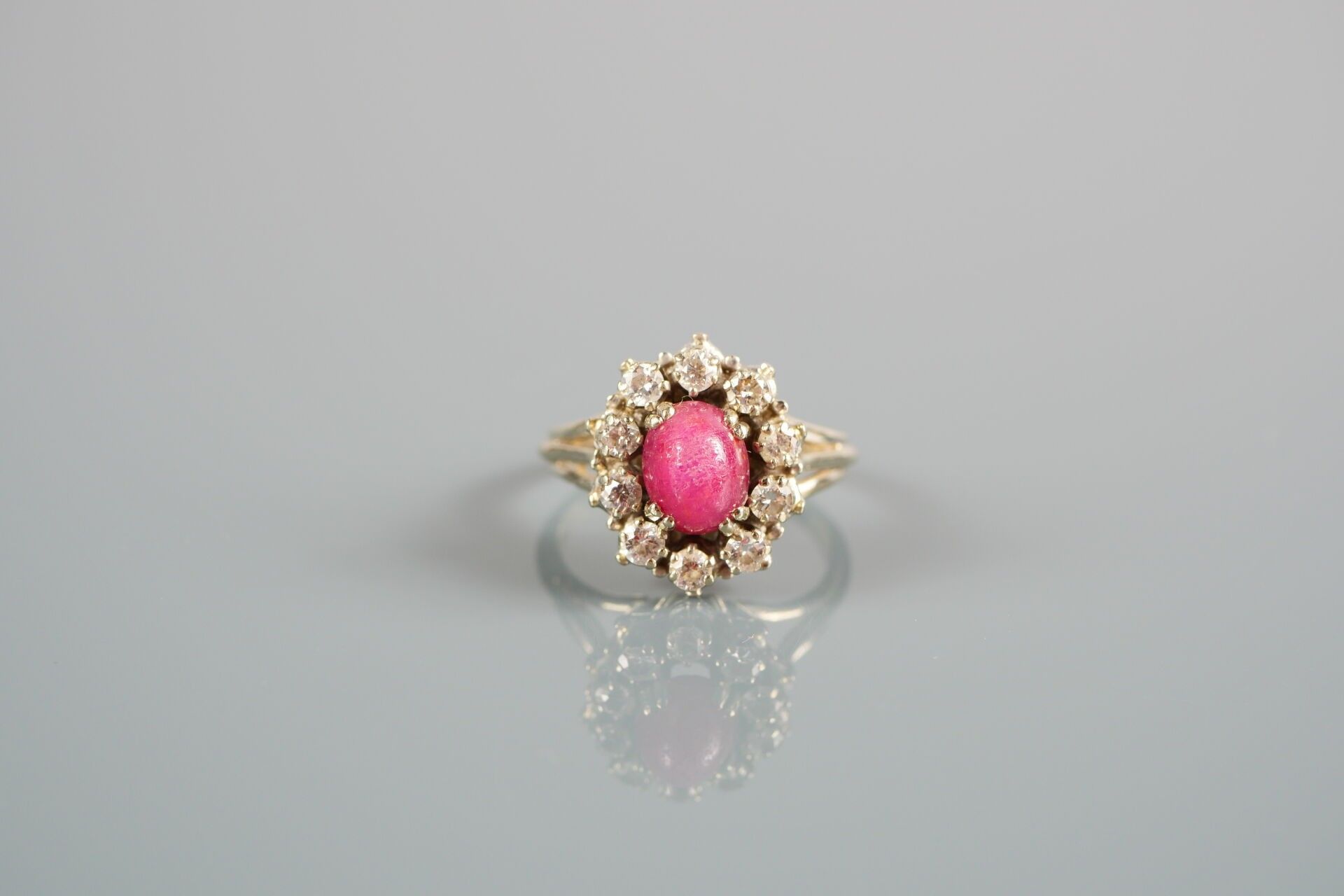 Pompadour ring in 18K-750 thousandths white gold, possibly set with a ruby in a setting of 10 diamonds.