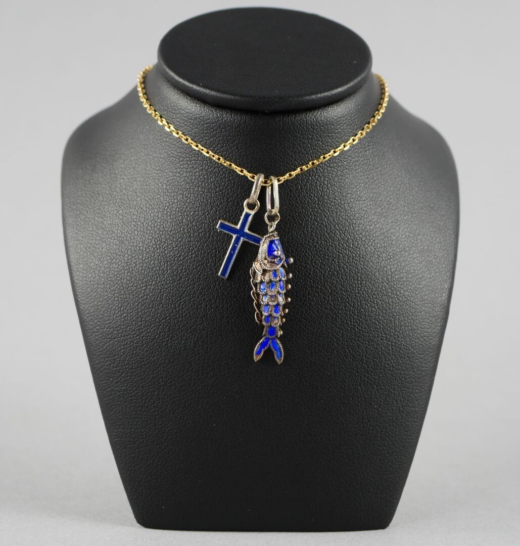 Two pendants : A small cross and an articulated fish pendant…
