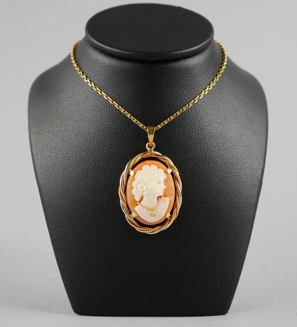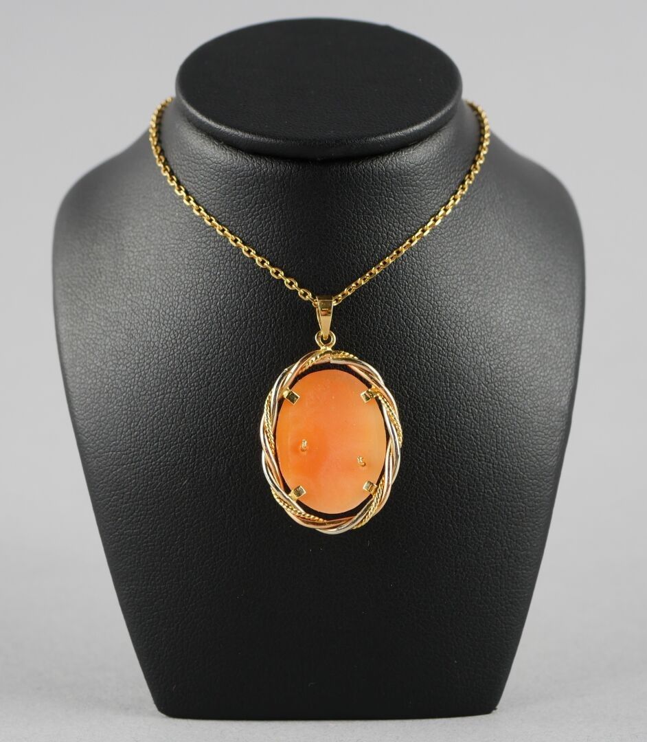 Cameo style pendant mounted in 18K-750 thousandths yellow gold.