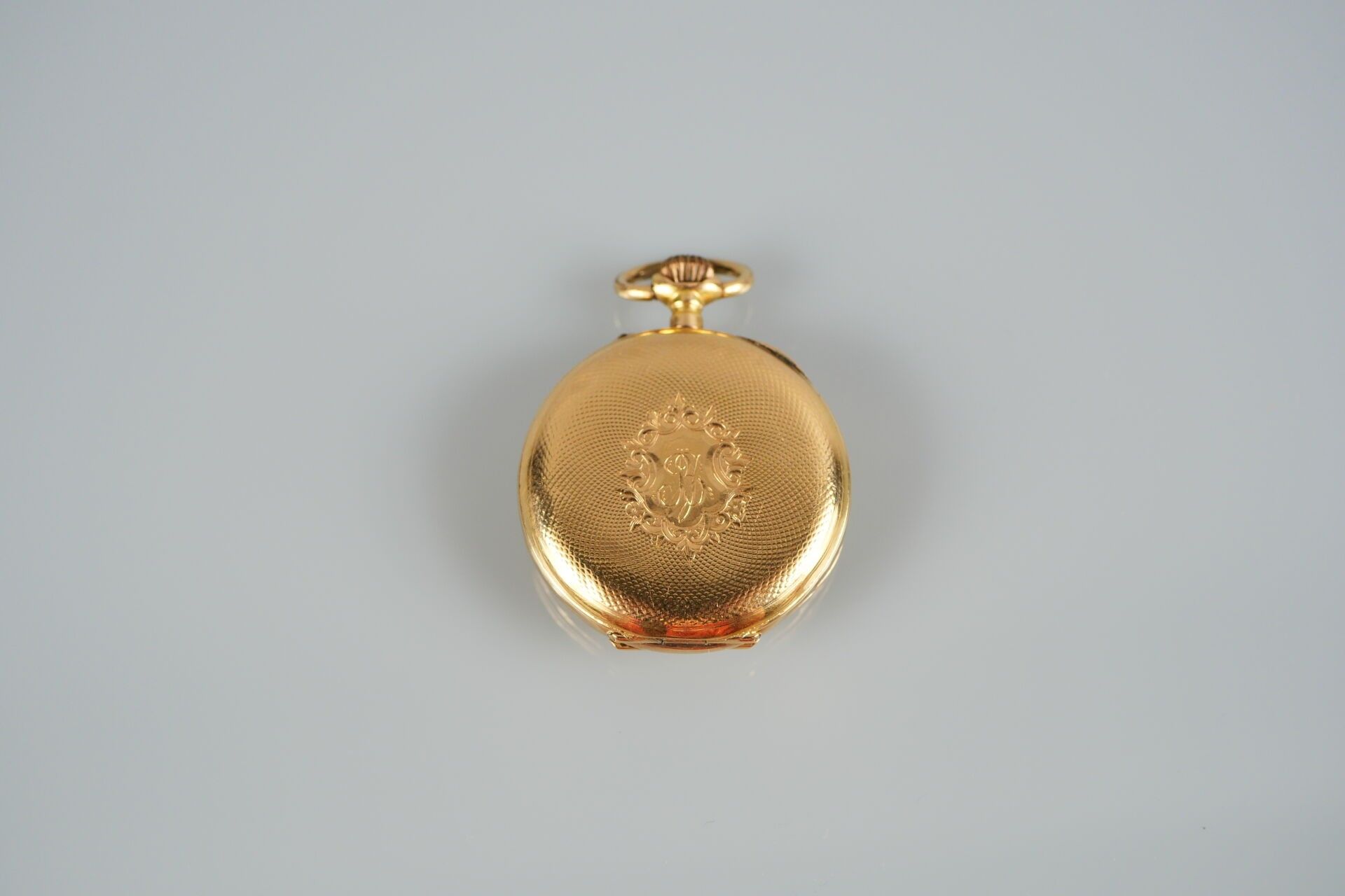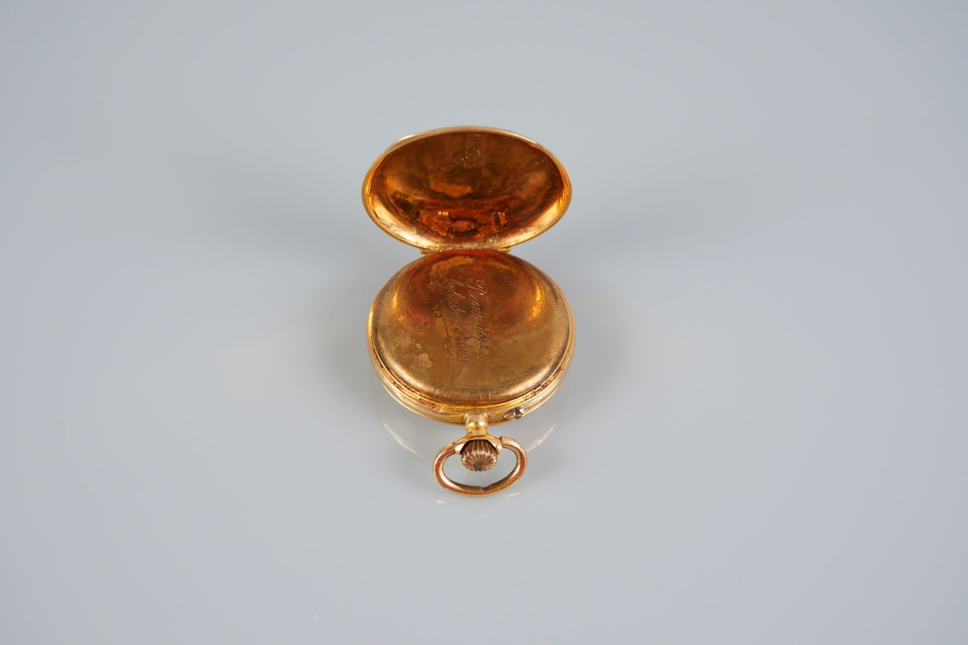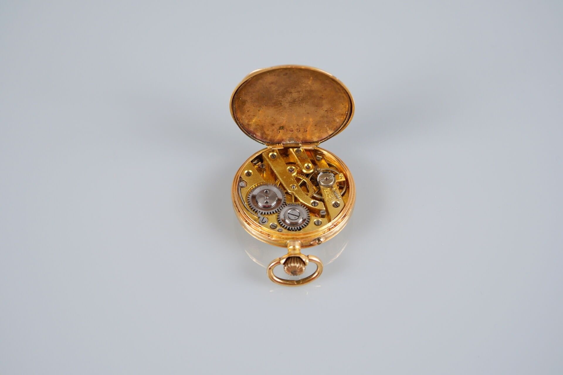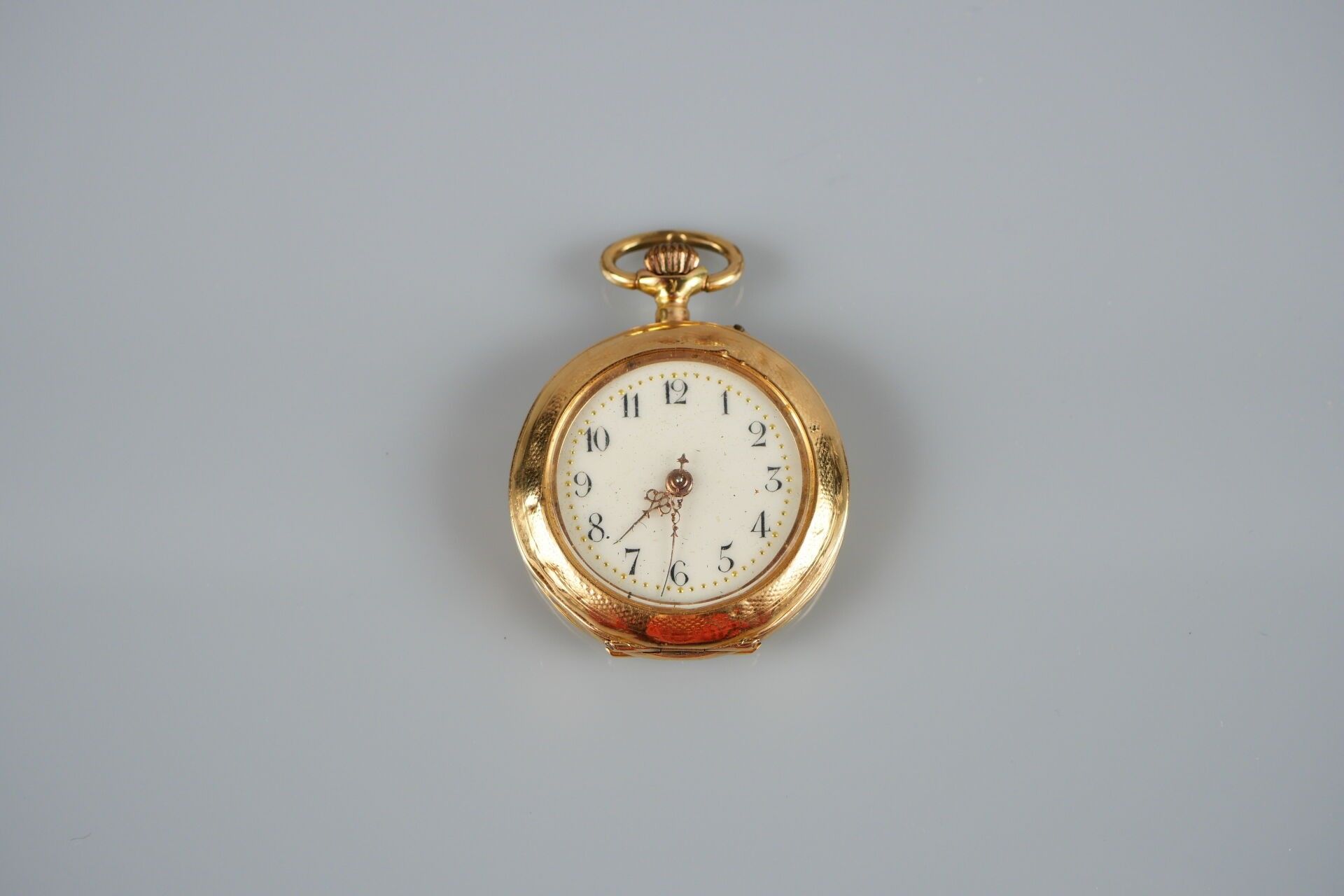 Collar watch with case in 18K-750 thousandths yellow gold. Metal case. White enamelled dial with Arabic numerals. Stylised hands. Encrypted case back.