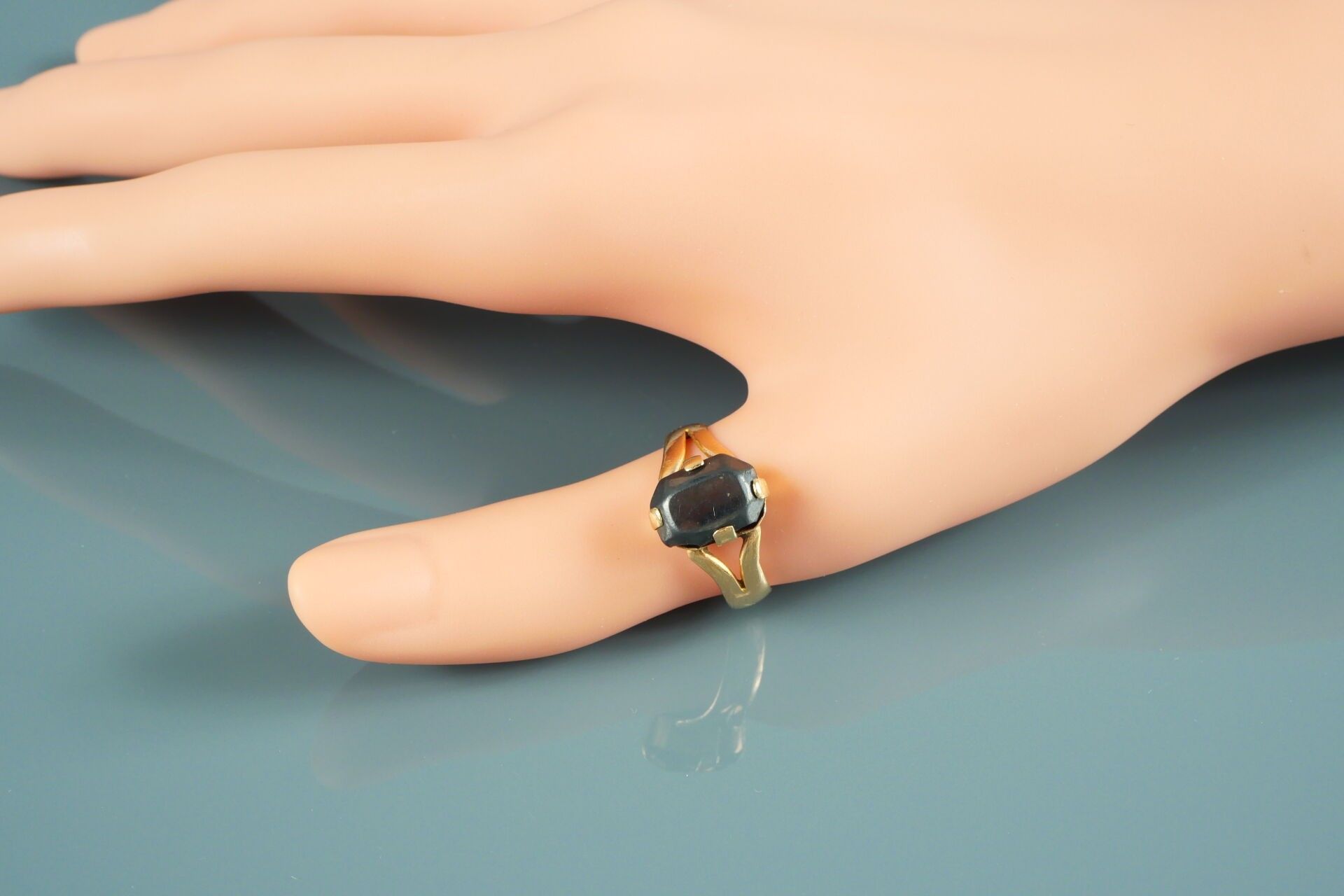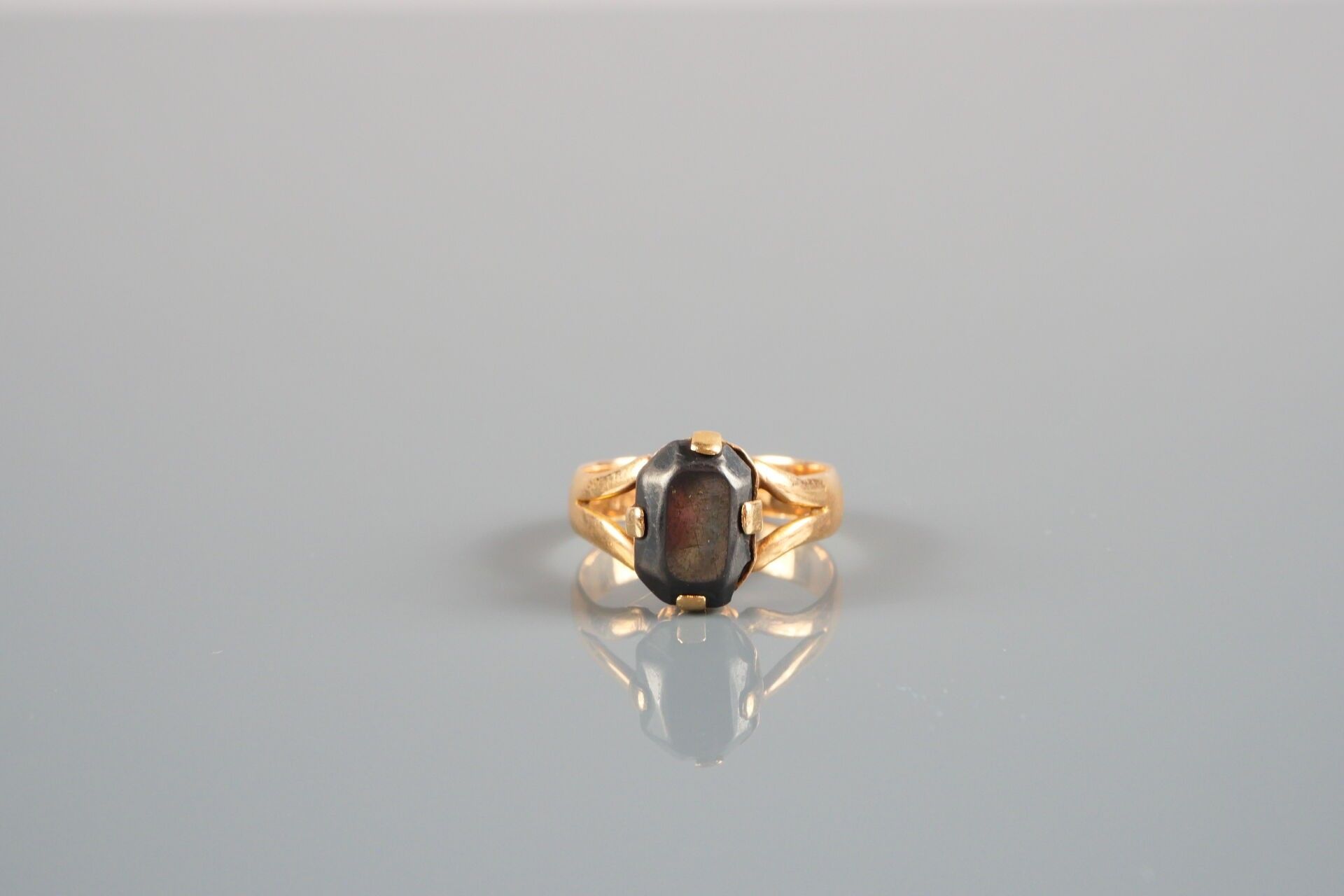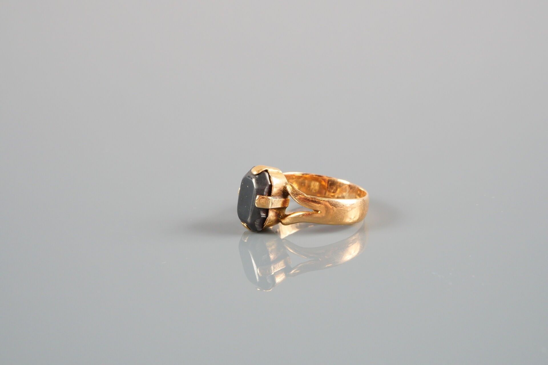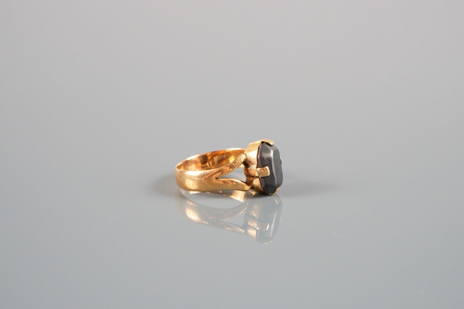 18K-750 thousandths yellow gold ring set with a dark stone: