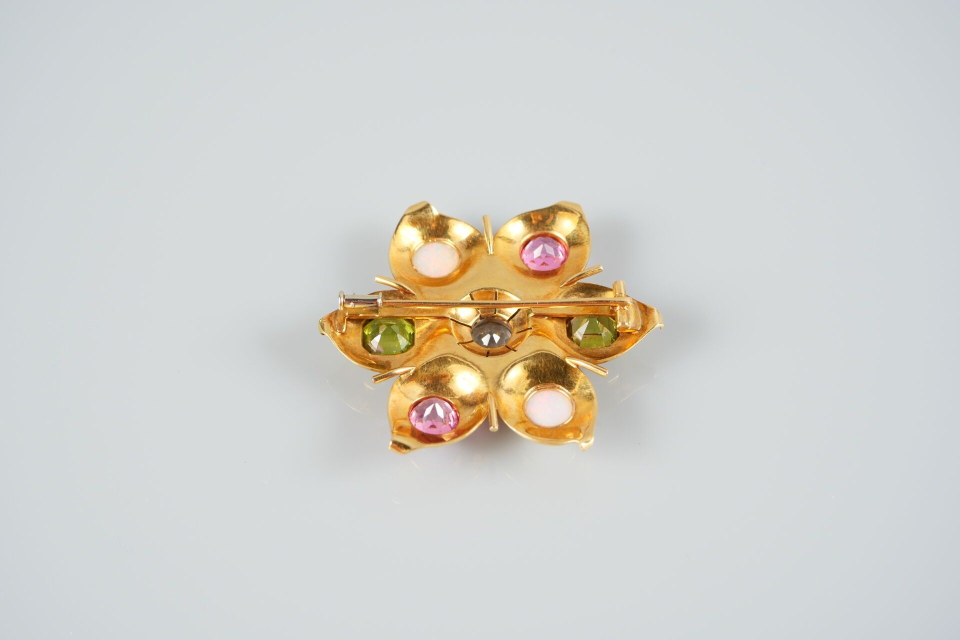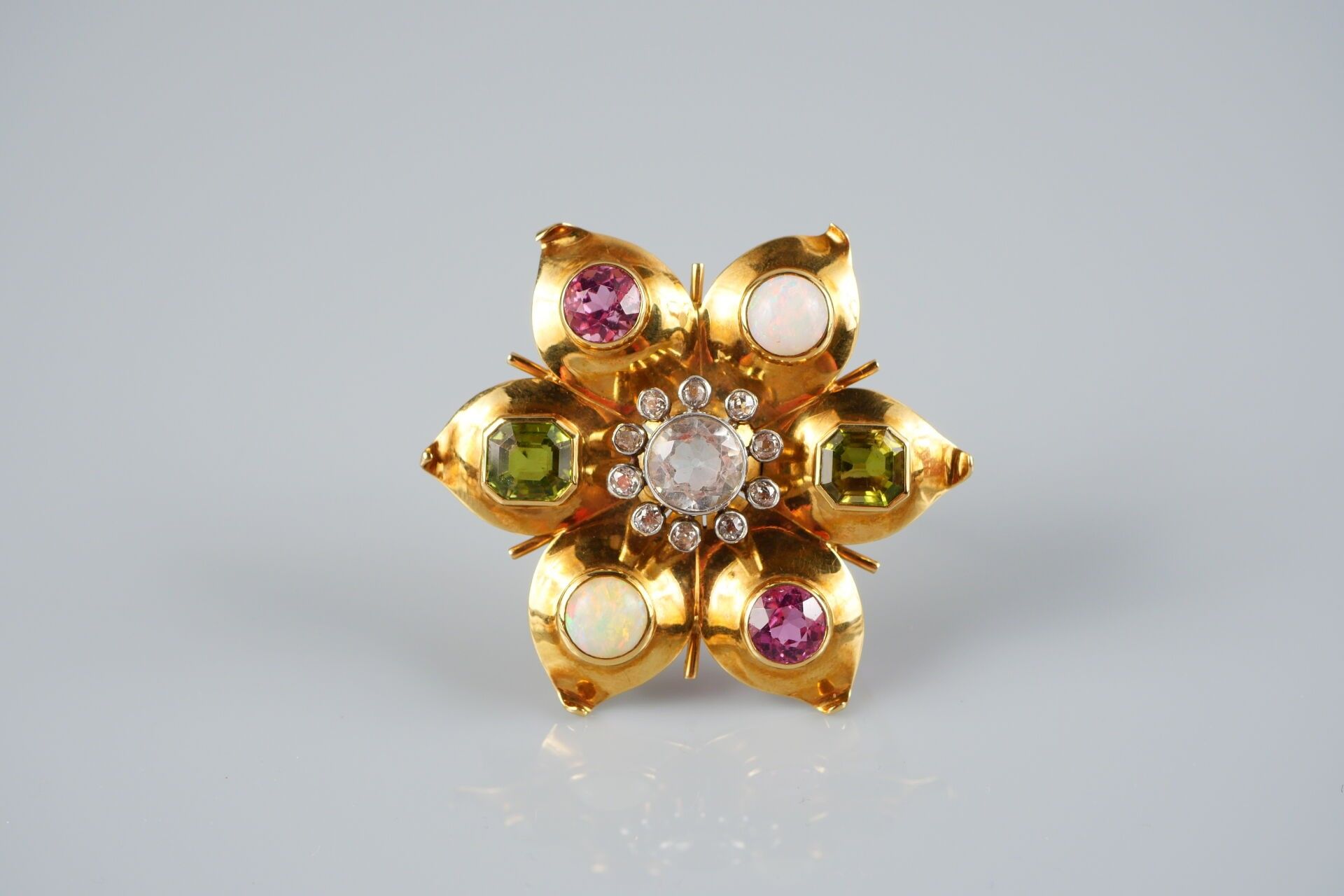 18K-750 thousandths yellow gold and 850 thousandths platinum flower brooch set with a central white stone in a setting of 10 small diamonds. Petals set with a pink, green or white stone with iridescent reflections in the opal style.