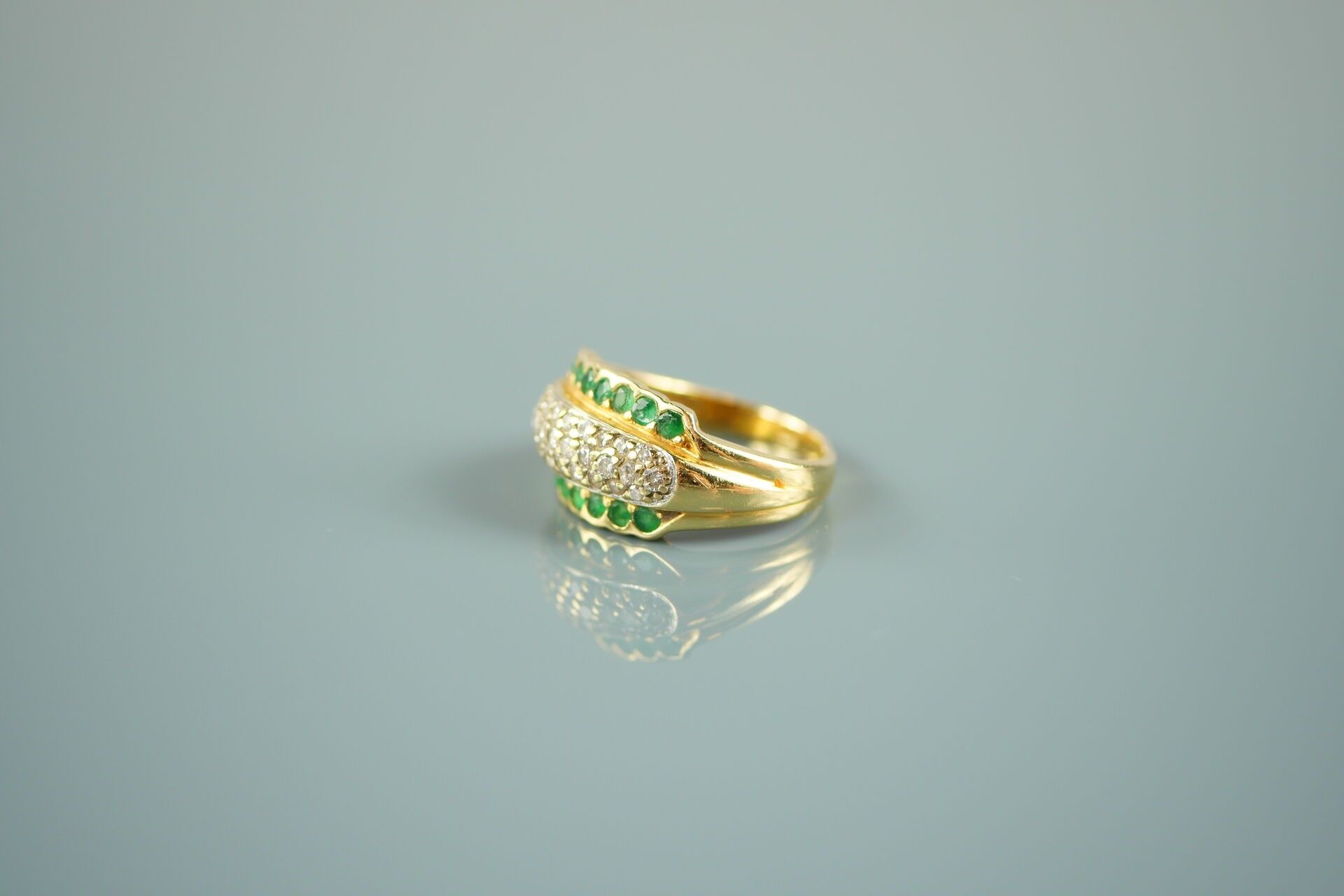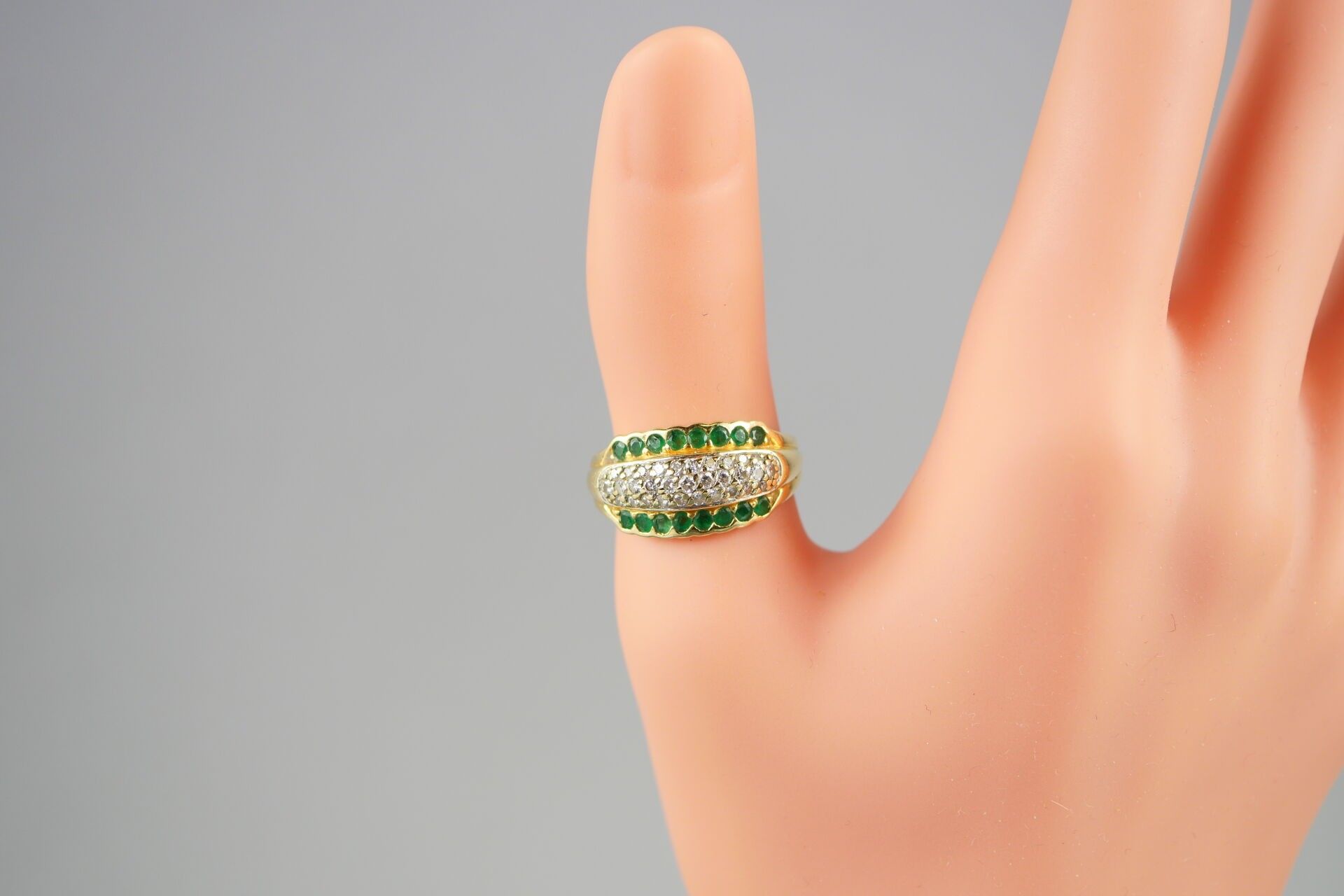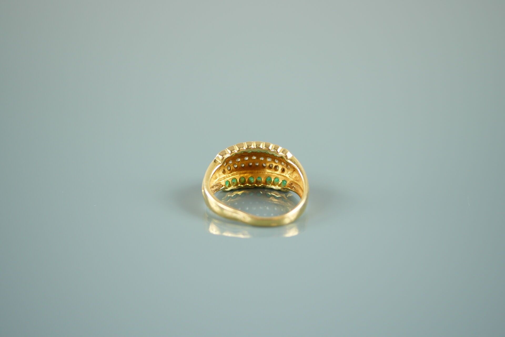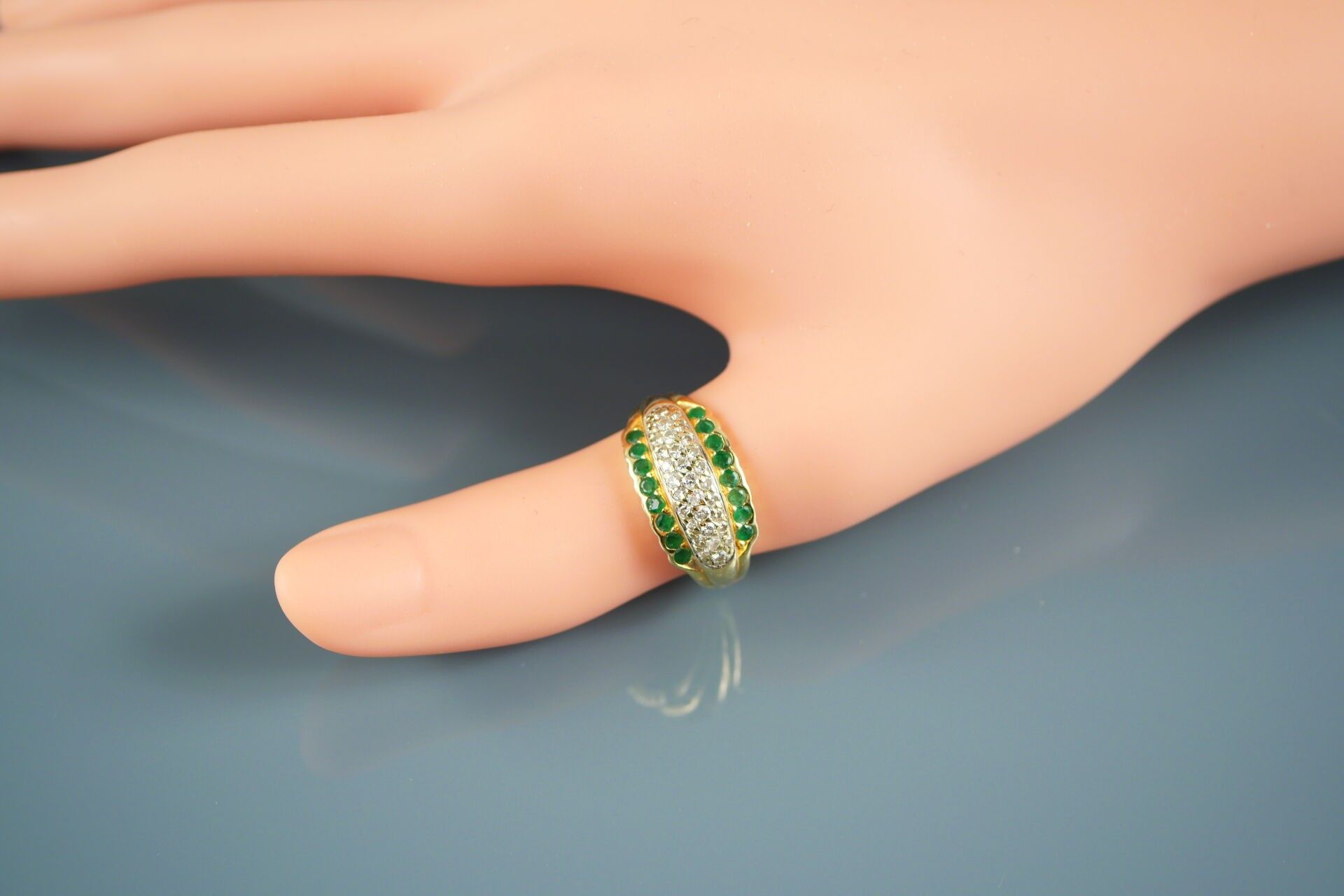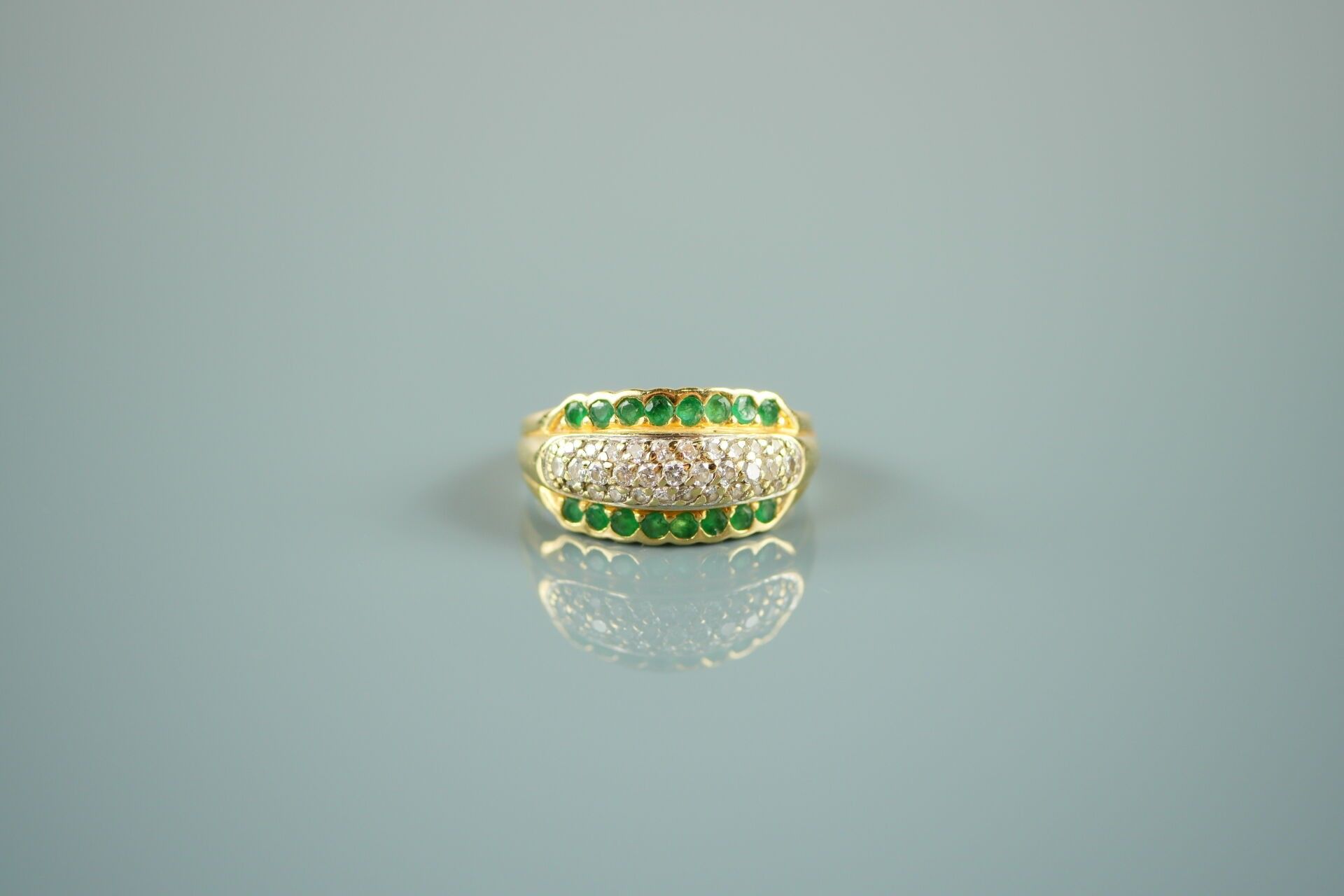 18K-750 thousandths yellow gold ring set with three lines of diamonds possibly surrounded by emeralds.