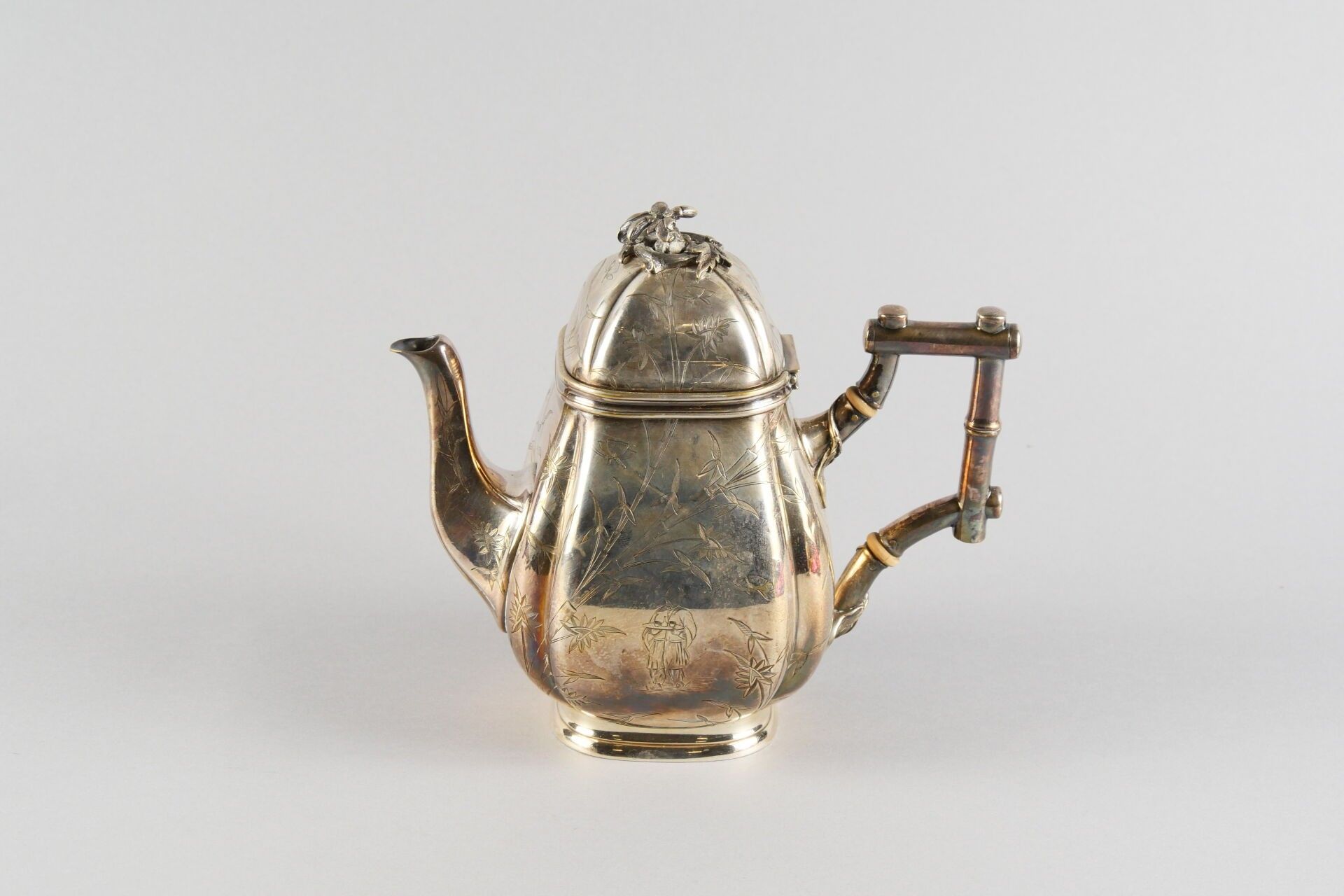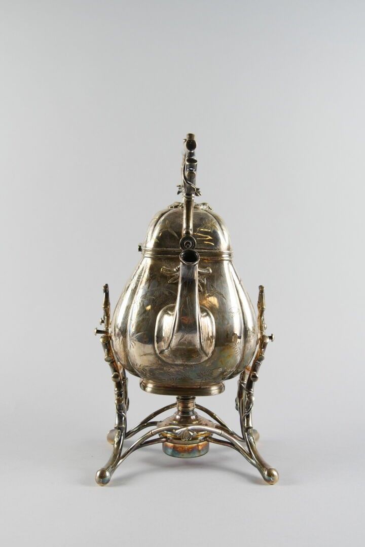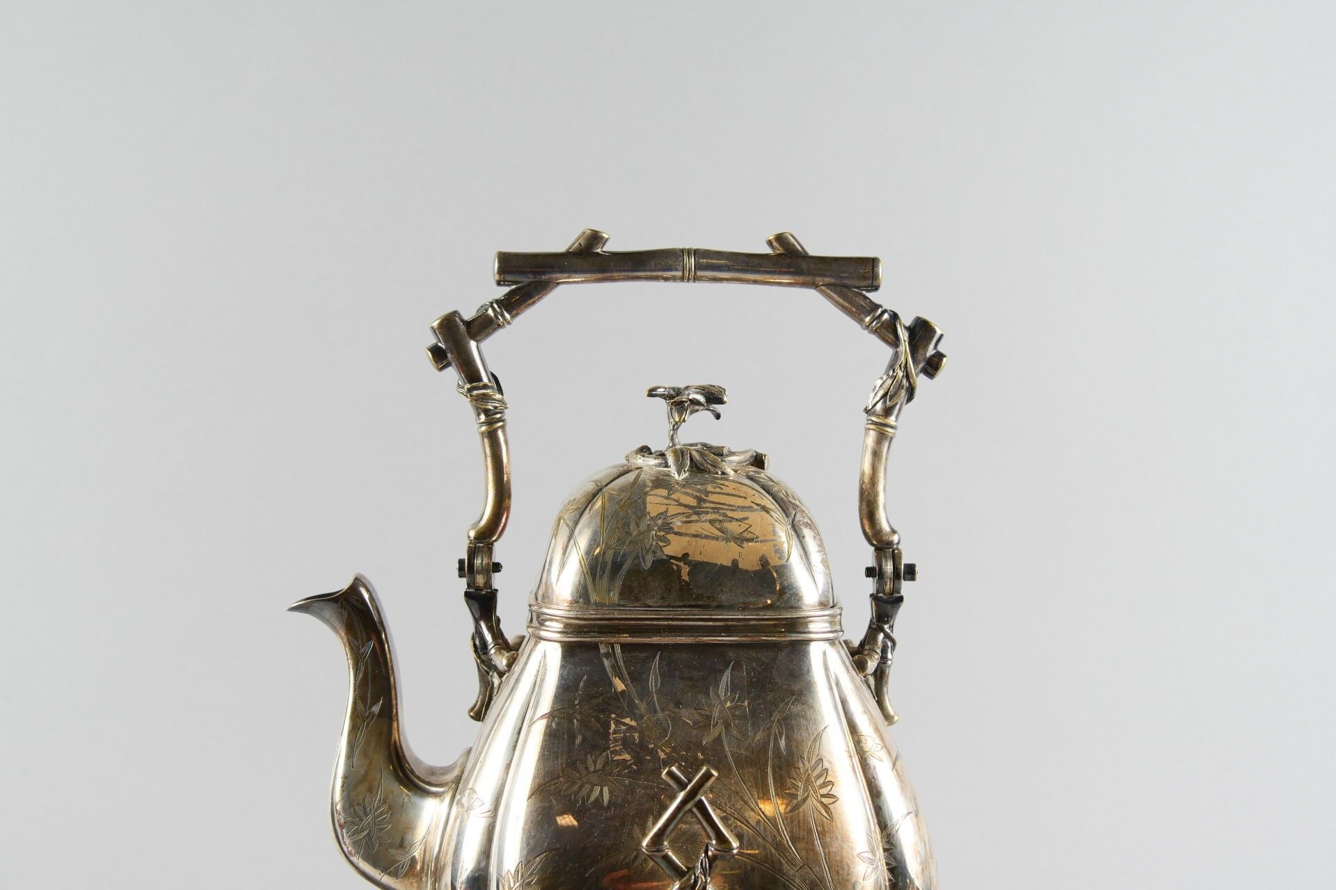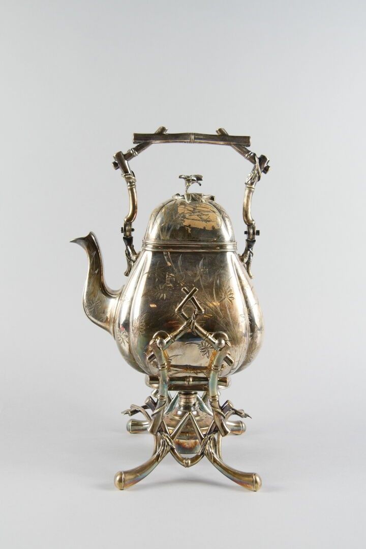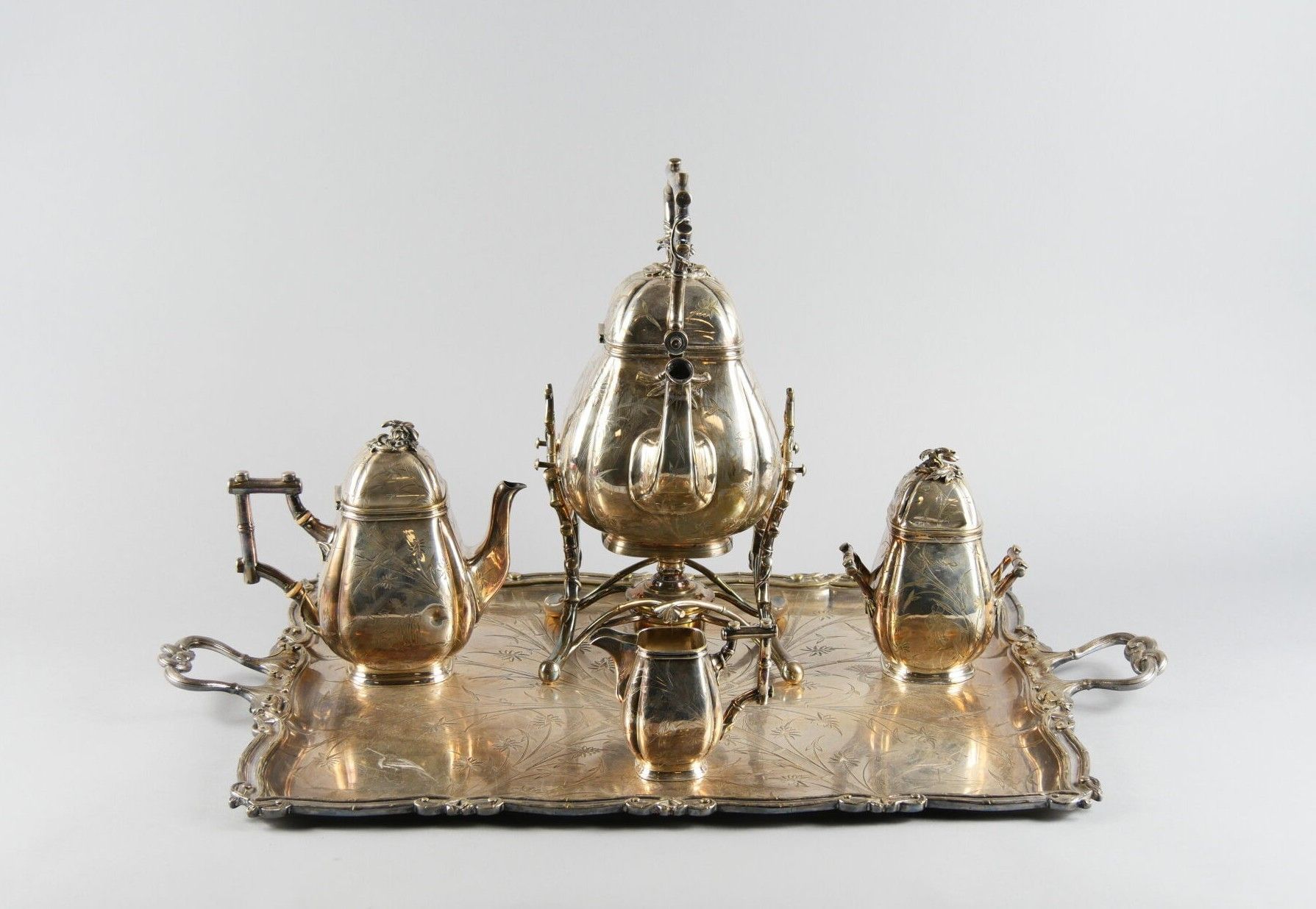 A silver-plated serving set decorated with birds, butterflies, bamboo and peacocks, comprising a samovar on a removable four-legged stand, a jug, a sugar bowl, a milk jug and a tray.