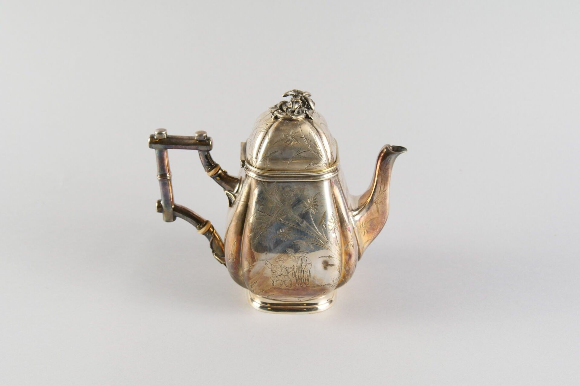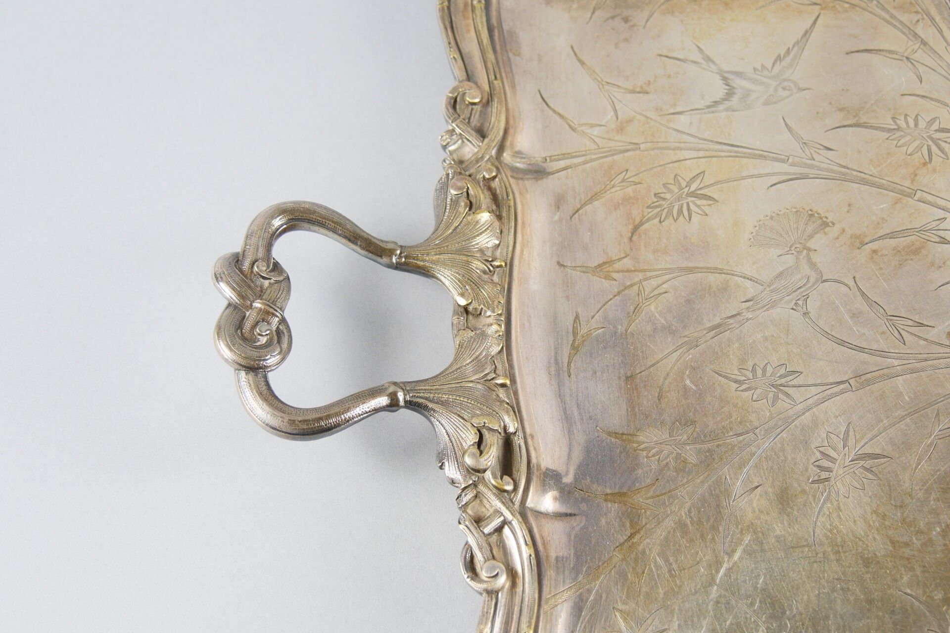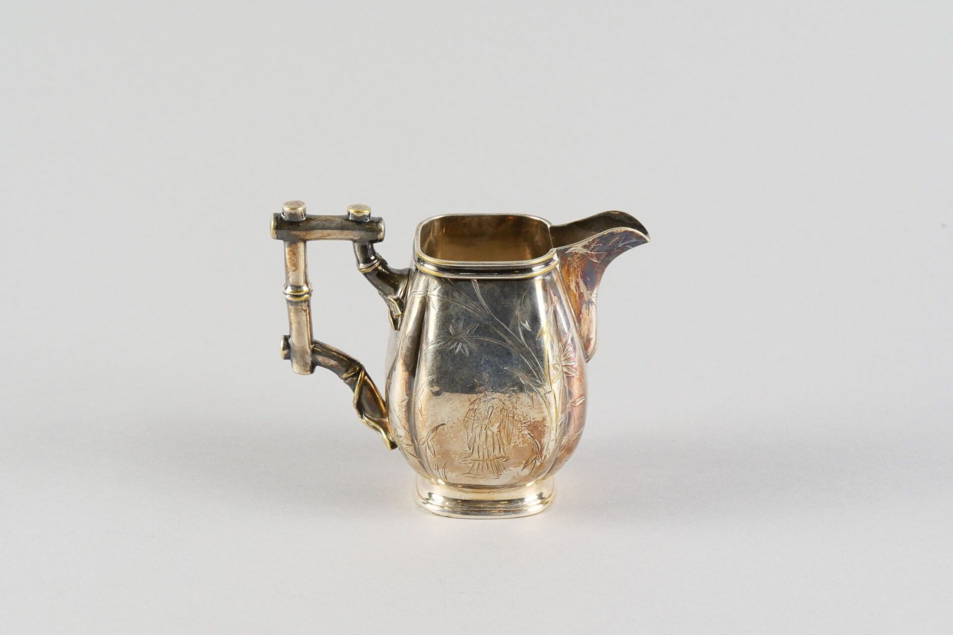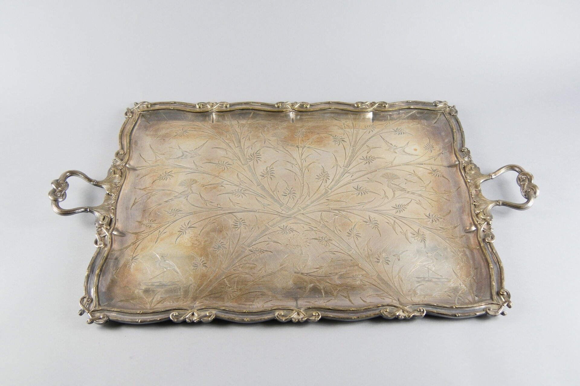 A silver-plated serving set decorated with birds, butterflies, bamboo and peacocks, comprising a samovar on a removable four-legged stand, a jug, a sugar bowl, a milk jug and a tray.