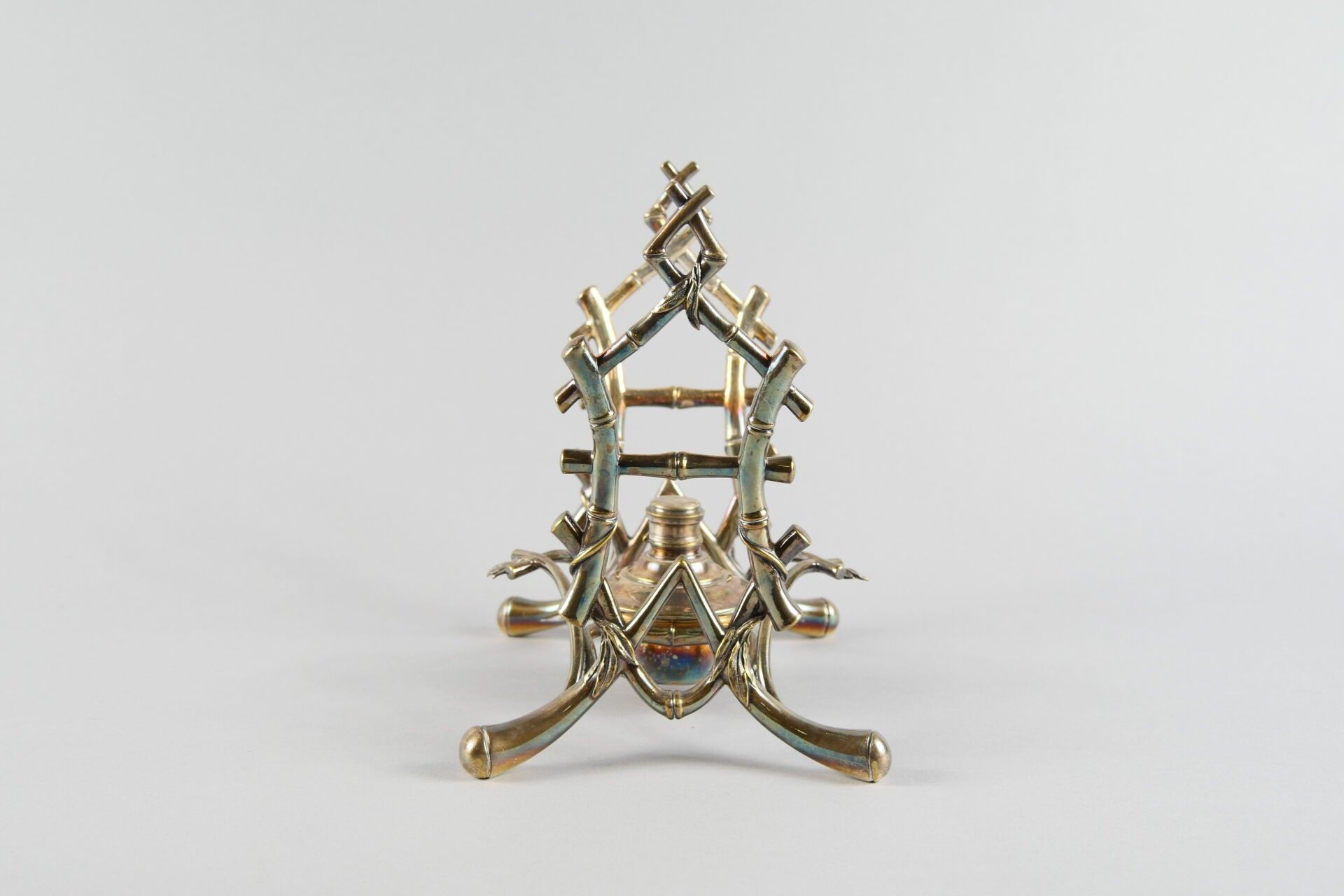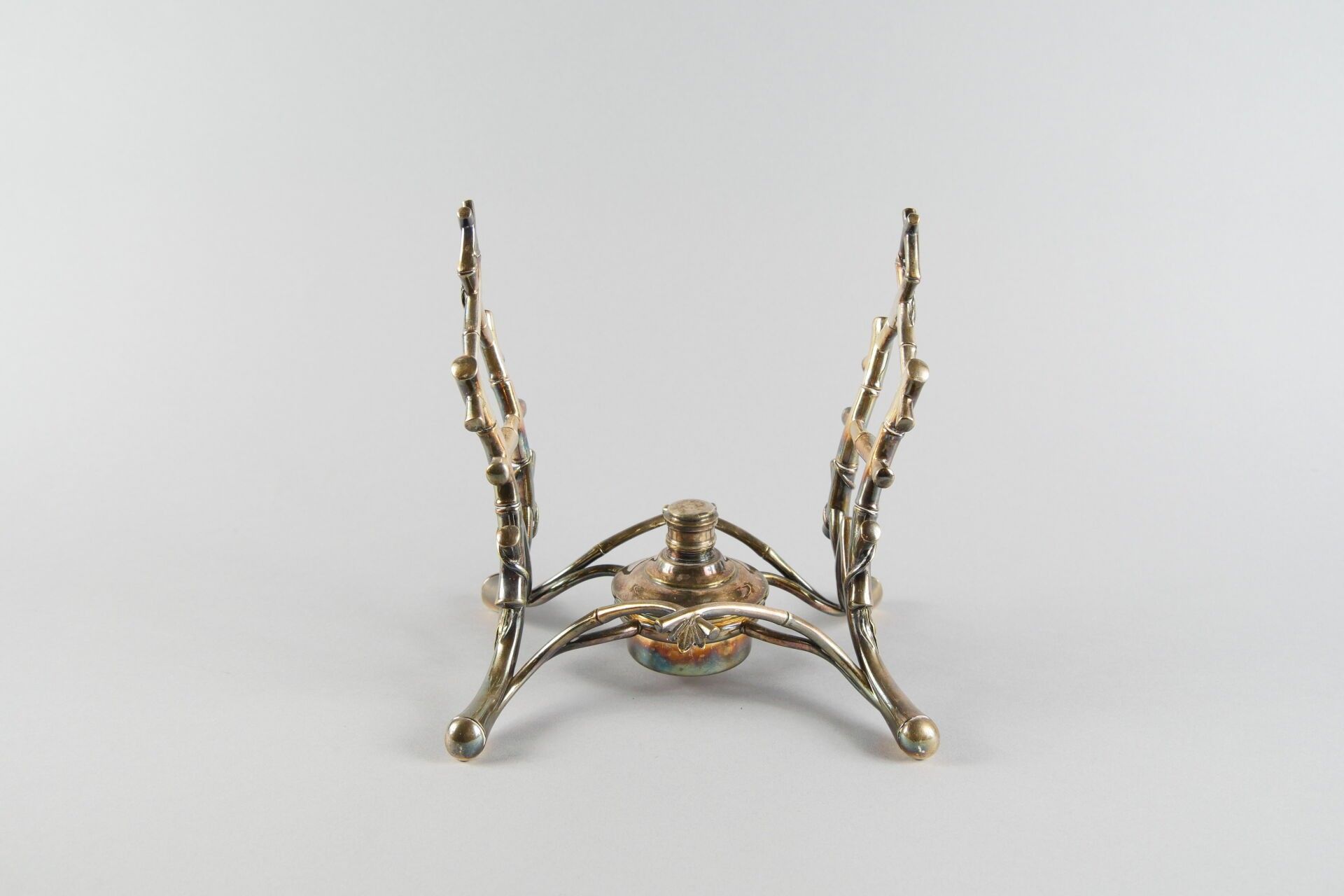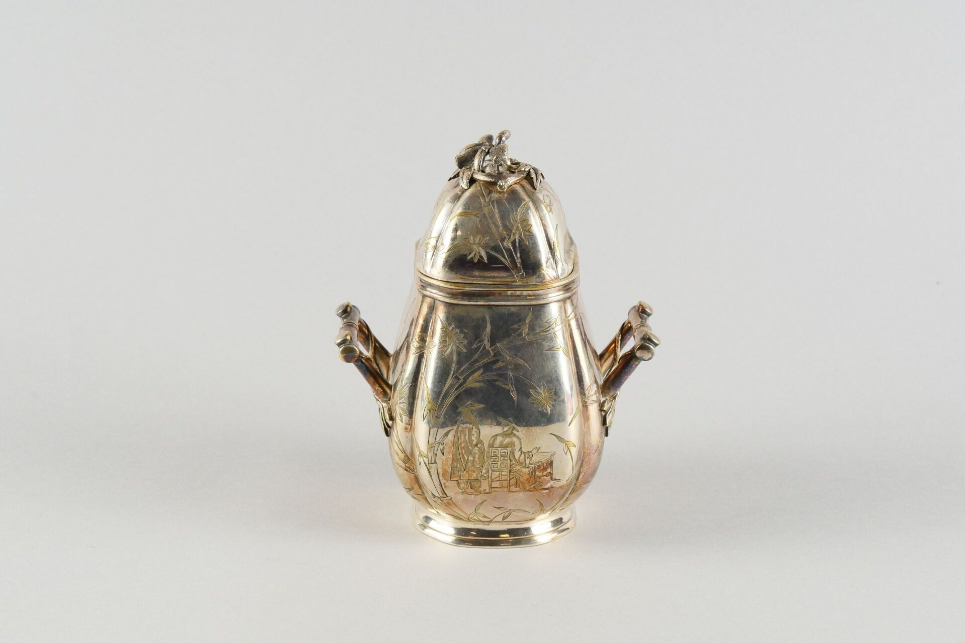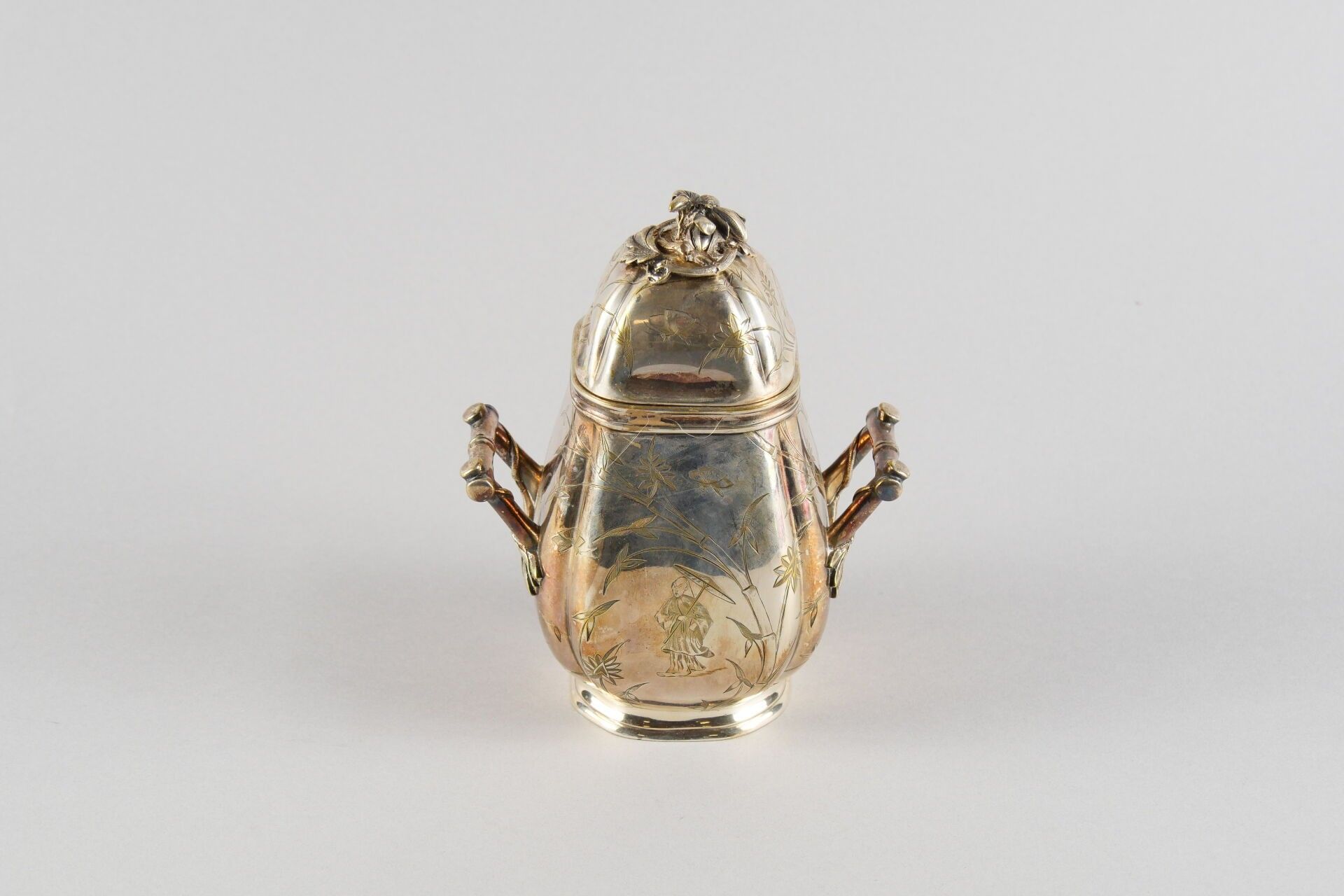 A silver-plated serving set decorated with birds, butterflies, bamboo and peacocks, comprising a samovar on a removable four-legged stand, a jug, a sugar bowl, a milk jug and a tray.