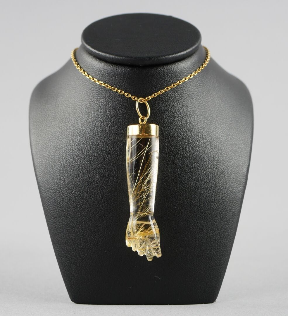 White translucent hand pendant decorated with gold filaments, mounted and set in 14K-585 thousandths yellow gold.