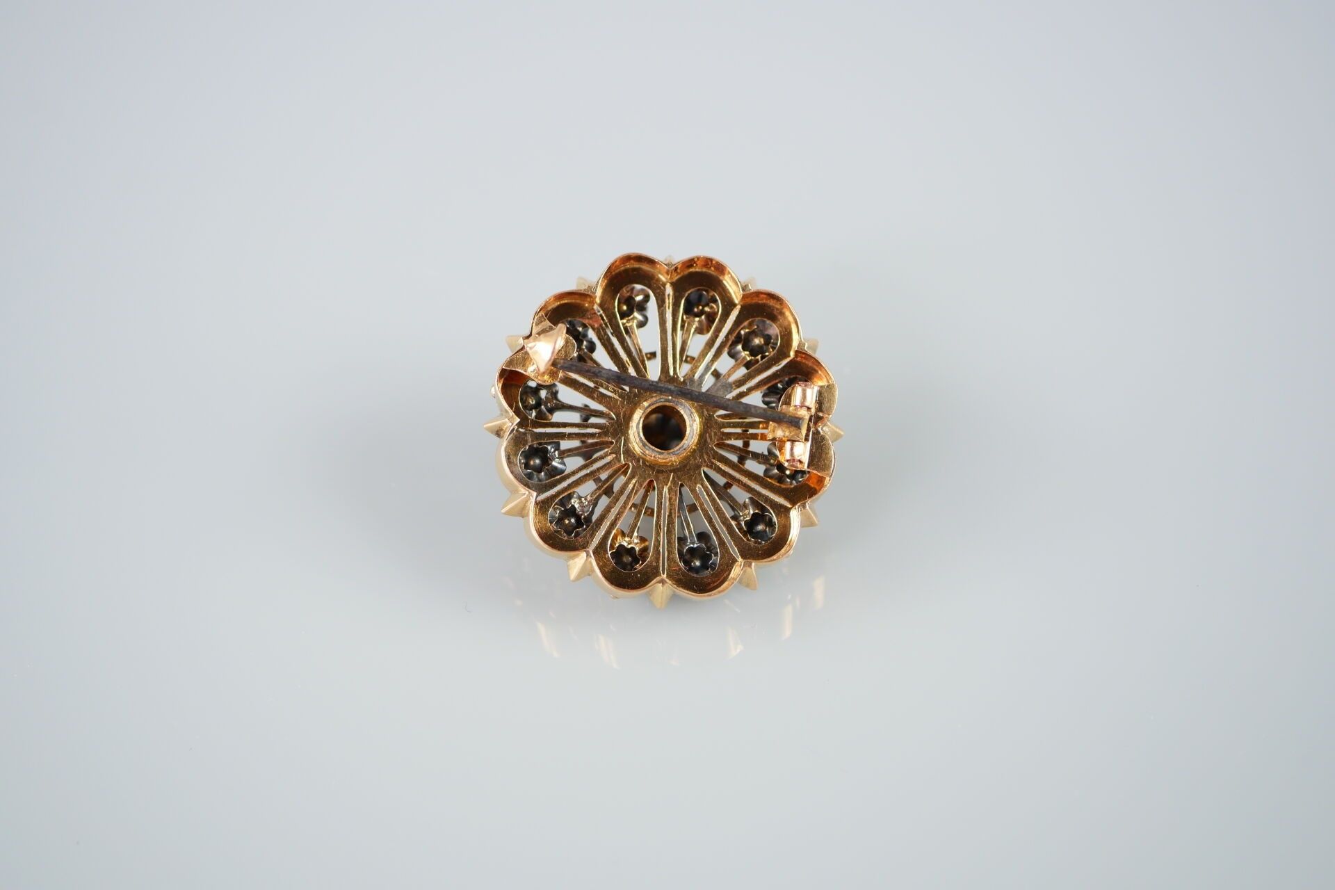 Brooch in 18K-750 thousandths yellow gold and silver set with diamonds. Metal pin.
