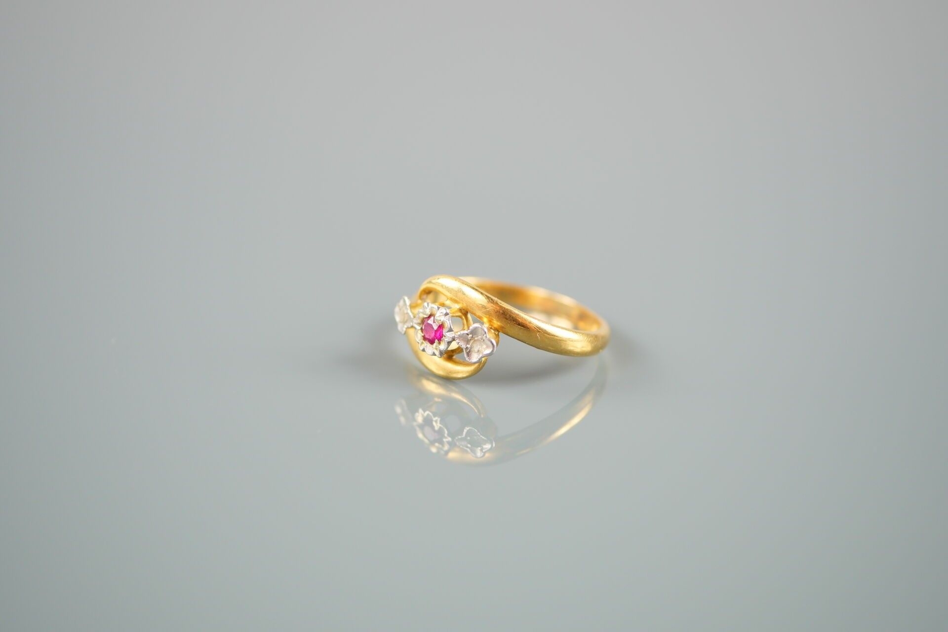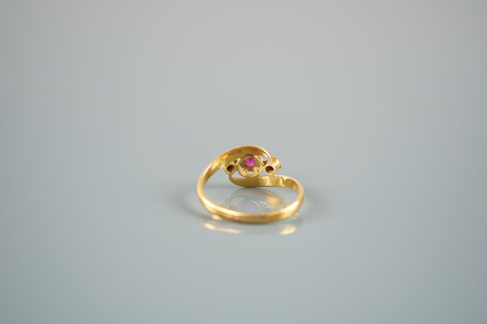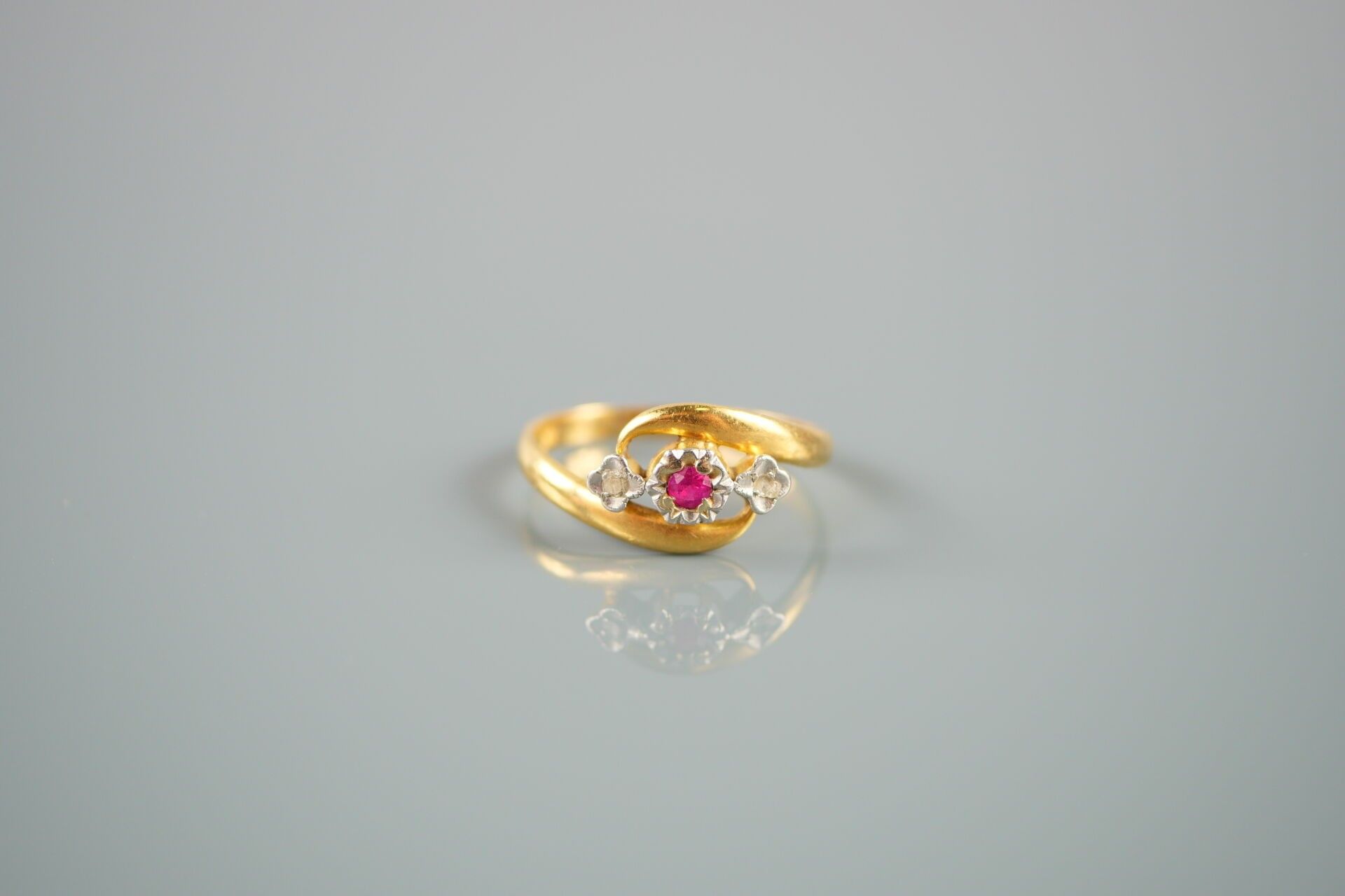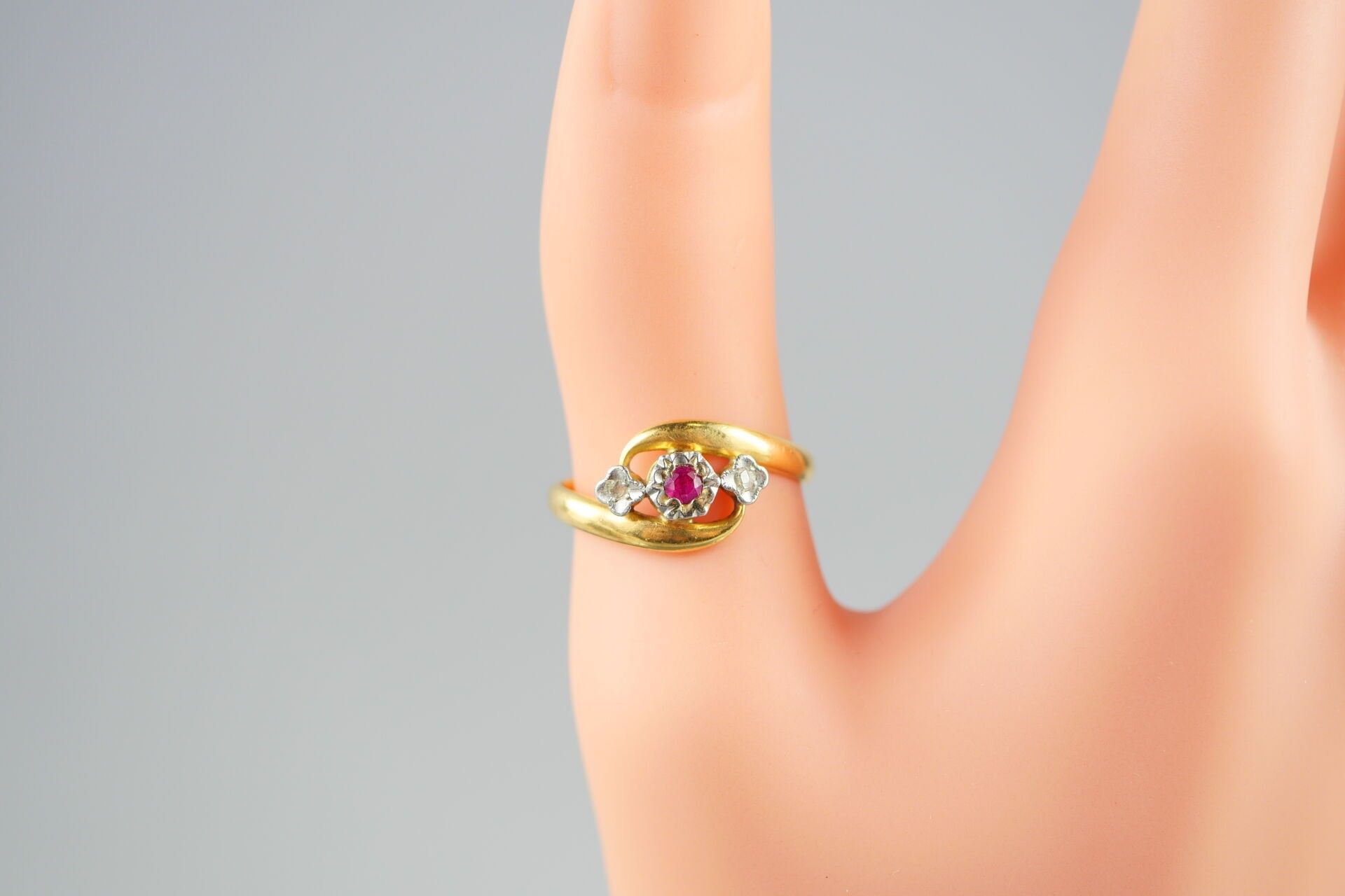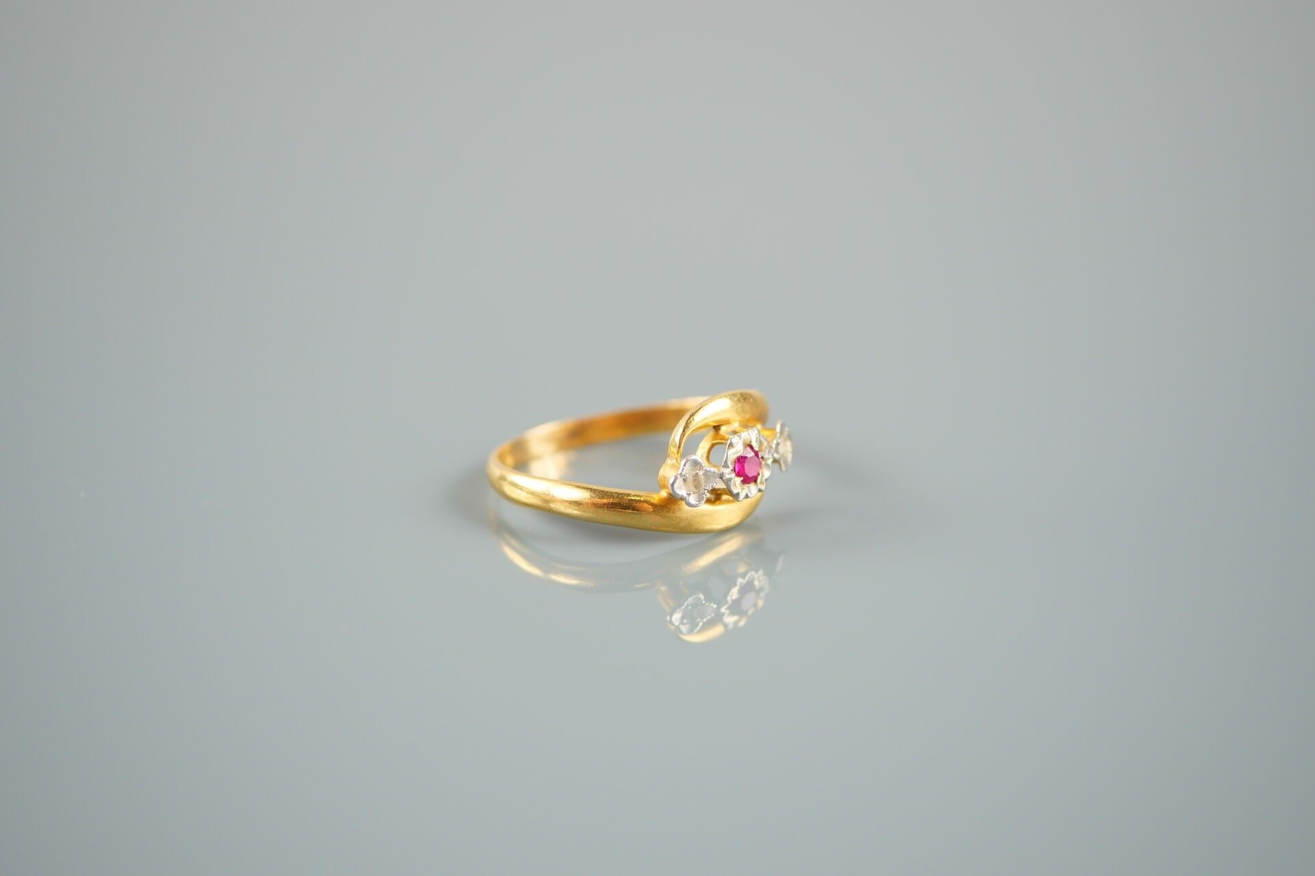 18K-750 thousandths yellow and white gold ring set with two diamond chips and a ruby or synthetic ruby.