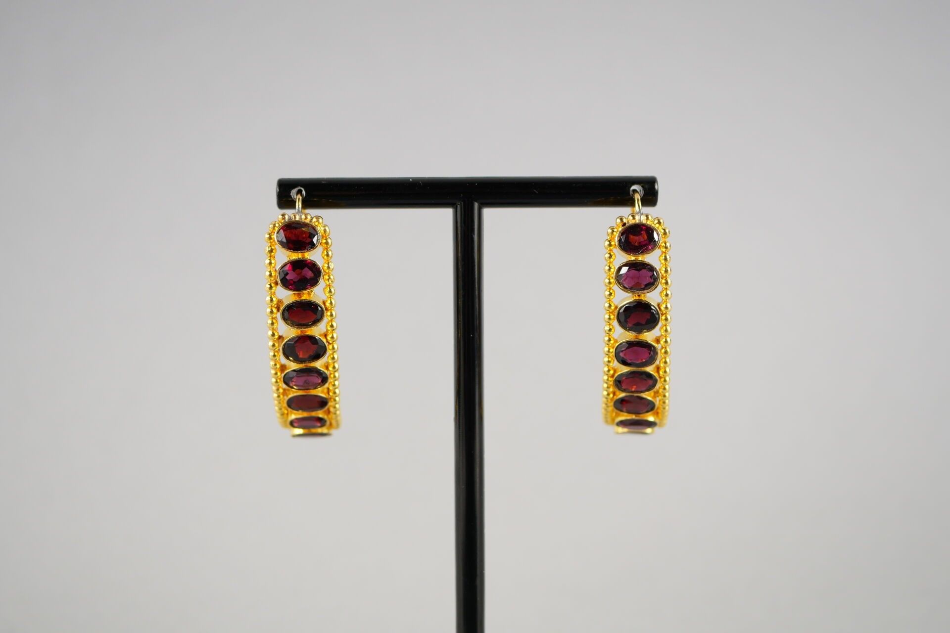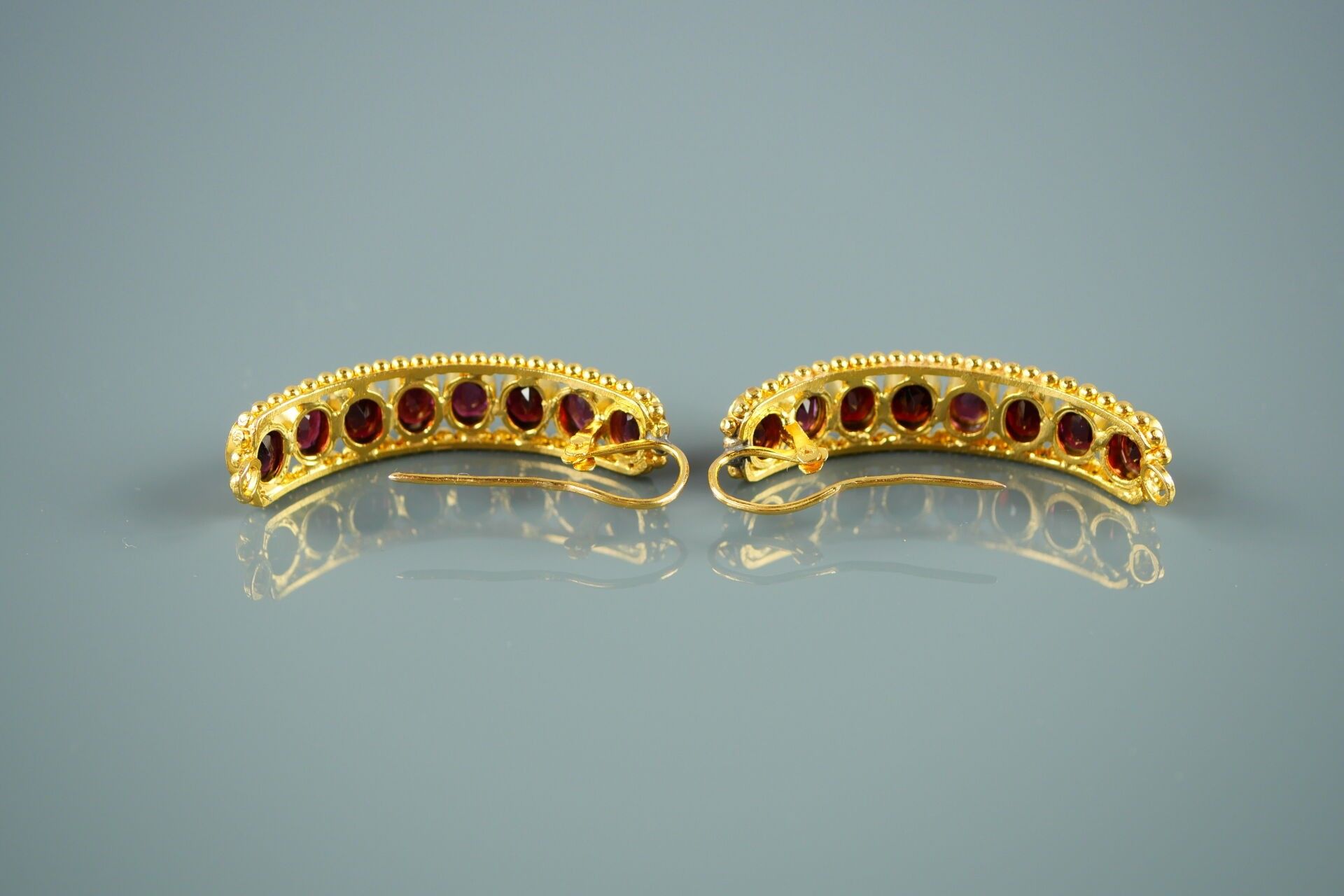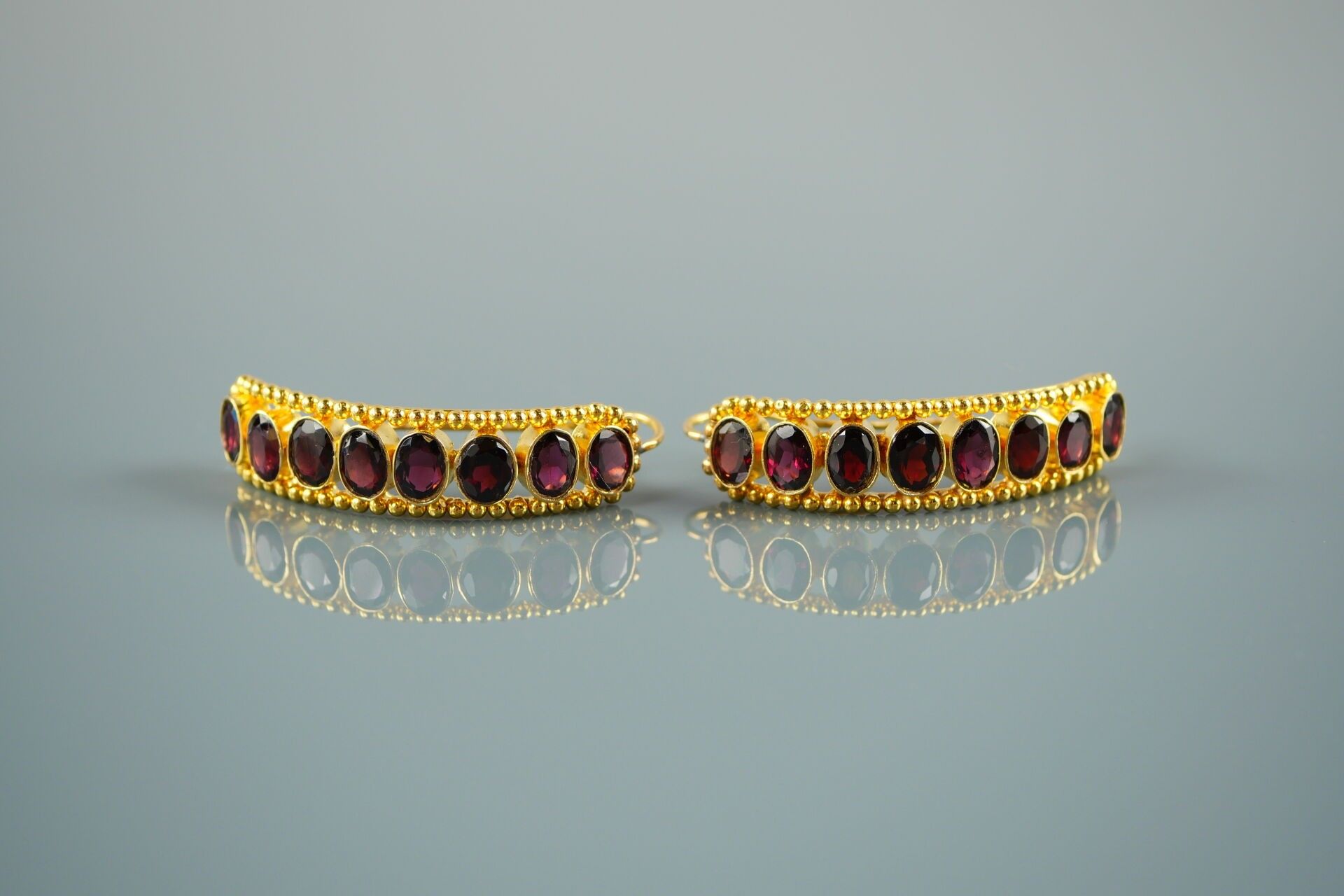 Pair of fishholes transformed into earrings in 18K-750 thousandths yellow gold set with garnets.