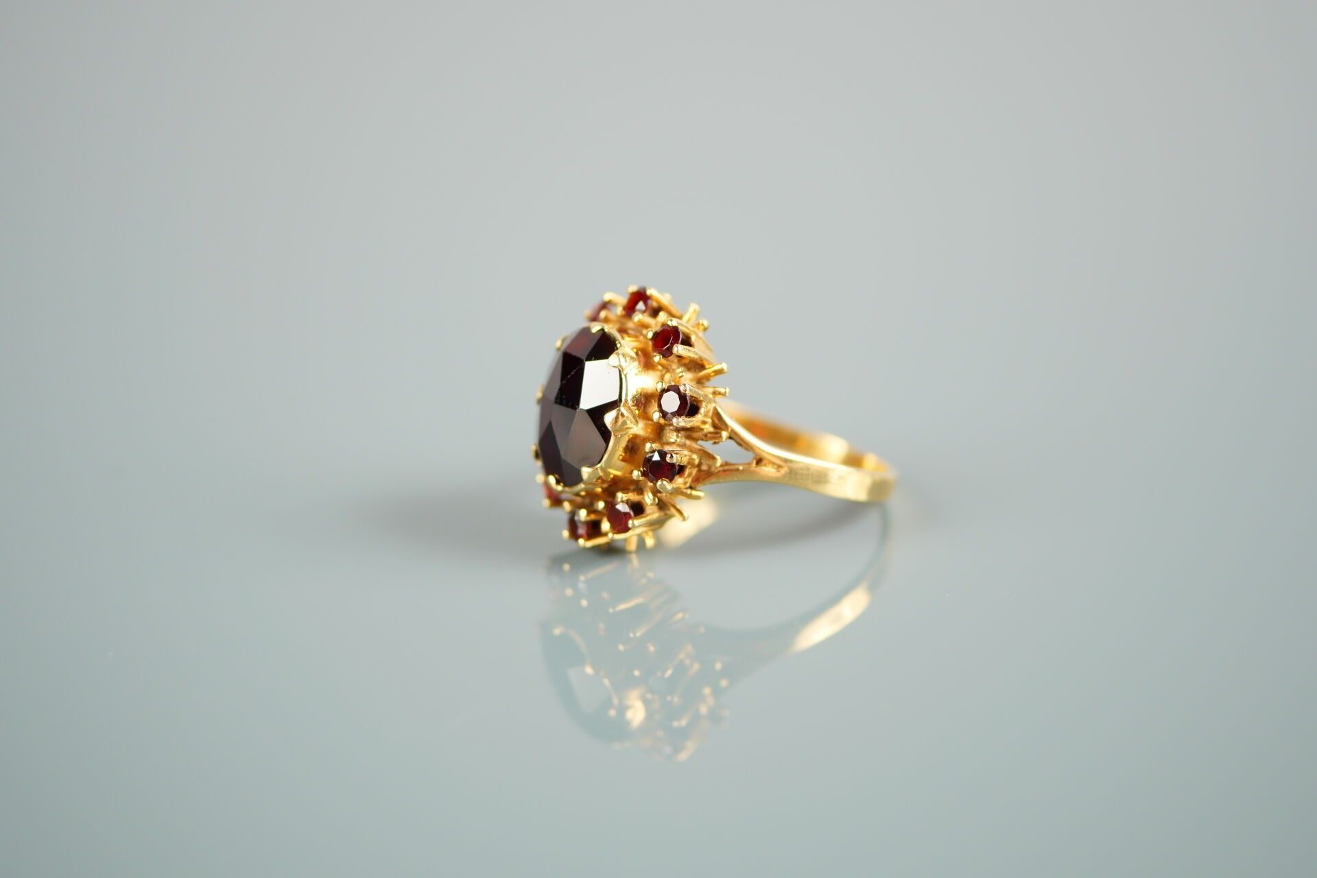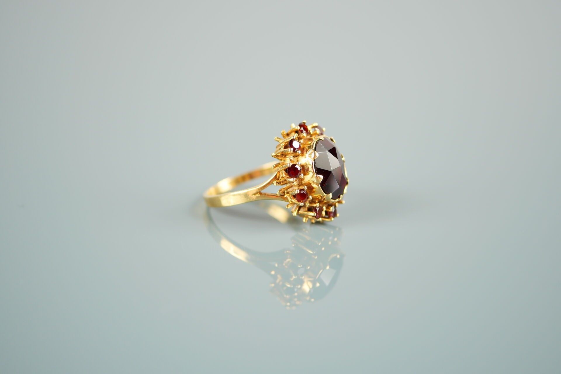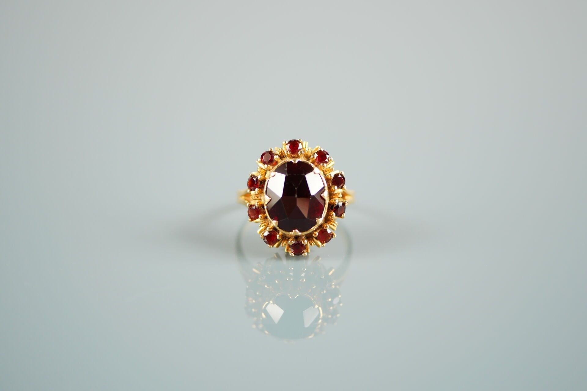 18K-750 thousandths yellow gold ring set with a garnet in a setting of 10 smaller garnets.