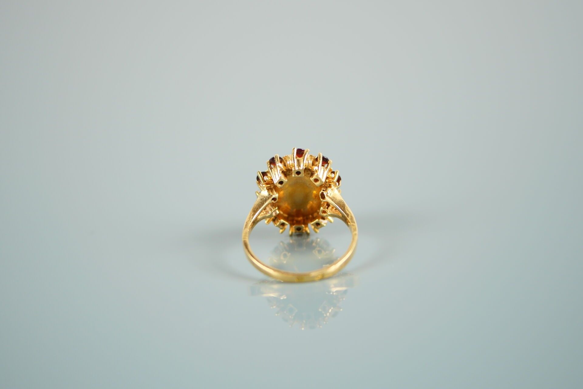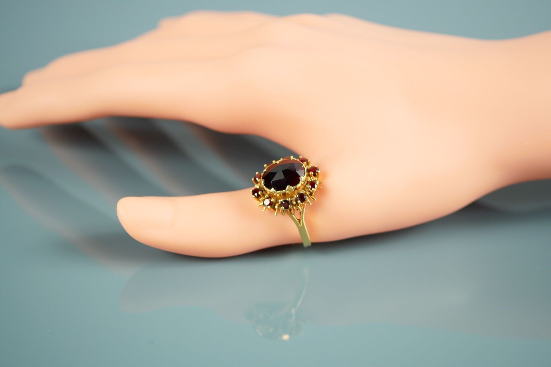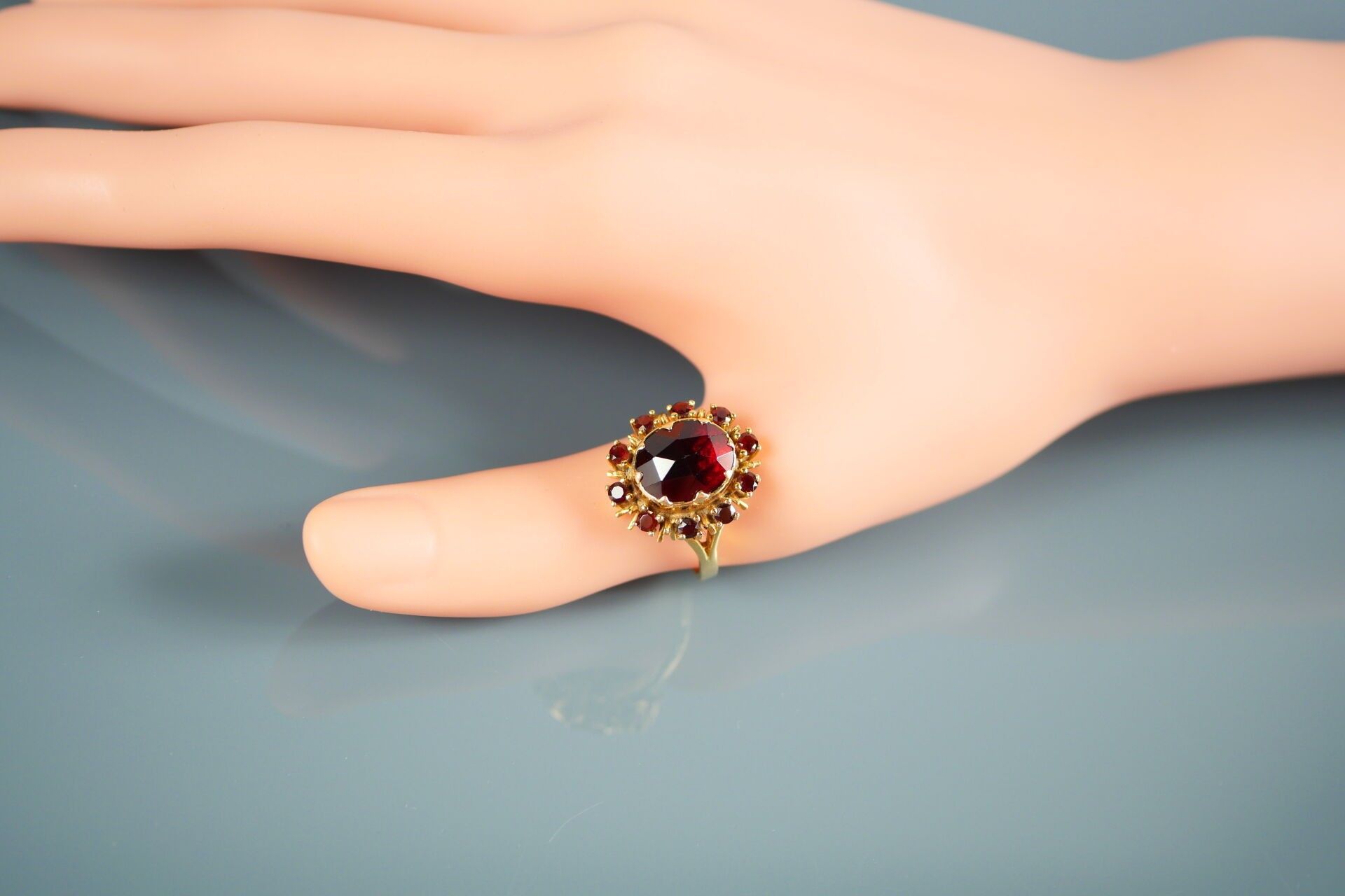18K-750 thousandths yellow gold ring set with a garnet in a setting of 10 smaller garnets.