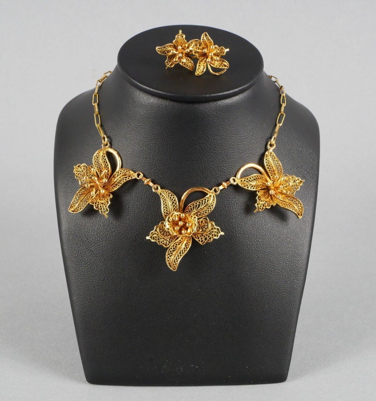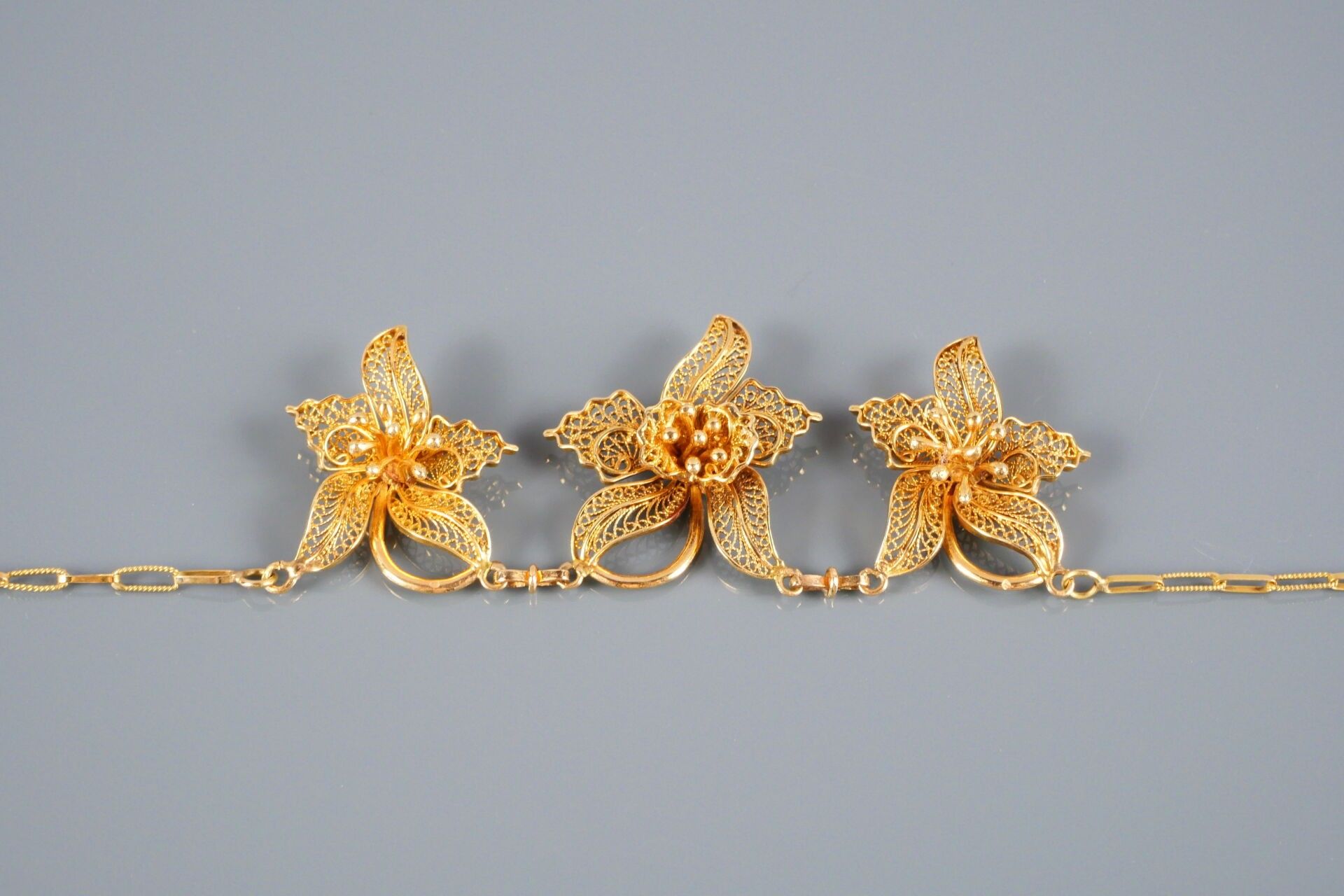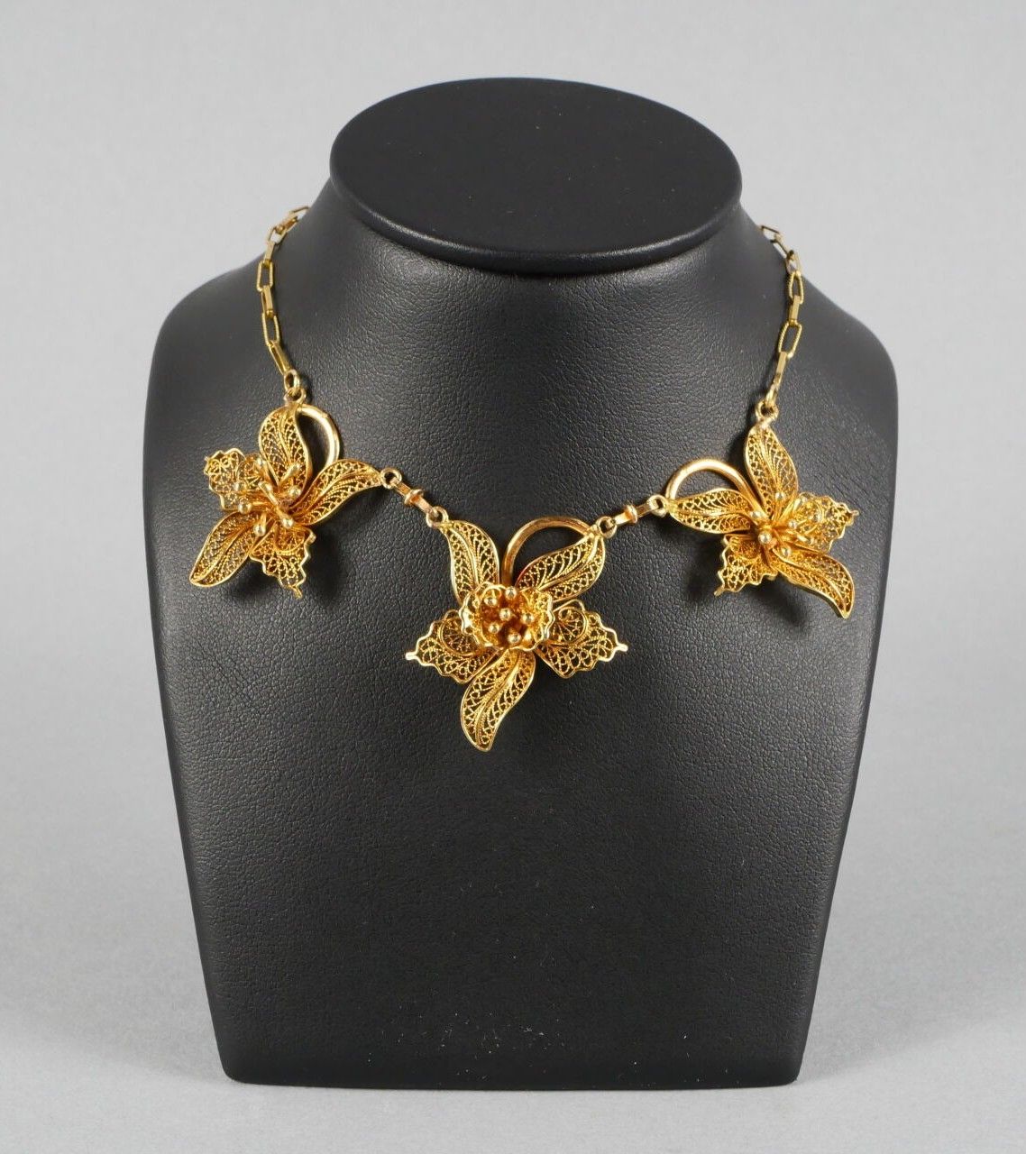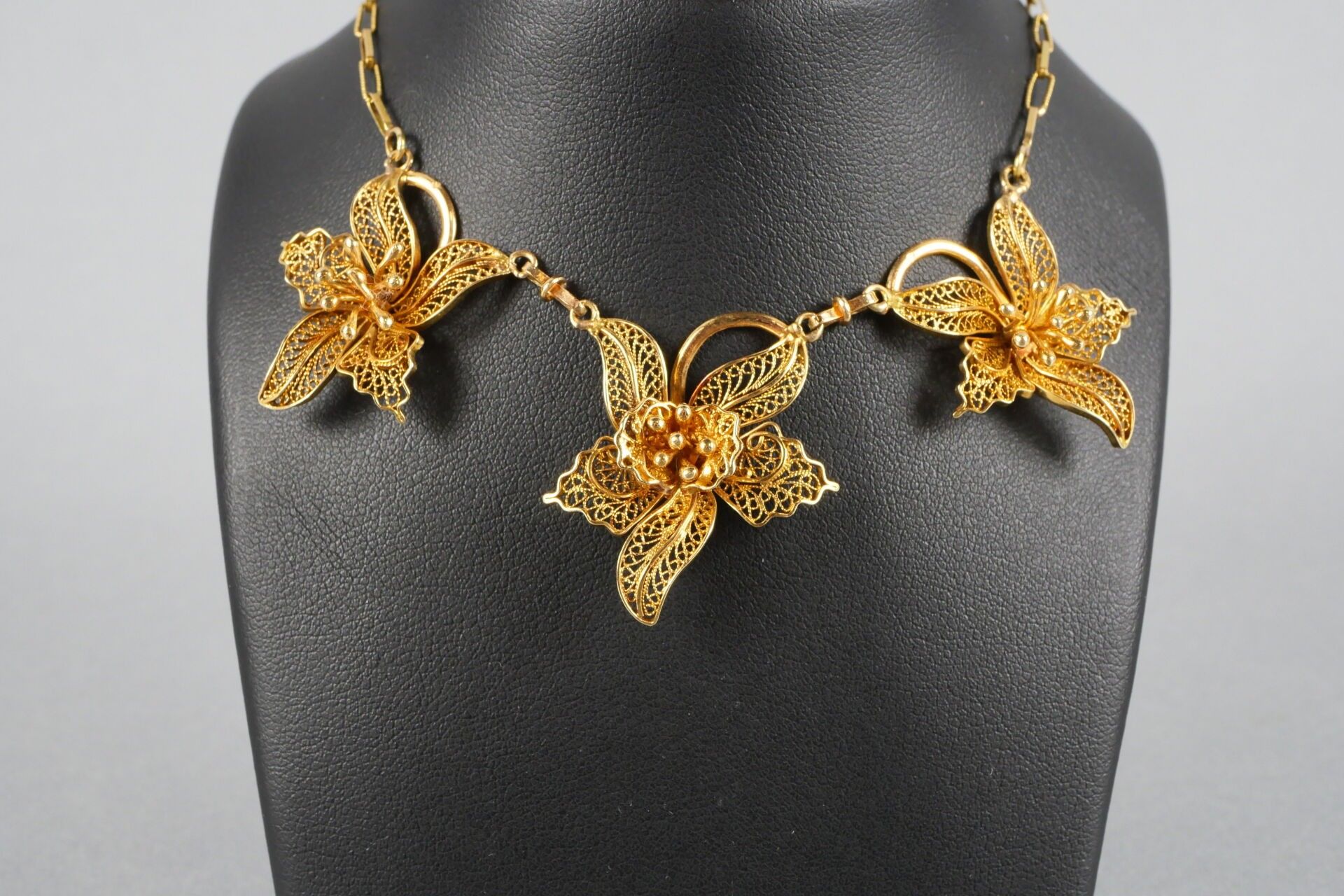 - Necklace decorated with three filigree flowers. Gold and silver clasp.