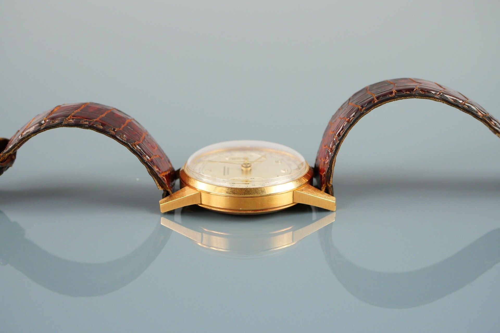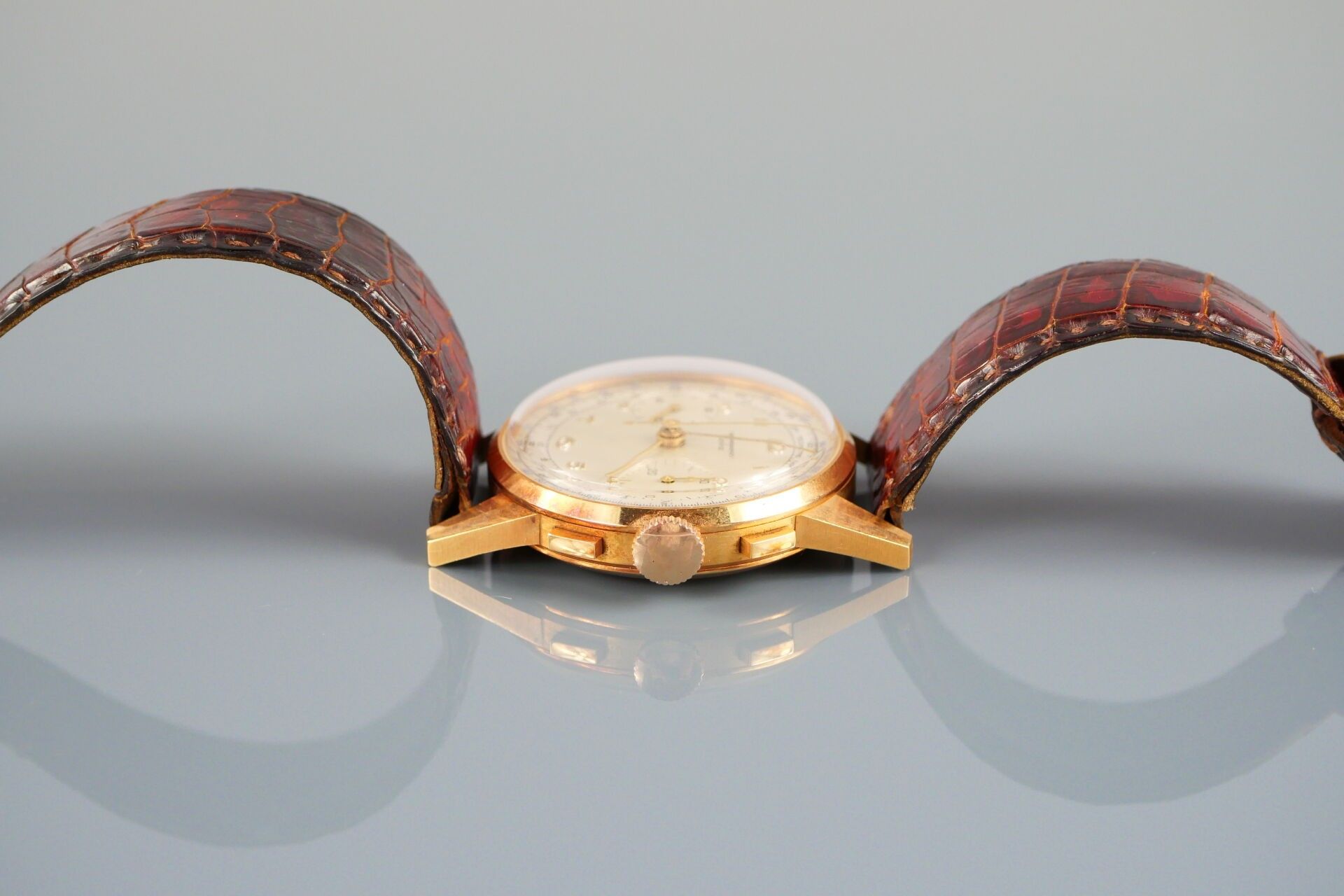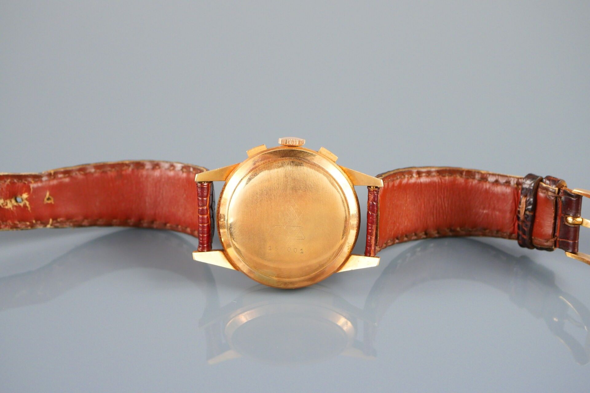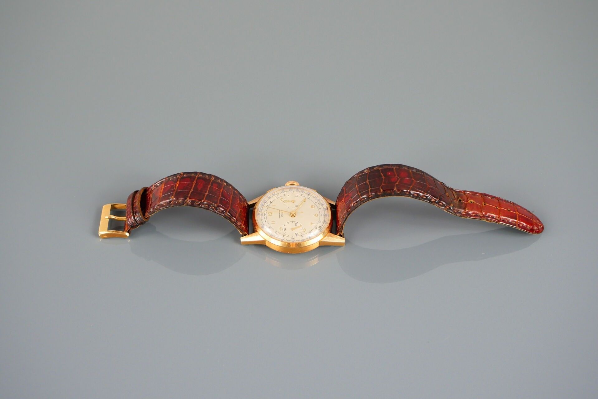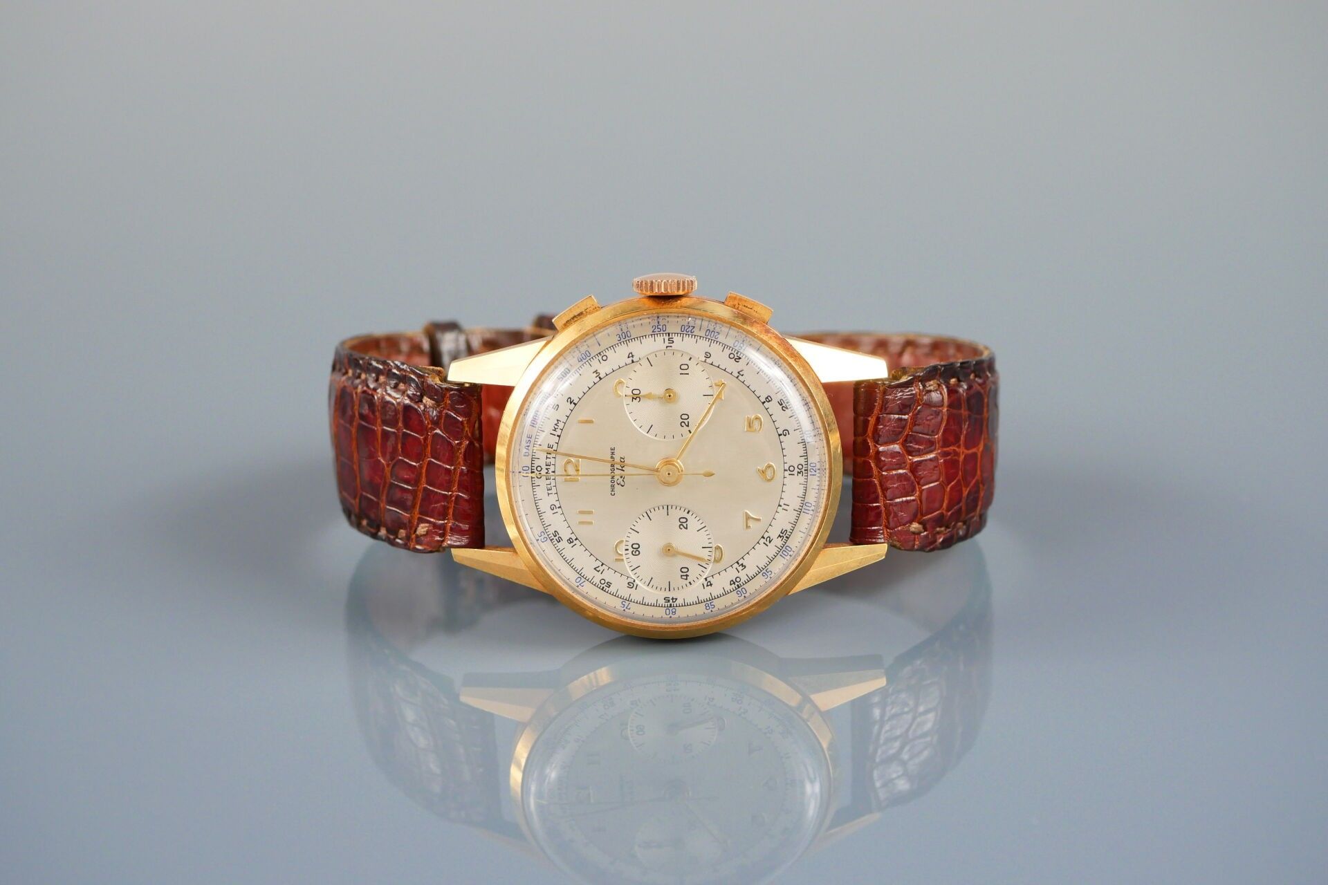 ESKA "Vintage", no. 150001 Circa 1950 Wrist chronograph in 18k (750) yellow gold Round case, clipped back, signed Opaline dial, applied Arabic numerals, 2 sub-counters for 30 minutes and seconds, telemeter and tachometer graduation, signed Mechanical movement, signed Eska Watch Co Gold pin buckle Diameter approx. 35 mm Gross weight: 50.00 g. CONDITION REPORT : Movement and chronograph function (start / stop / reset) operational at the time of catalogue writing. Good state of preservation. Case in good condition, few signs of use, a few scratches visible on the back (on the signature), slight oxidation of the gold (discoloration/chest patina). Dial well preserved, slight oxidation visible on hour markers at 5 and 6 o'clock. Eagle head hallmark inside the case back and on the buckle. Please note that all watches are sold as is. No guarantee of working order. Most watches have been opened to identify the type and quality of the movement, including water-resistant watches. The purchaser is advised to consult a watchmaker to review the water-resistance of the watch. Indications of the existence of a restoration, an accident or the state of preservation remain subject to the purchaser's personal judgement. The absence of any indication of replacement parts, restoration or accident in no way implies that an item is free of all present defects. All items shown may have been previously serviced and may contain non-original parts. The dimensions and weights of the items are approximate. --- ADER WATCHES PARIS, Expert in Collector's Watches and Clocks Information : [email protected] --- All lots in the sale are sold by designation. The lots are neither held at the firm nor present at the sale. Collection by appointment only during opening hours. Our auction house does not send consignments. Shipment possible via MBE Marseille, The Packengers or a carrier of your choice.