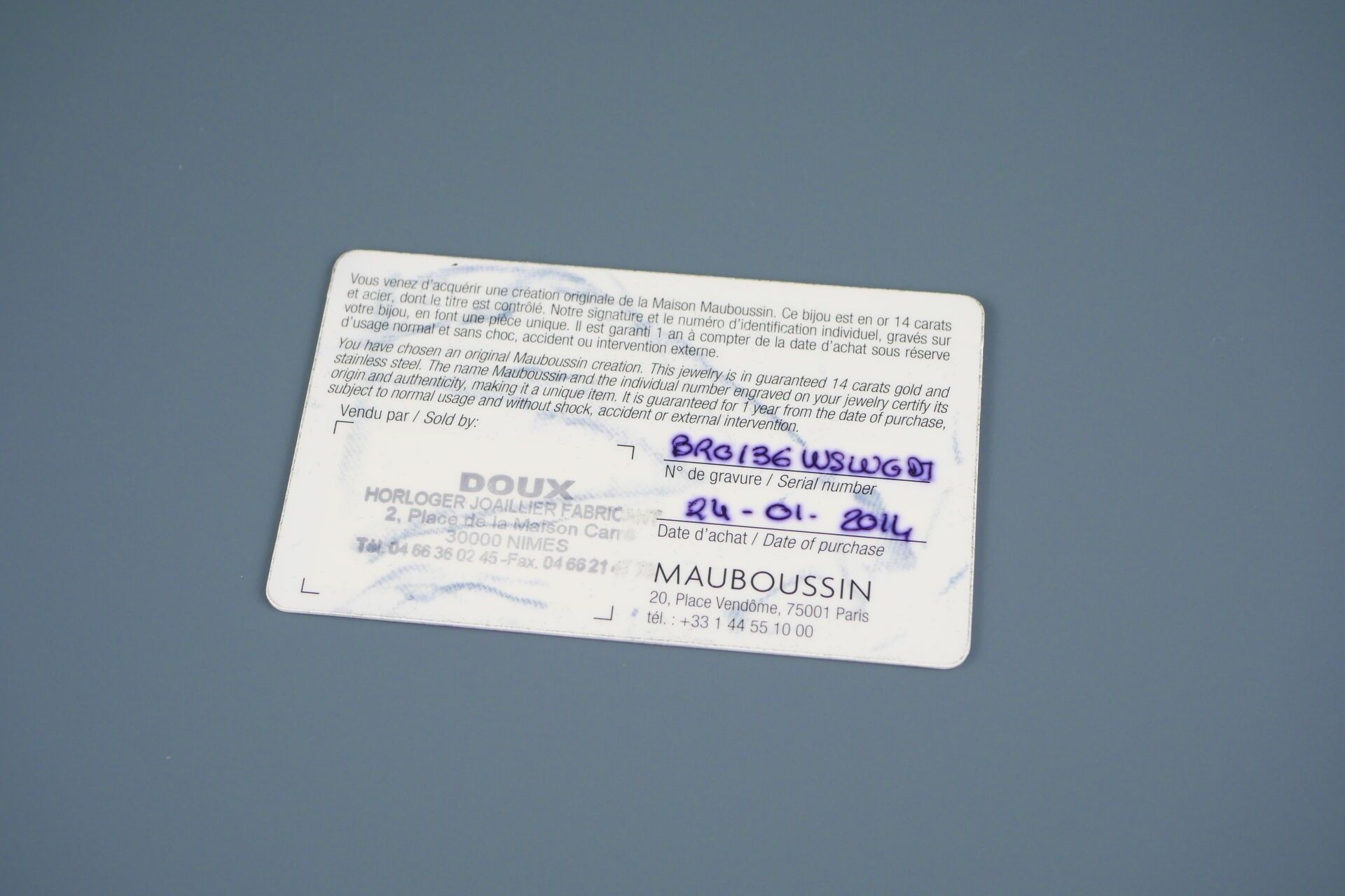 With a guarantee card dated 24.01.2014 (purchased from the jeweller Doux in Nîmes)