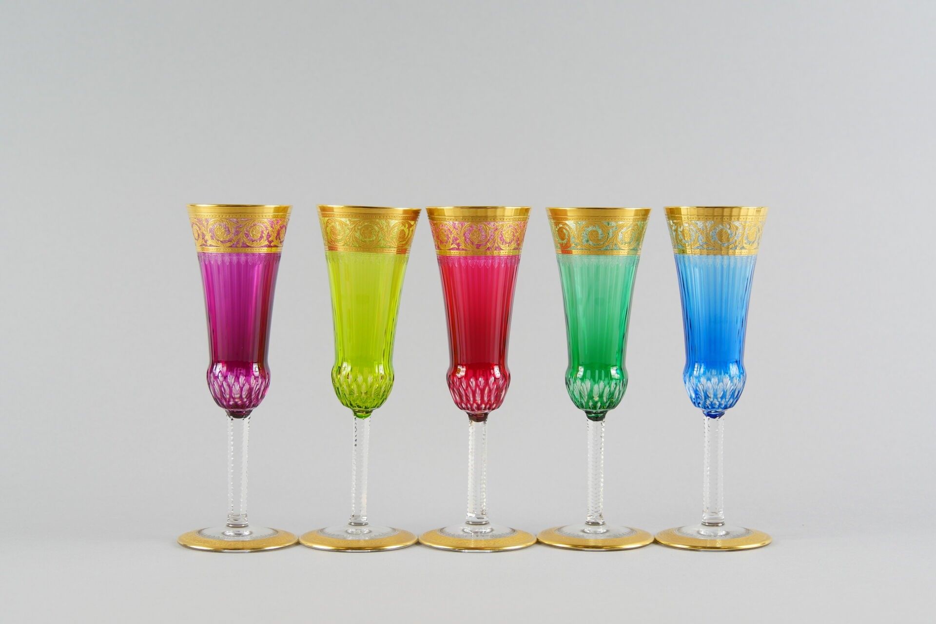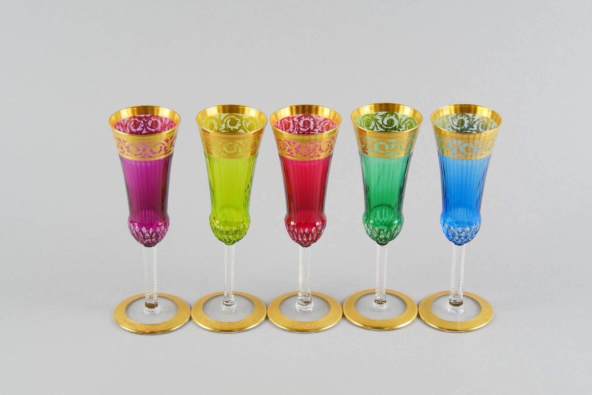 SAINT-LOUIS. Thistle model. 5 Champagne flutes in coloured c…