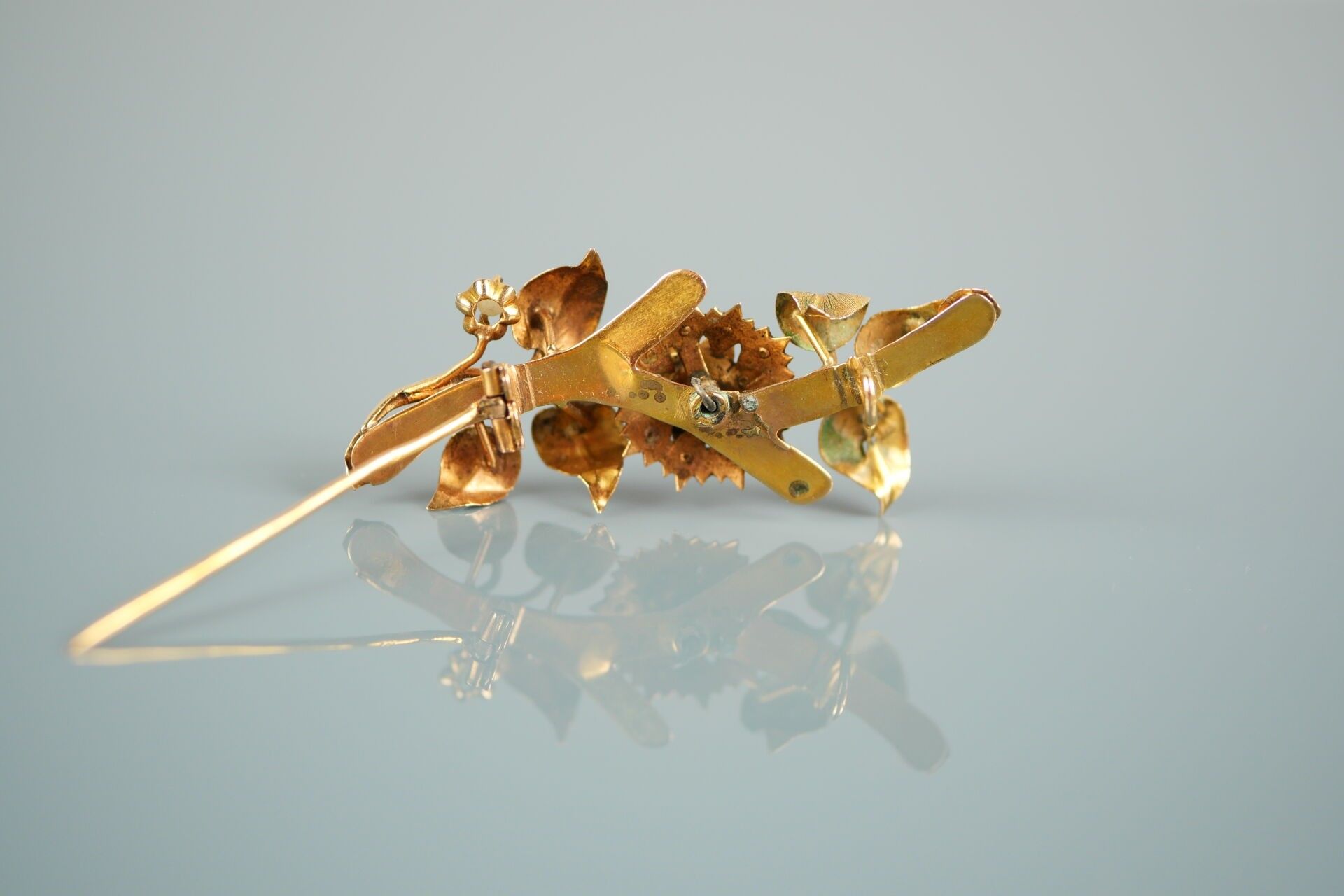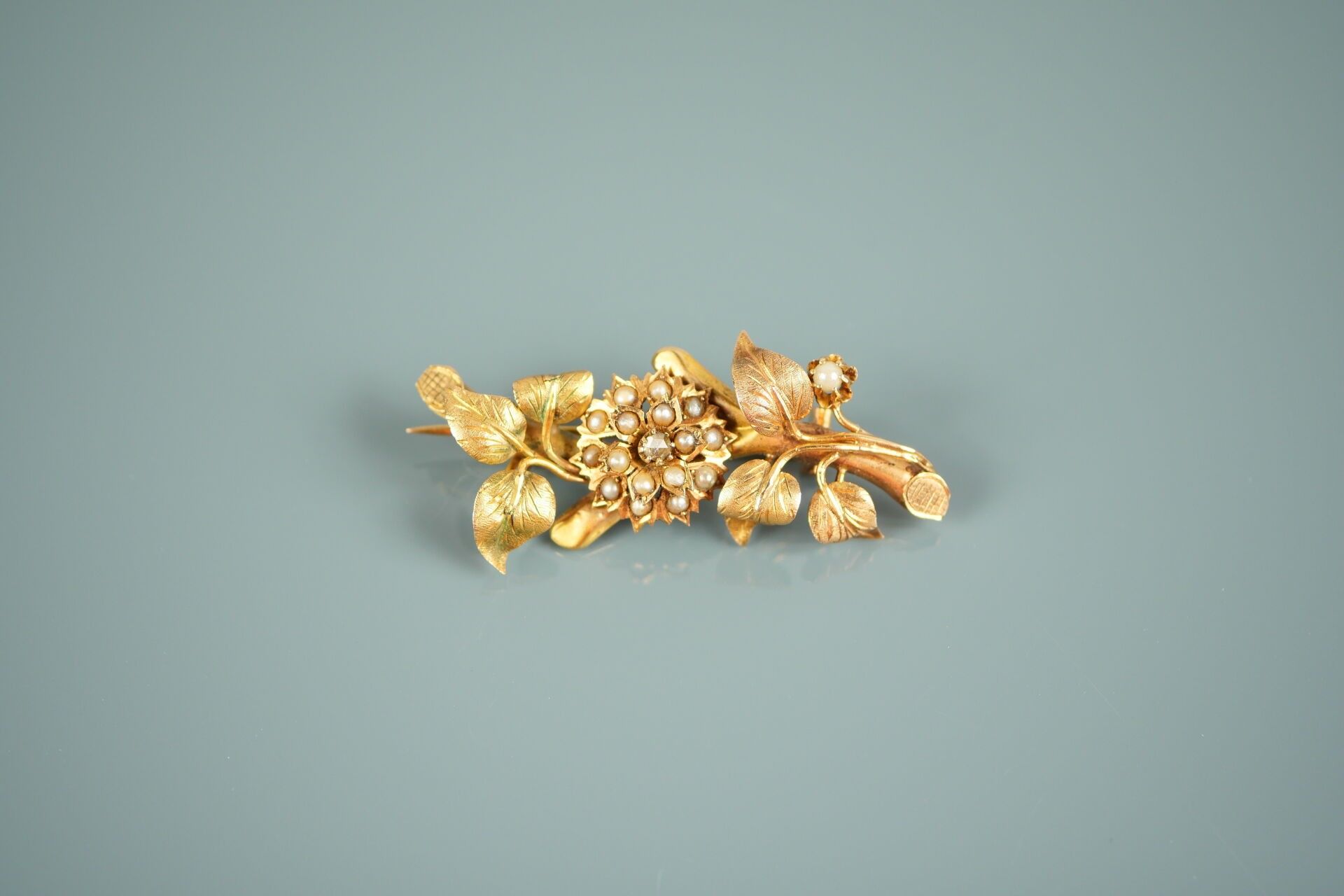 18K-750 thousandths yellow gold brooch set with a small rose-cut diamond in a surround of small pearls. Rotating central motif.