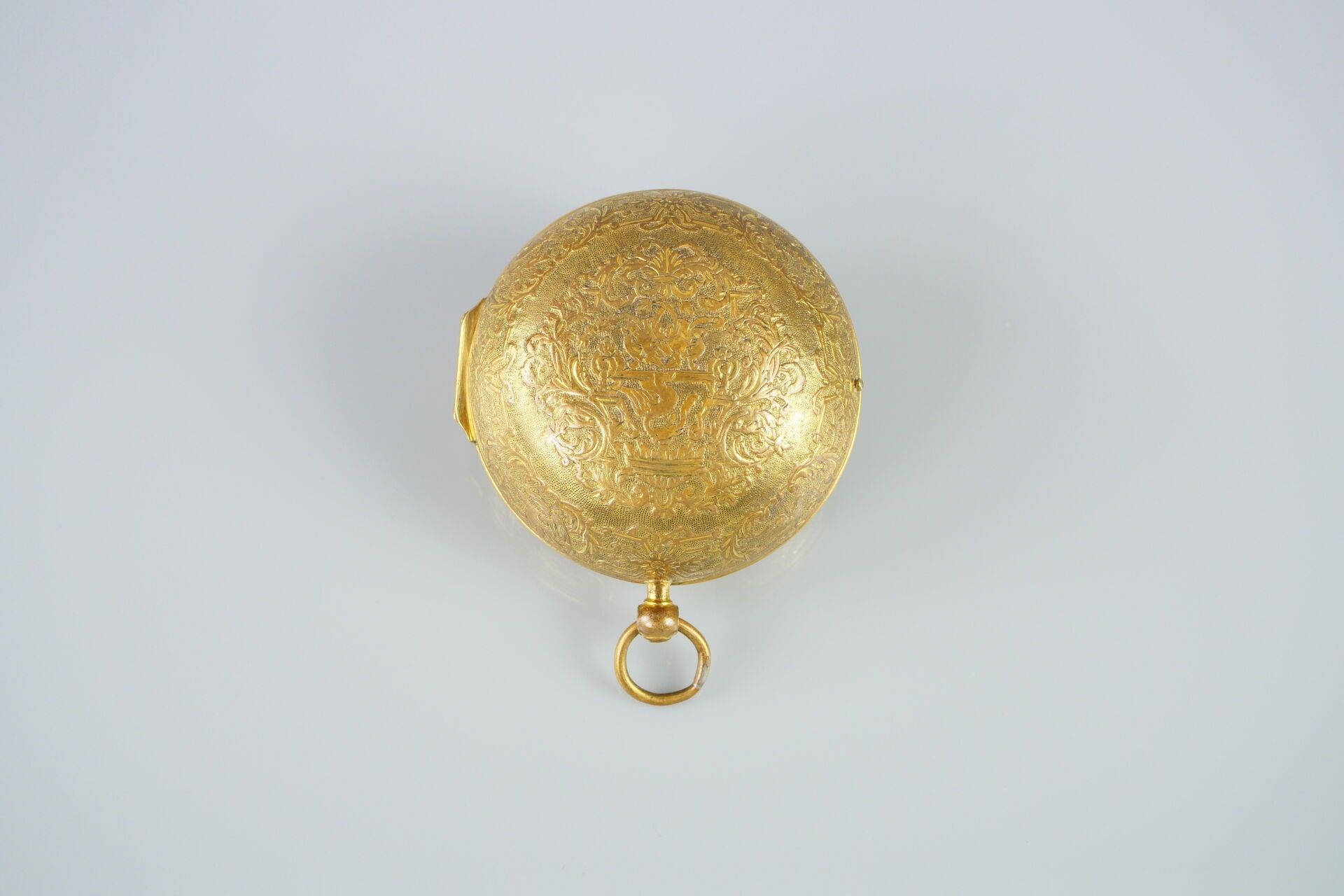 Round case, hinged opening, the back decorated with a motif depicting a chimera with an umbrella