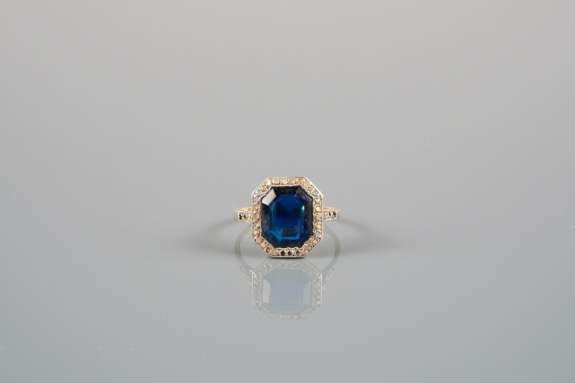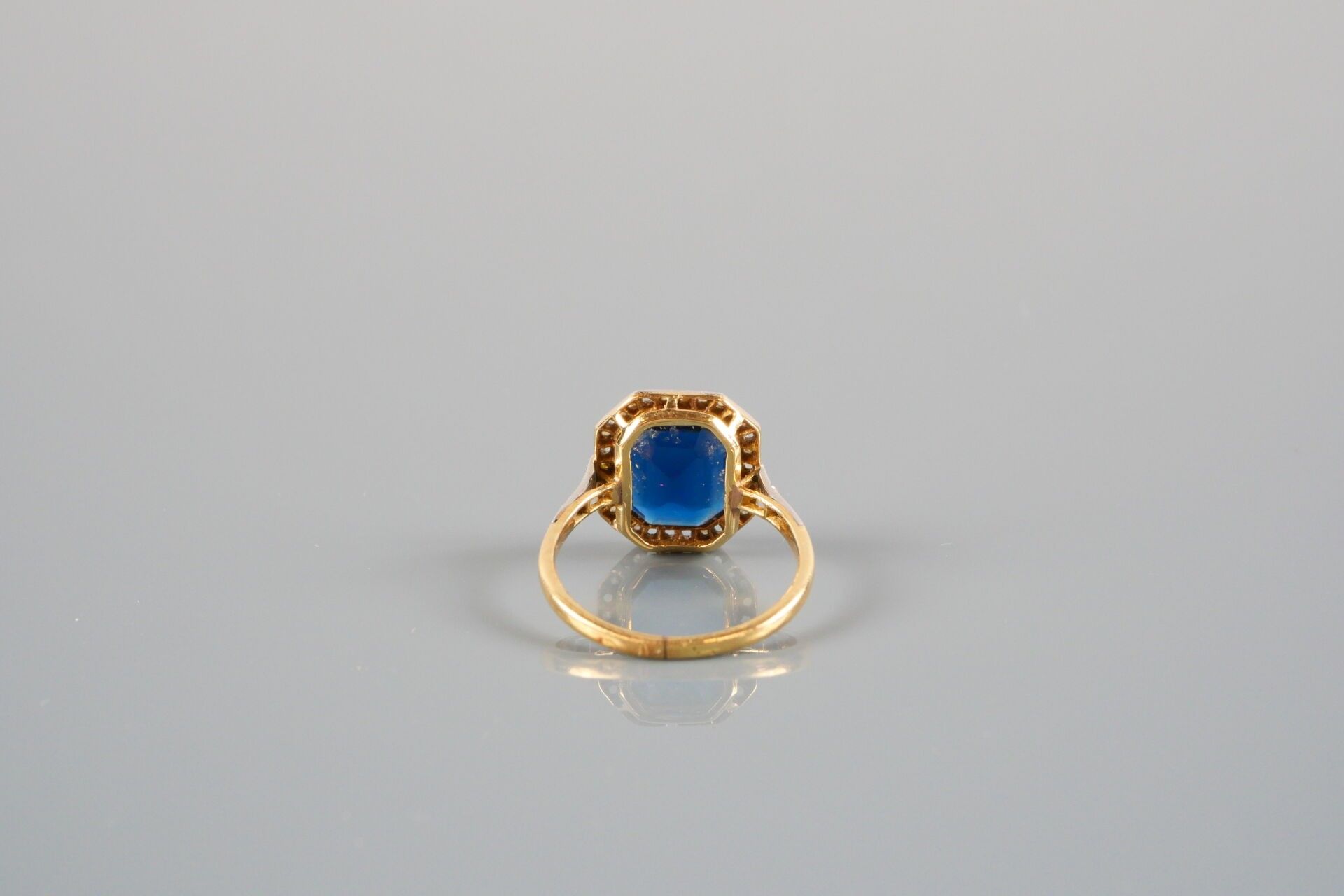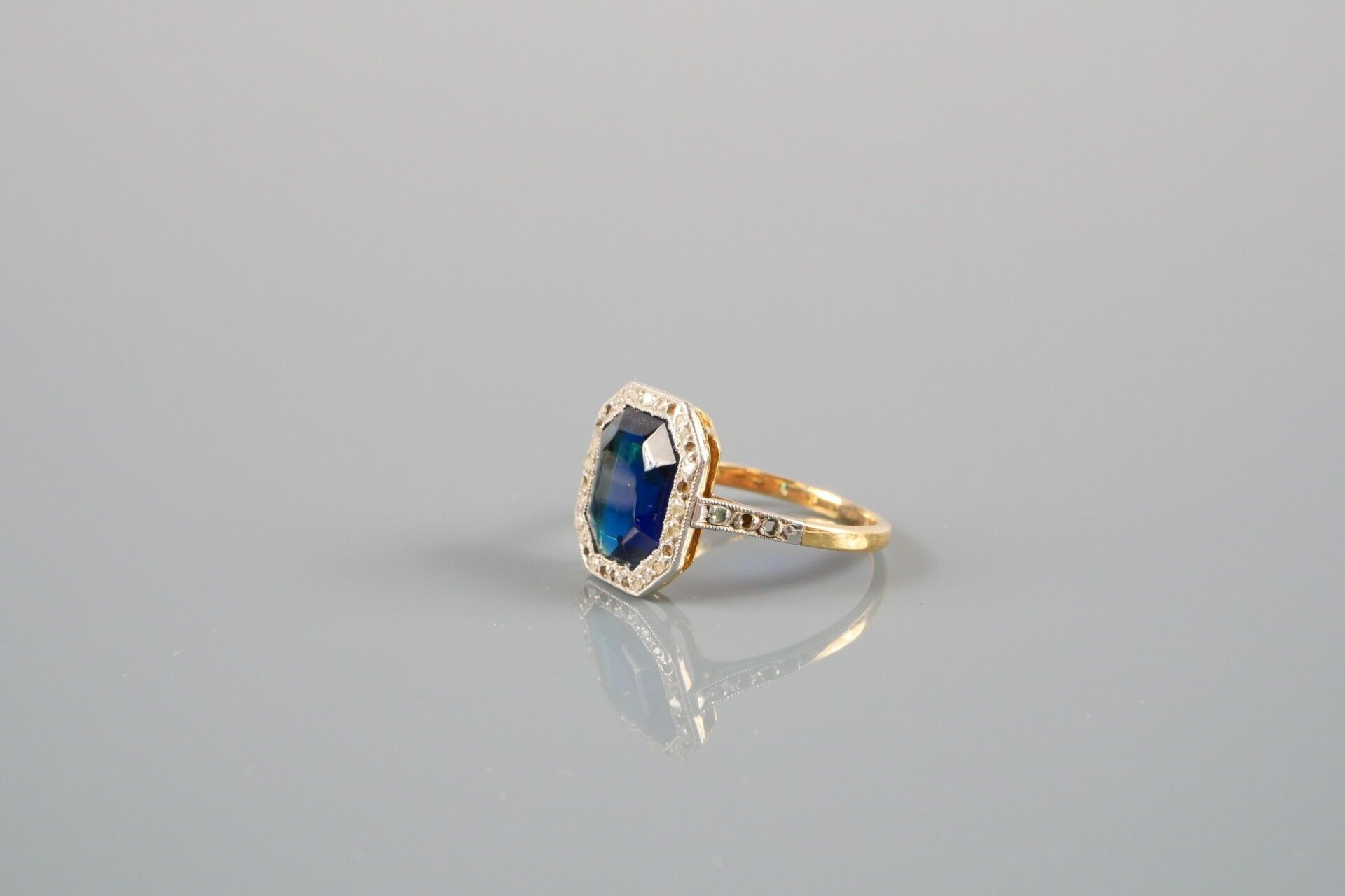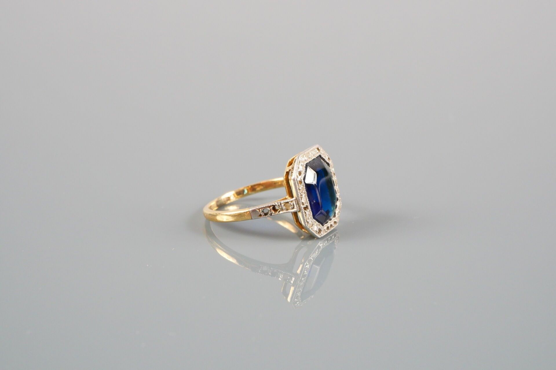 18K-750 thousandths gold and platinum ring set with a blue glass bead in a surround of small stones, including a diamond.