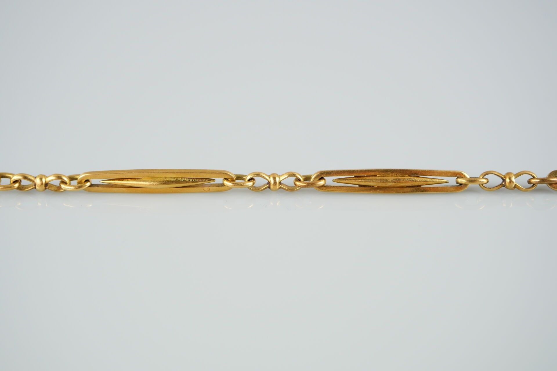 - 18k-750 thousandths yellow gold watch chain. Two metal clasps at either end.