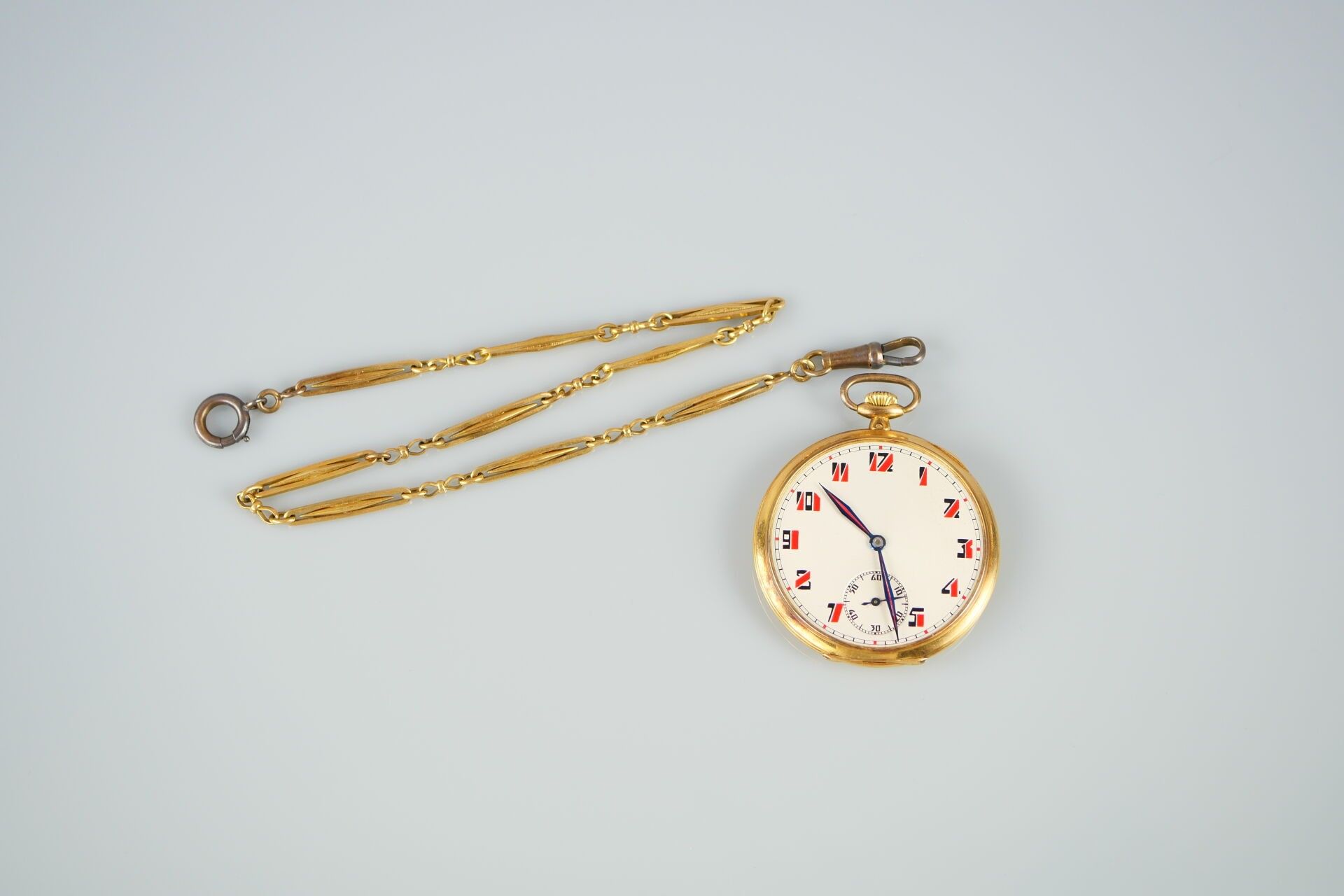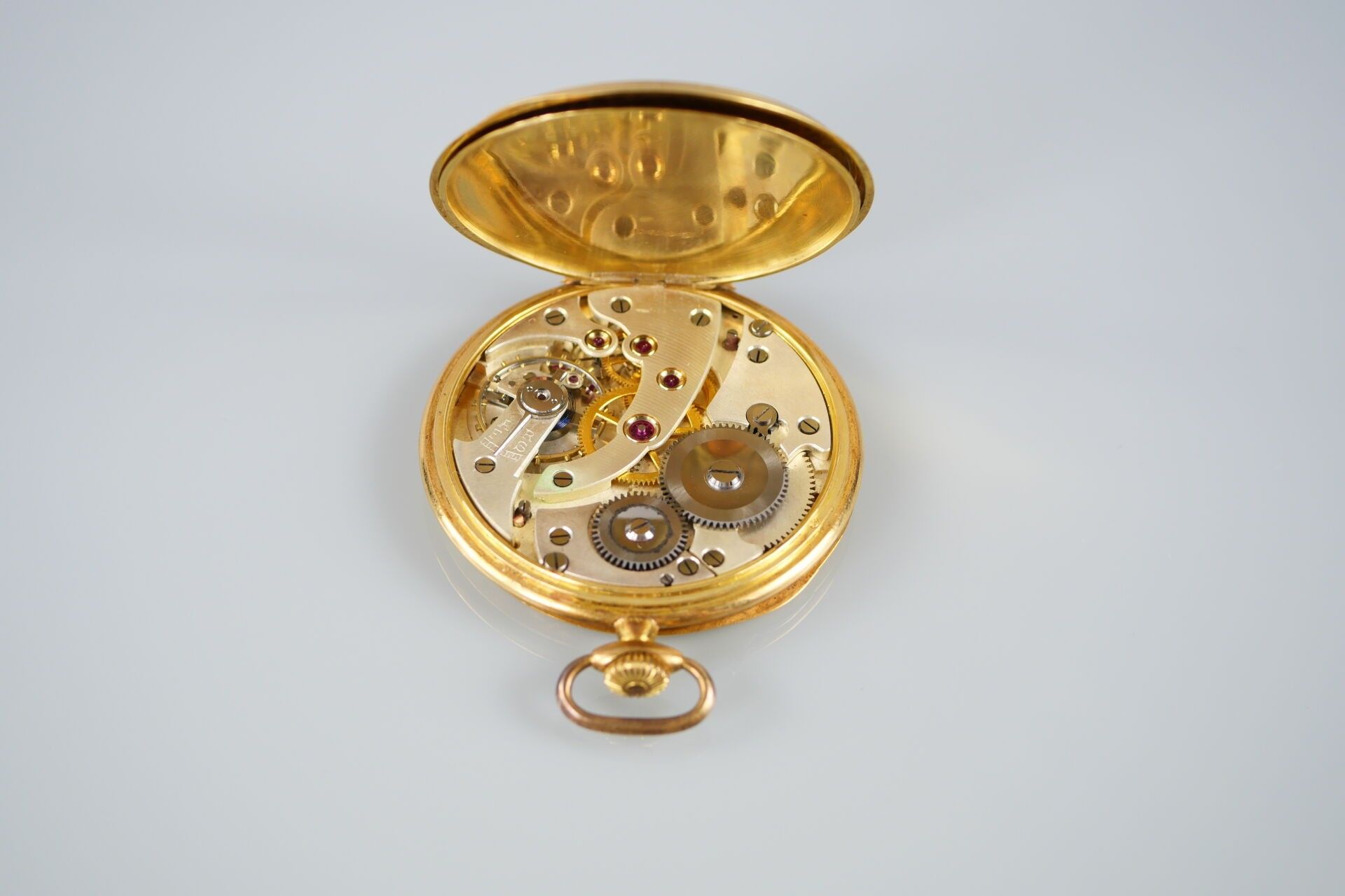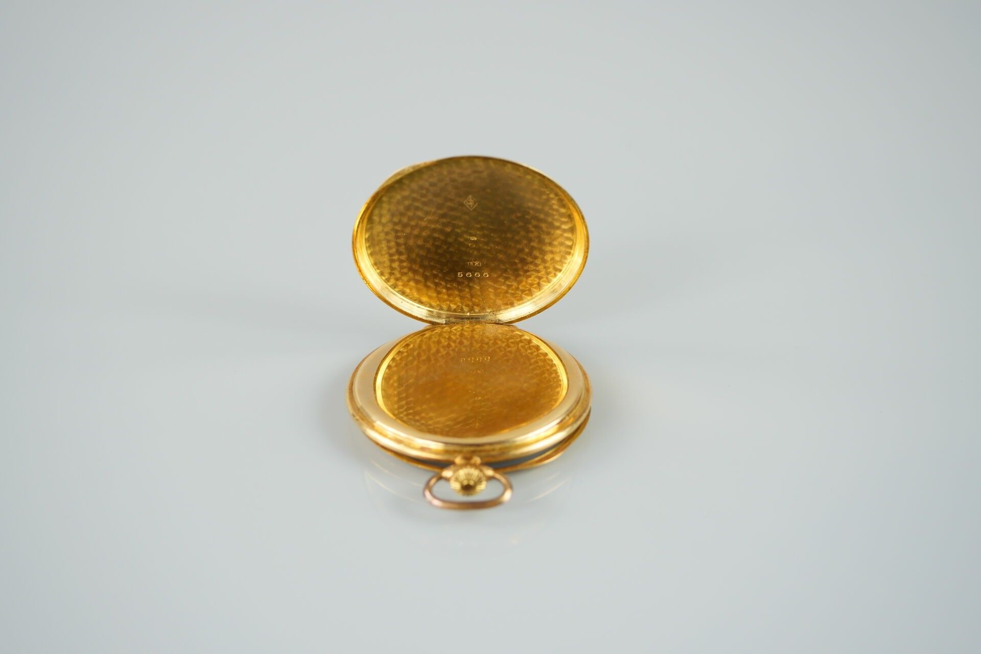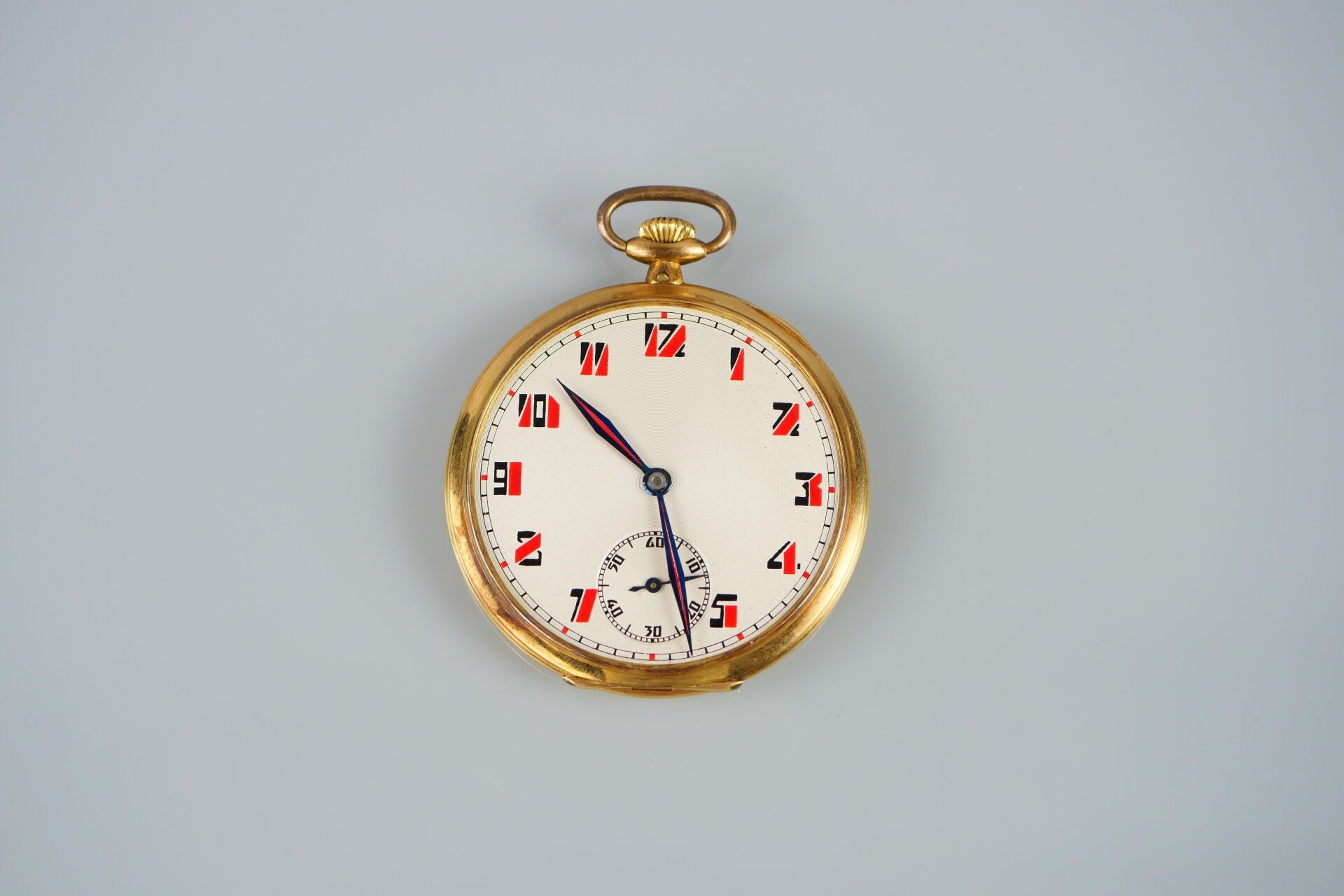 - 18K-750 thousandths yellow gold case and bowl pocket watch. Metal dial with stylised hour markers in Arabic numerals.