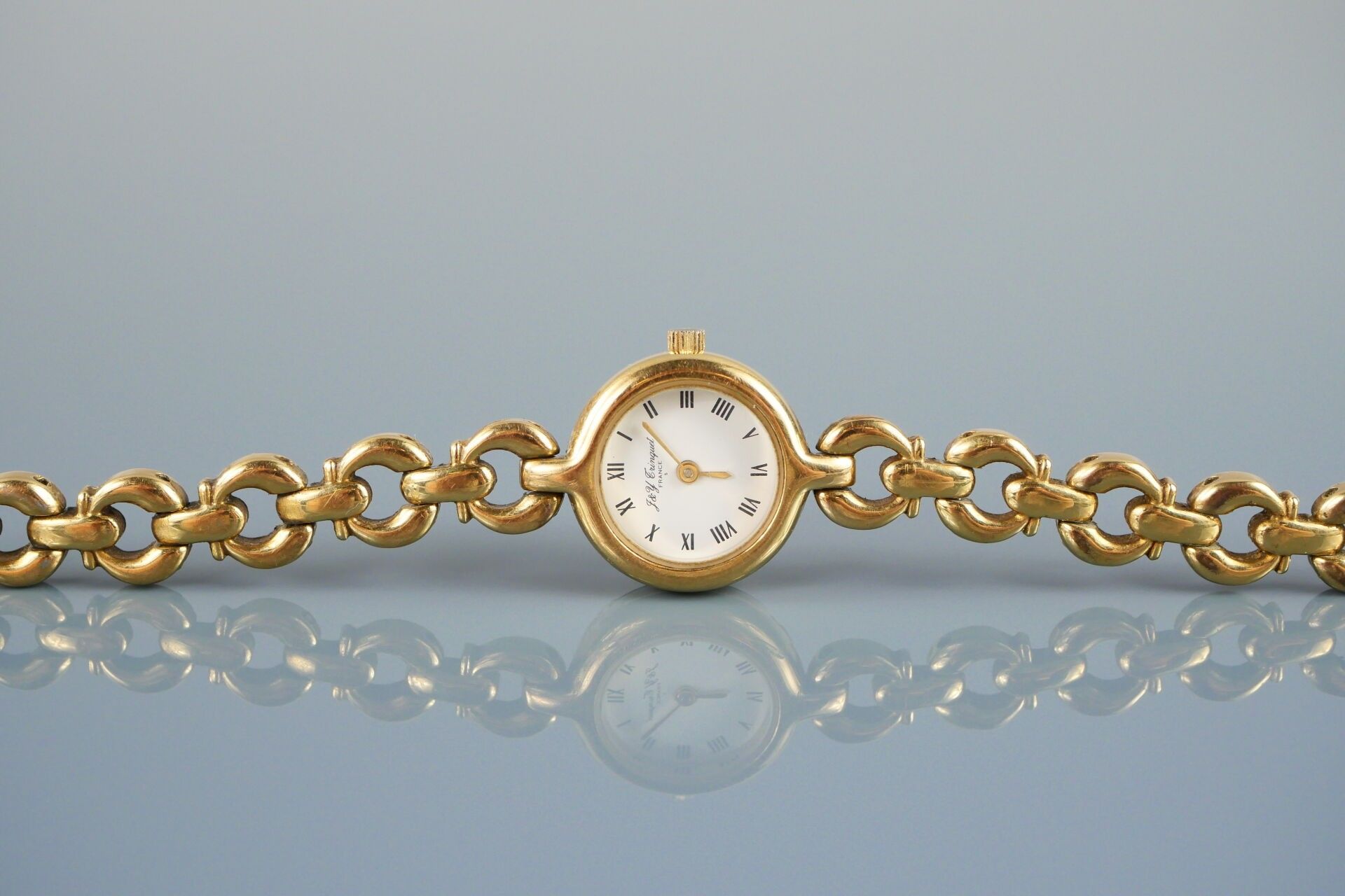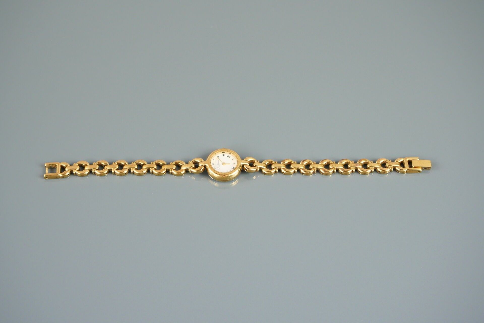 Attached is a steel and gilt metal wristwatch with quartz movement signed "J & Y Trinquet" (battery to be replaced).