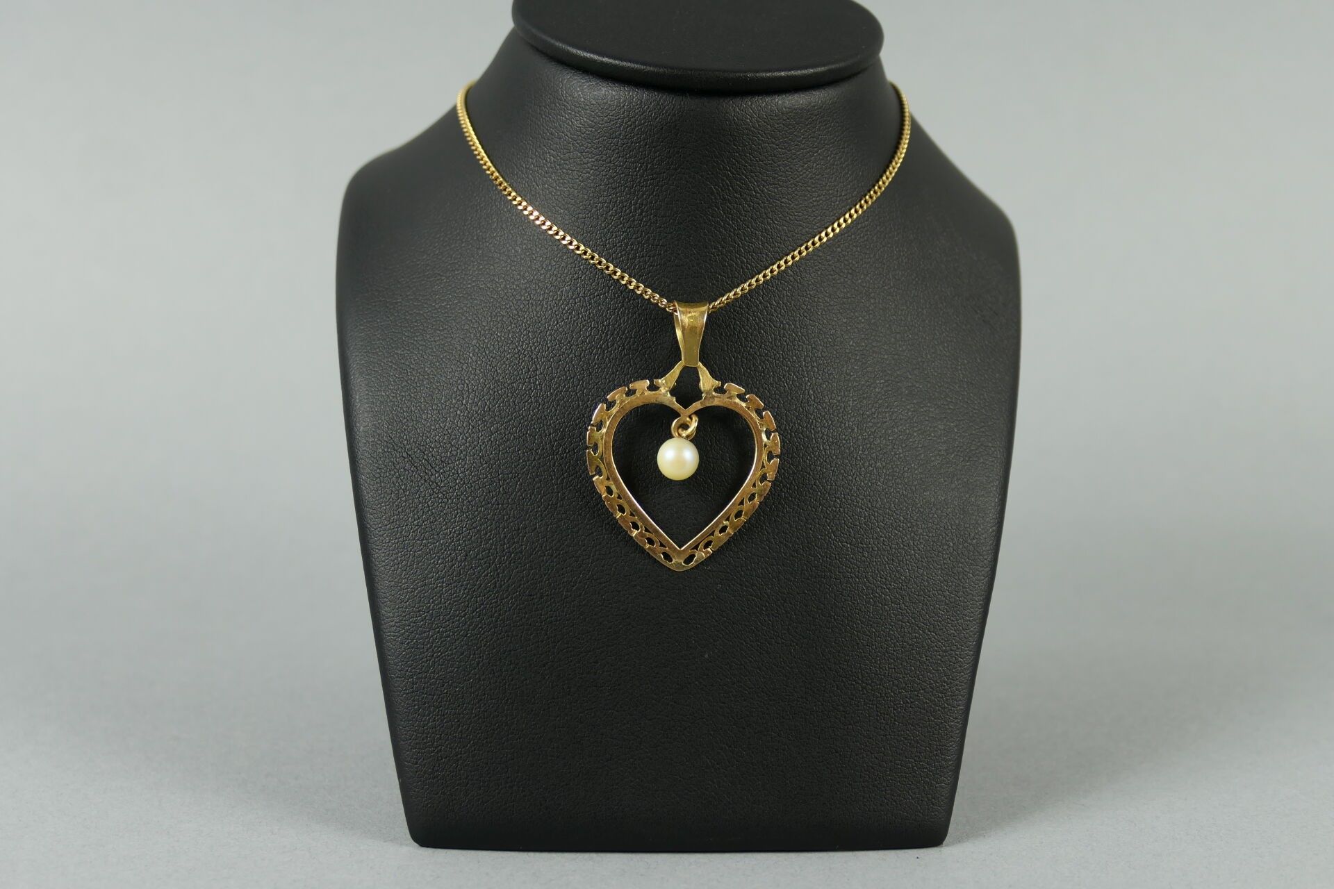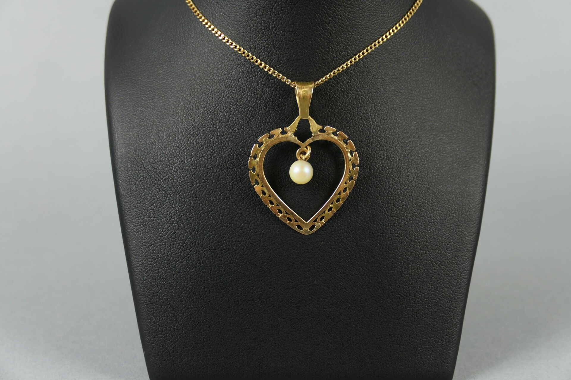 Heart pendant in 750 thousandths yellow gold set with a dangling pearl.