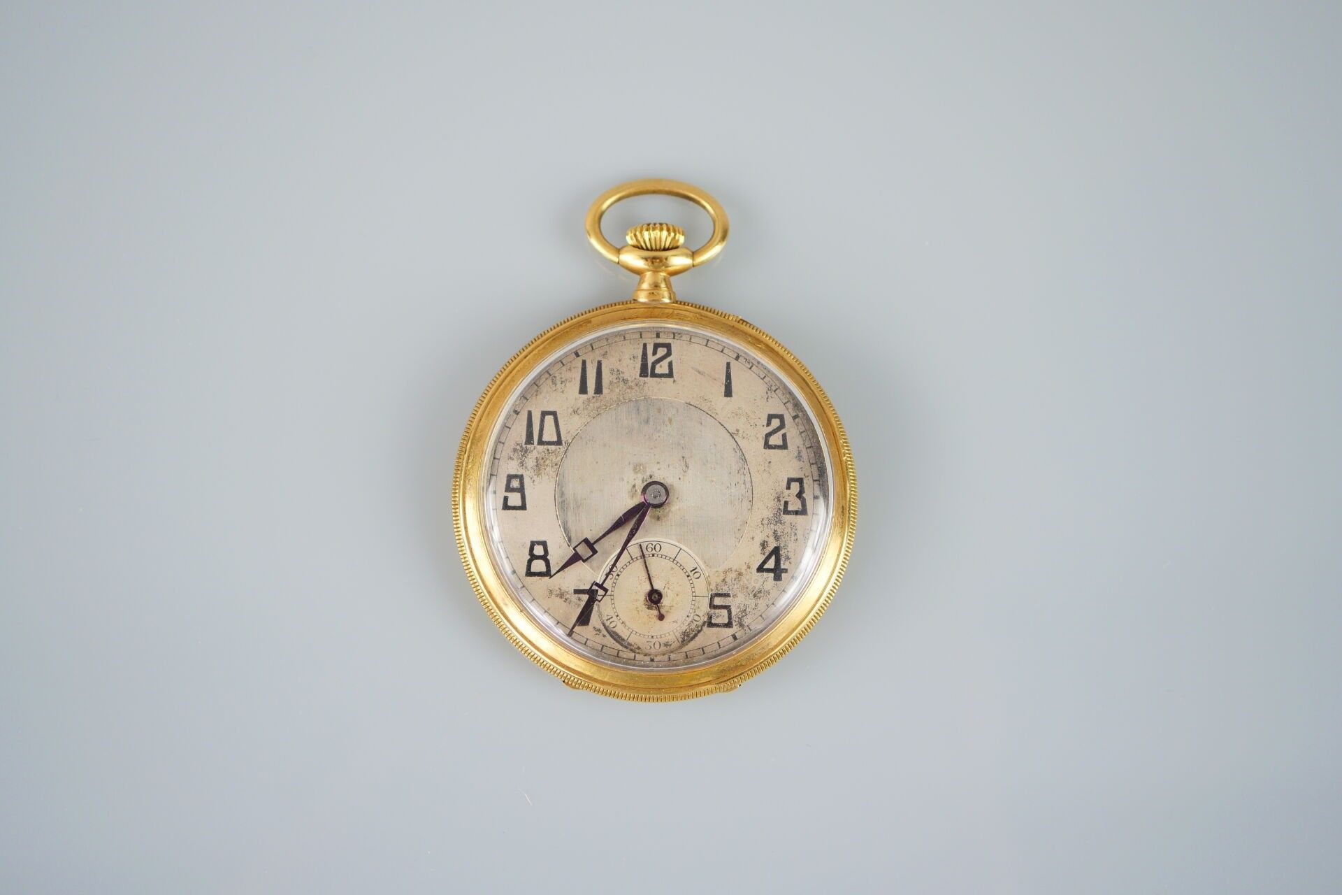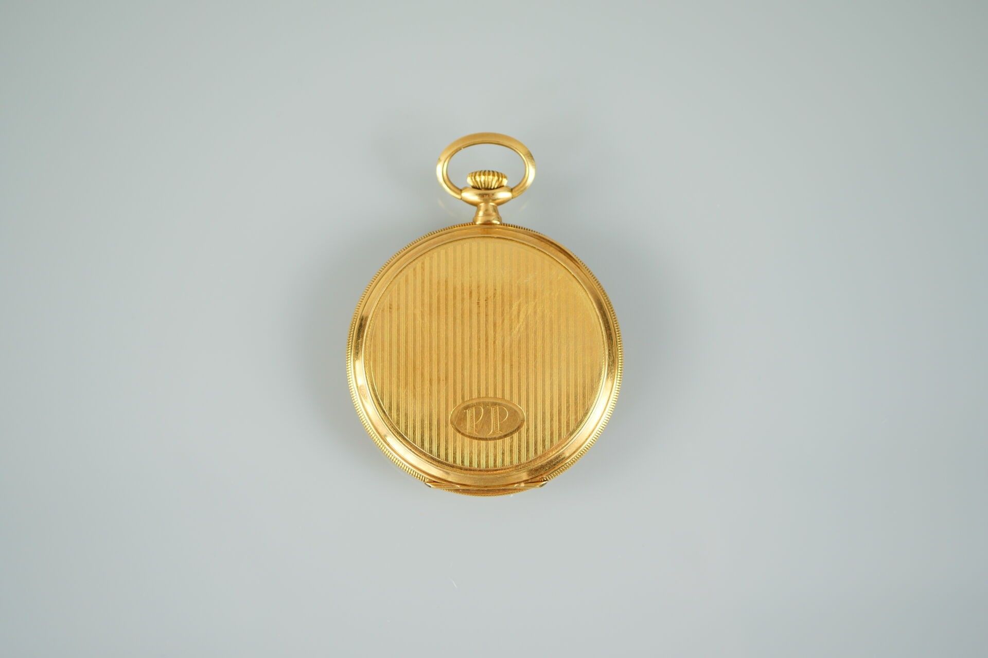 Pocket watch with case in 18K-750 thousandths yellow gold. Metal case. Metal dial with Arabic numerals. Cyphered "PP". Eagle head hallmark Total weight: 54.4g (Wear, scratches and oxidation. Sold as is with no guarantee of function) --- All lots in the sale are sold by designation. The lots are neither held at the auction nor present at the sale. Collection by appointment only during opening hours. Our auction house does not send consignments. Shipment possible via MBE Marseille, The Packengers or a carrier of your choice.
