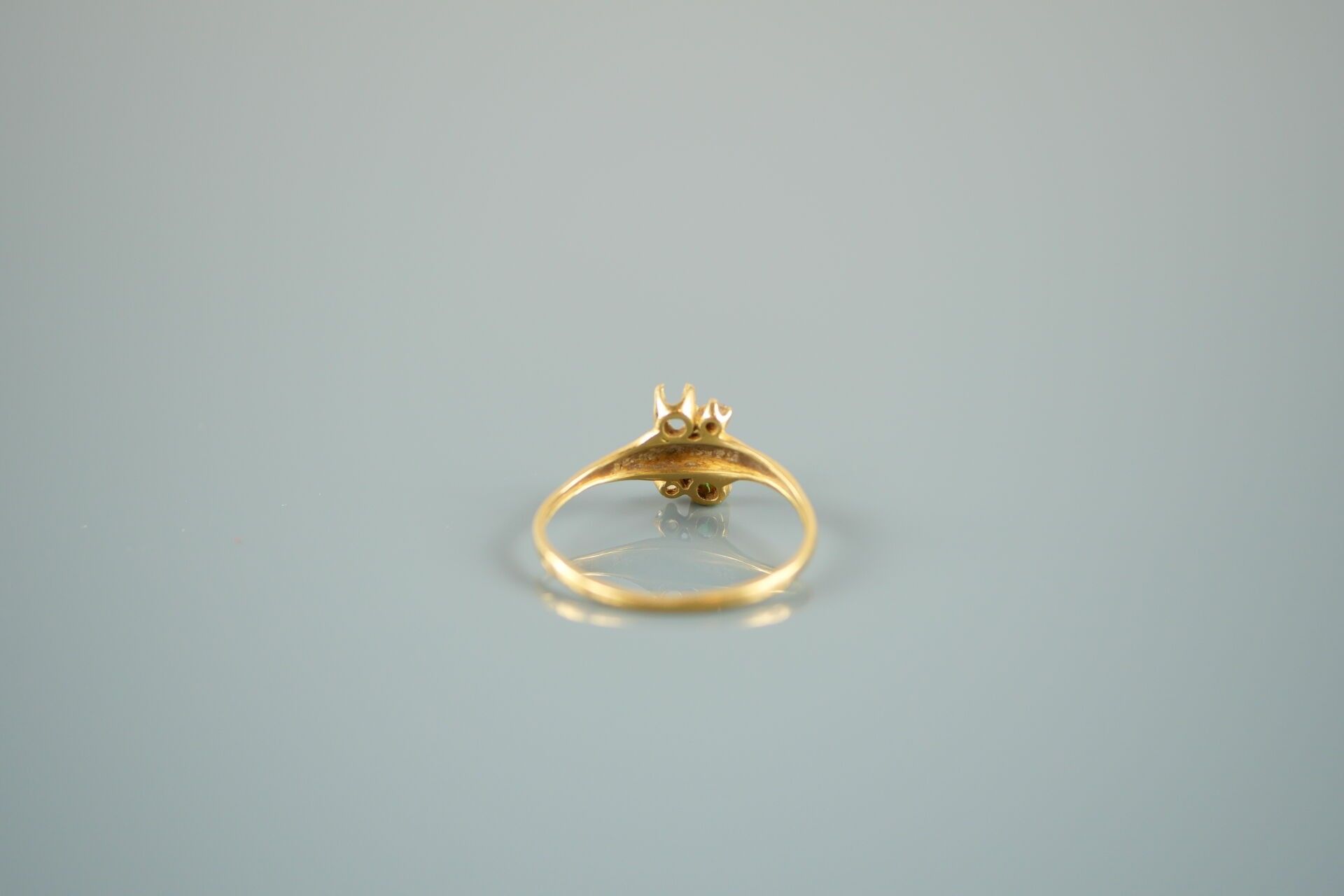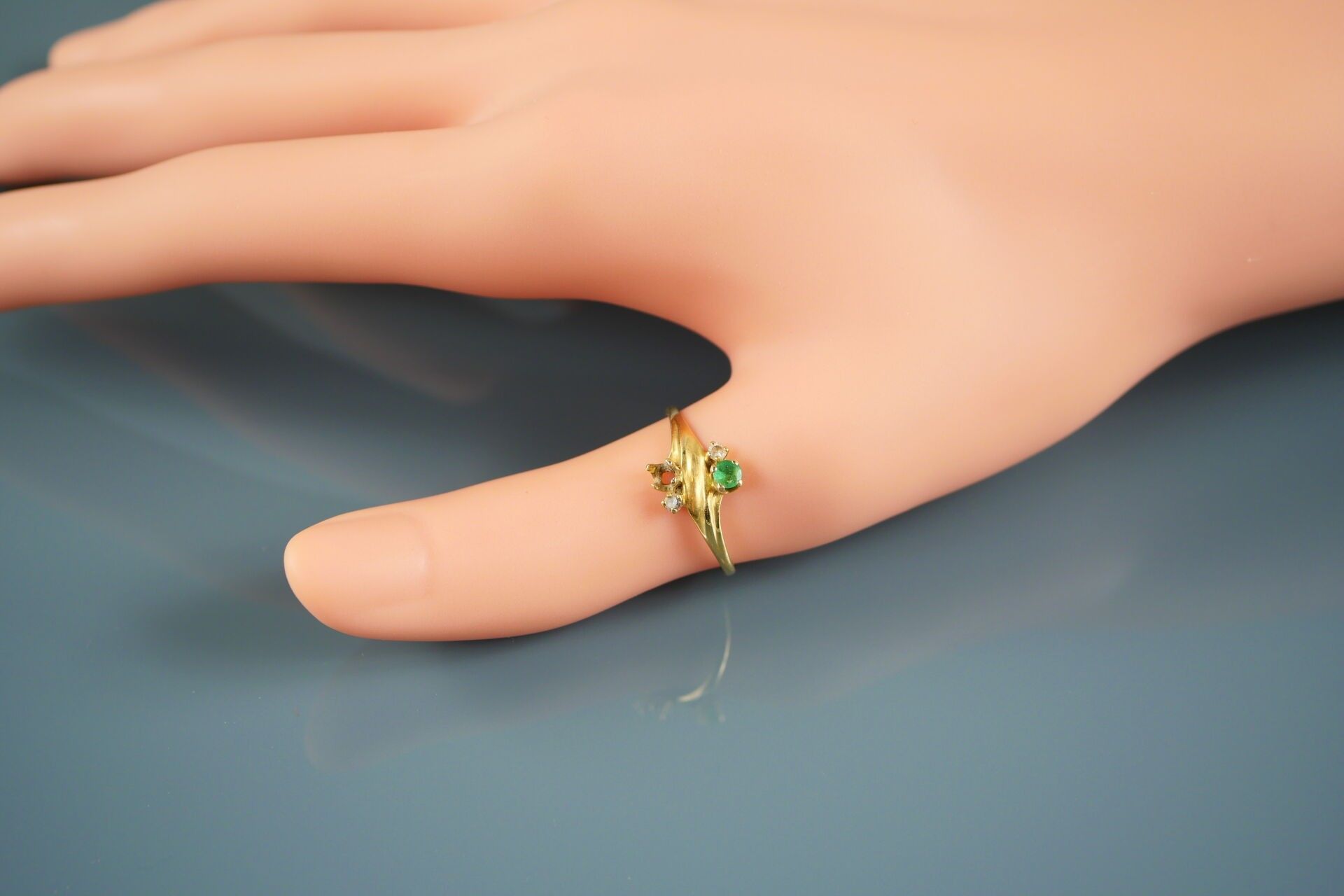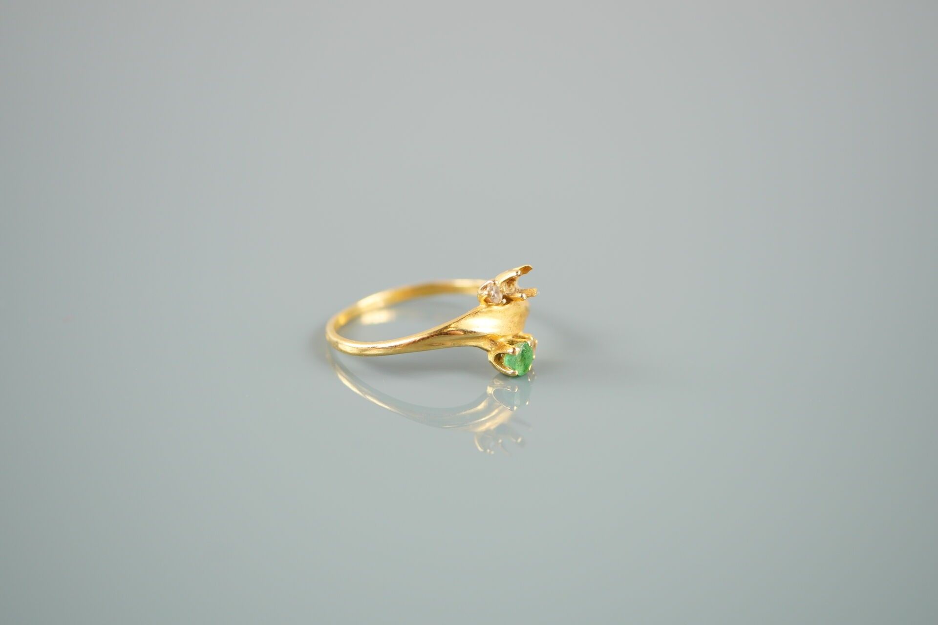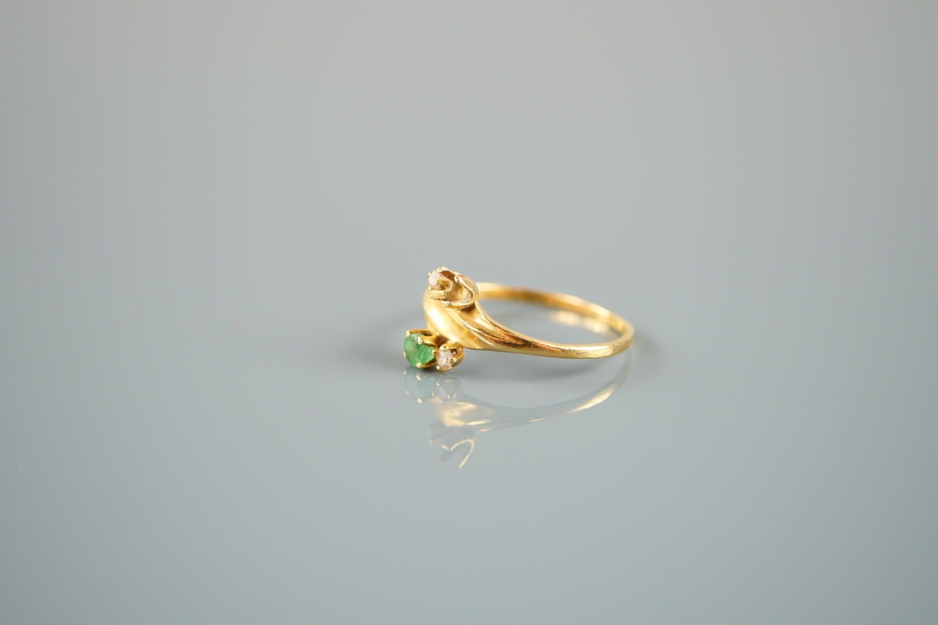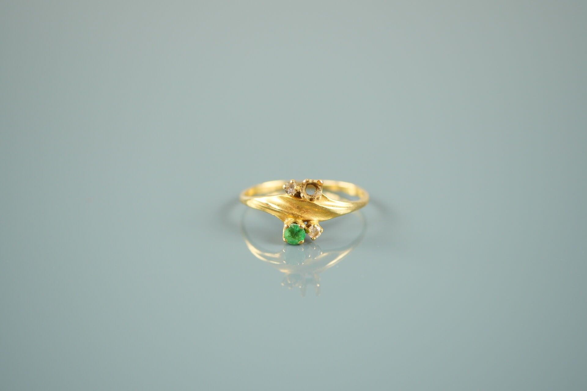 18K-750 thousandths yellow gold ring probably set with an emerald and two imitation white stones.