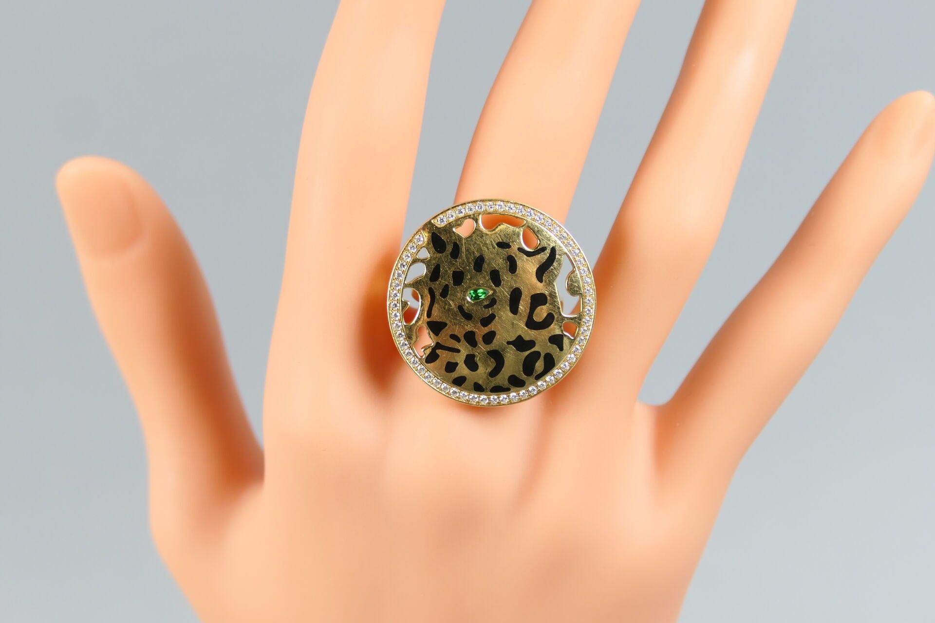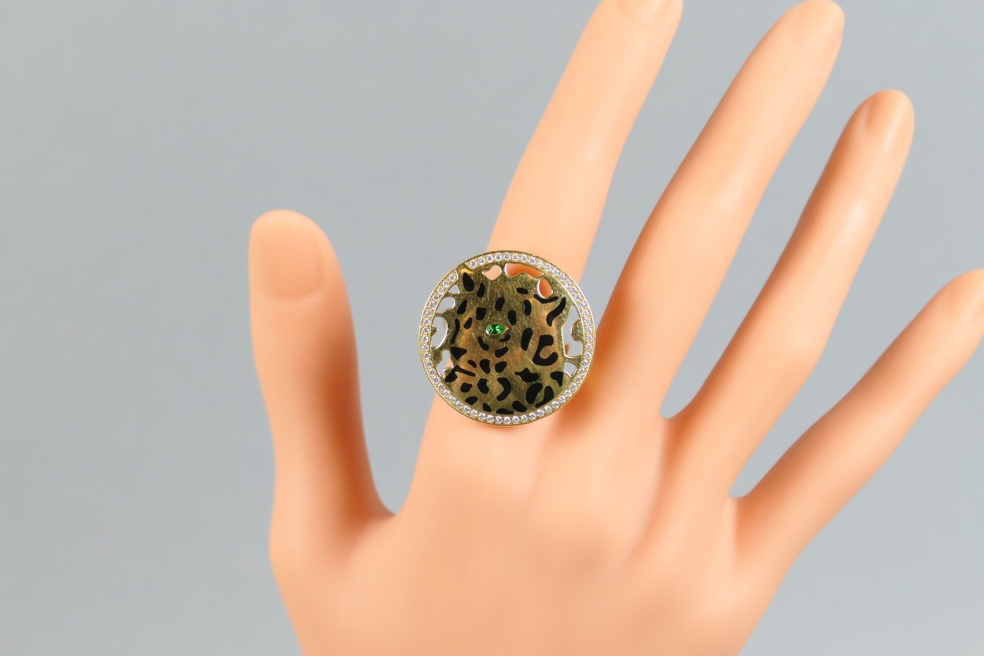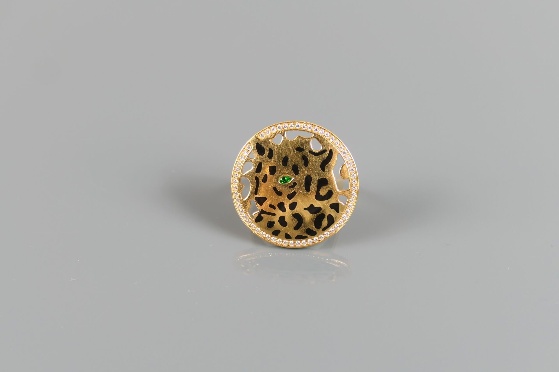 CARTIER. Panther model. Ring in yellow gold 750/°°° with a round bezel like a black enamelled disc depicting a Panther's head in reserve, the eye is signified by a pear-cut tsavorite garnet and the rim is set with round diamonds.