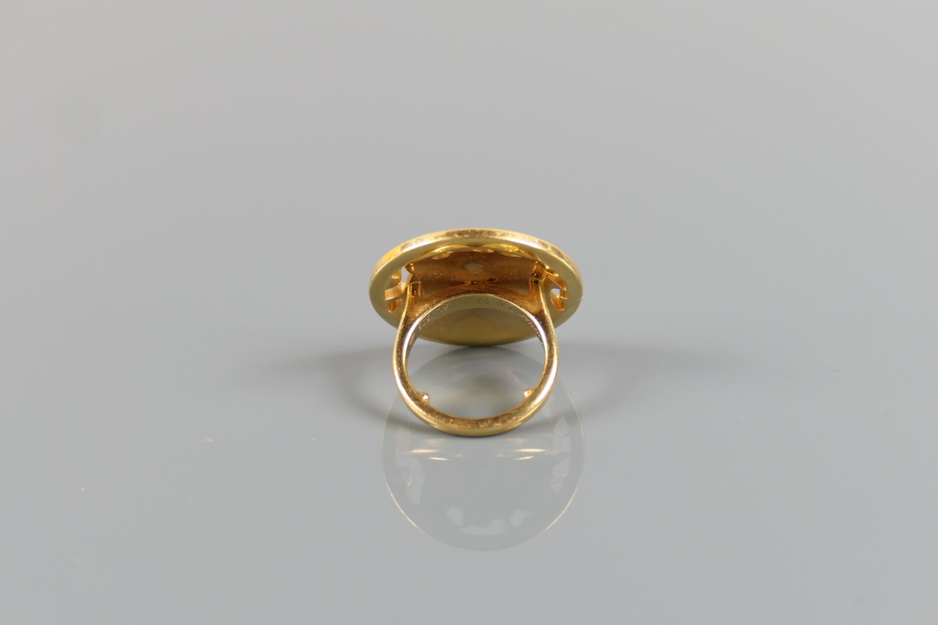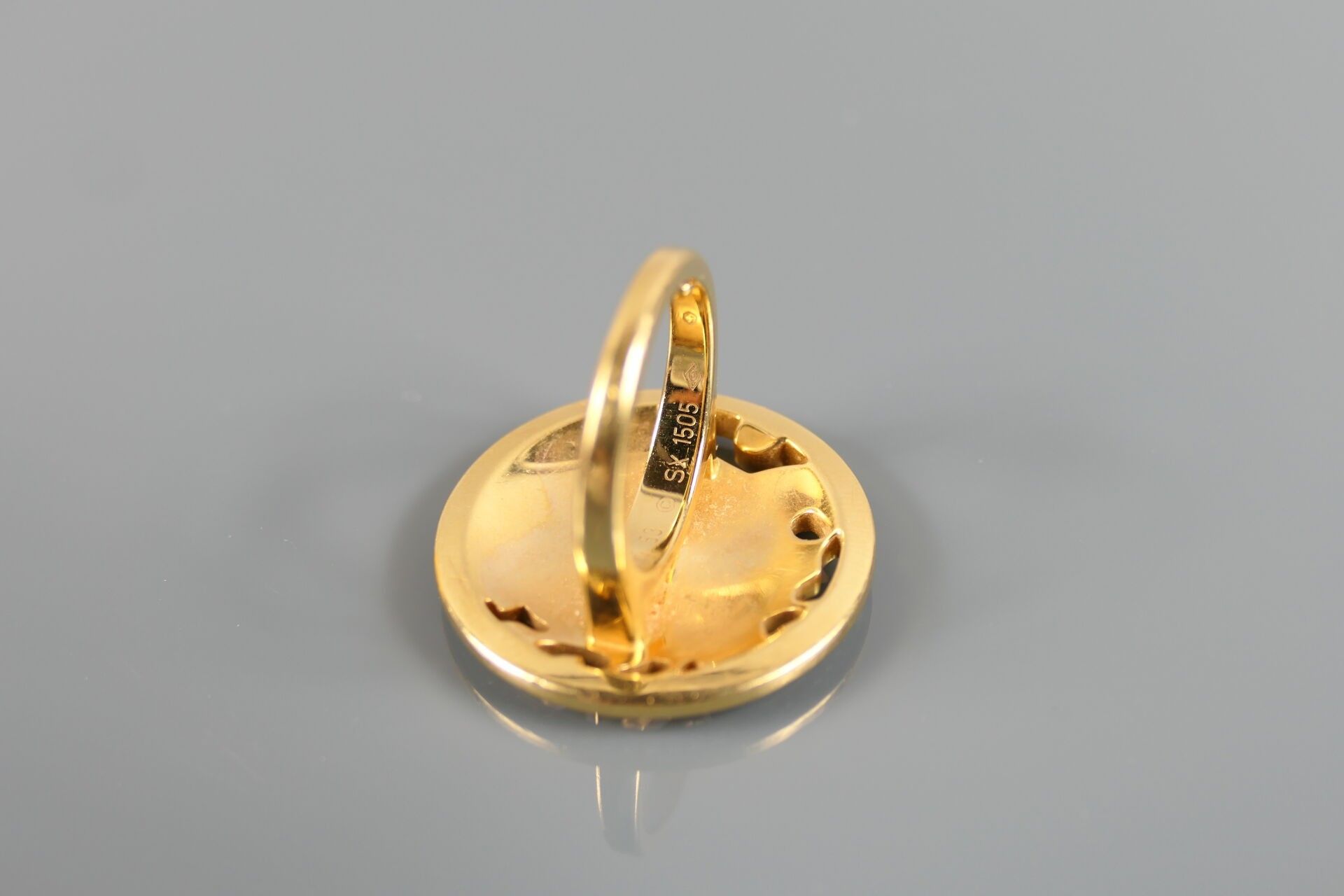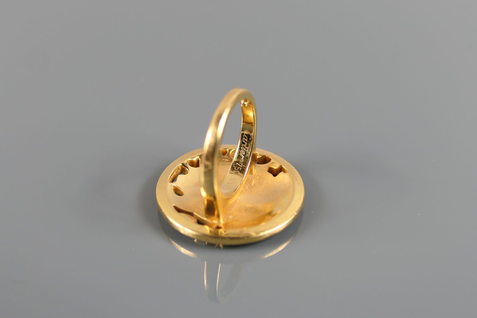 CARTIER. Panther model. Ring in yellow gold 750/°°° with a round bezel like a black enamelled disc depicting a Panther's head in reserve, the eye is signified by a pear-cut tsavorite garnet and the rim is set with round diamonds.