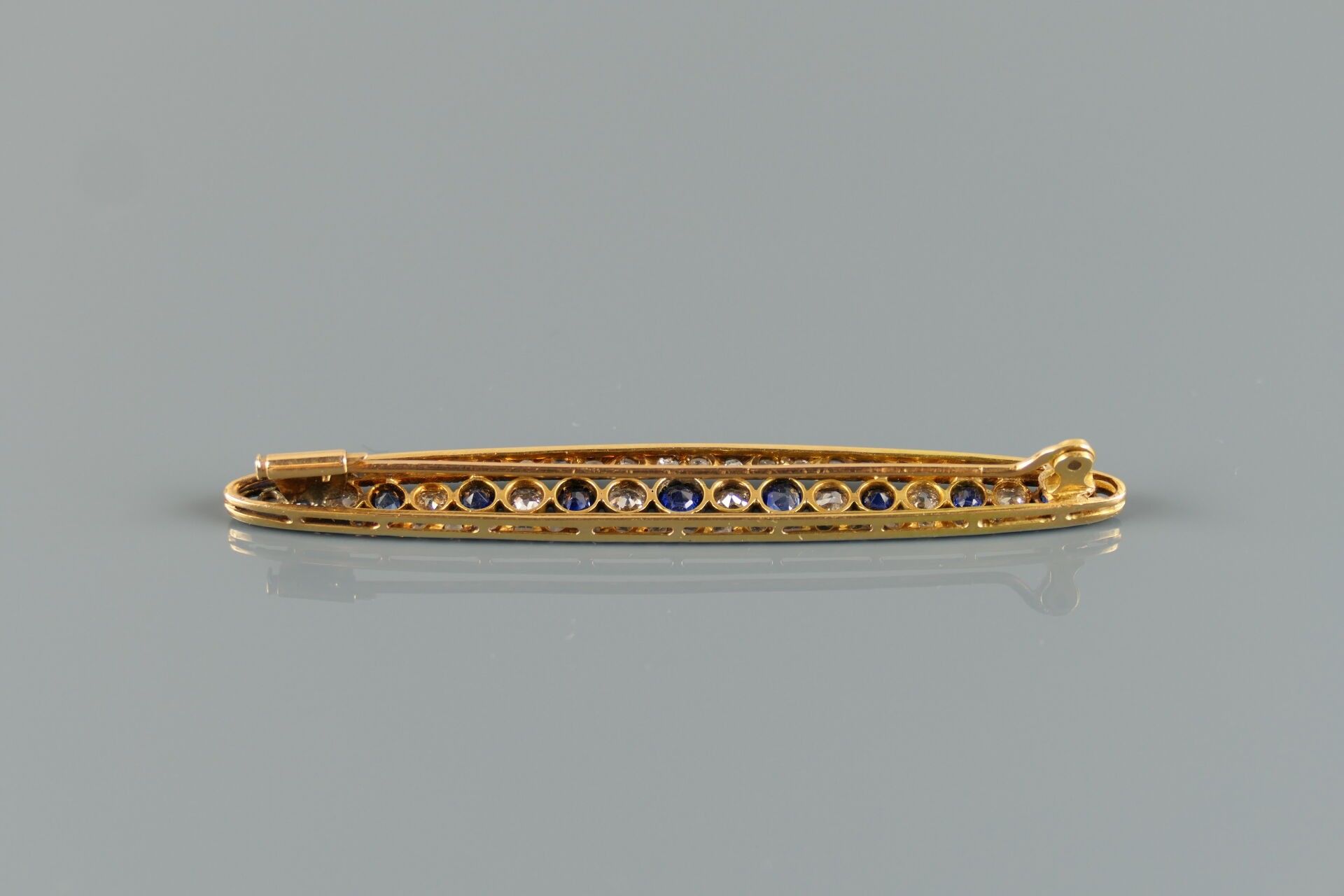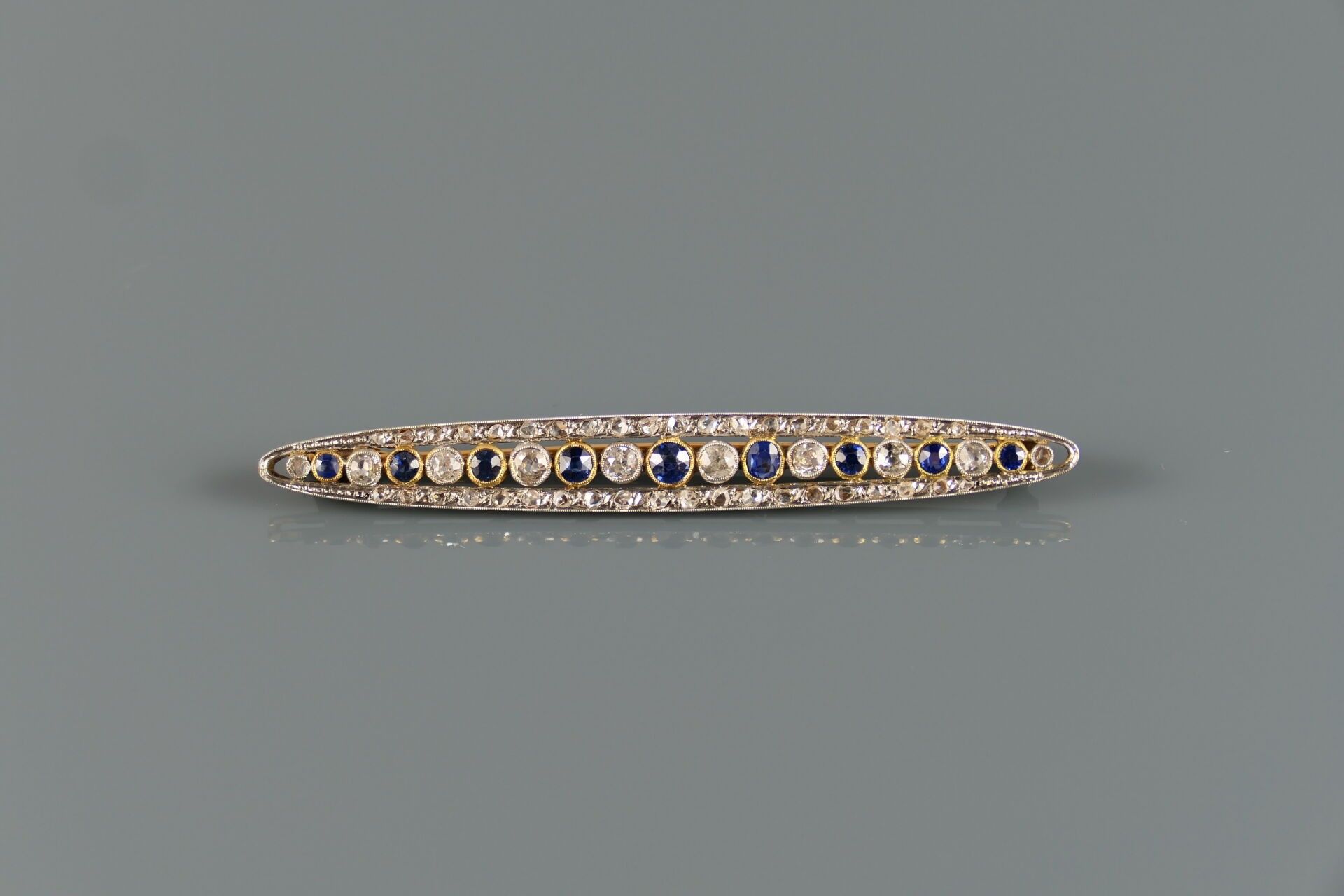 Shuttle brooch in 750 thousandths yellow gold set in platinum with small diamonds in a circle and in a closed setting with alternating diamonds and probably sapphires.