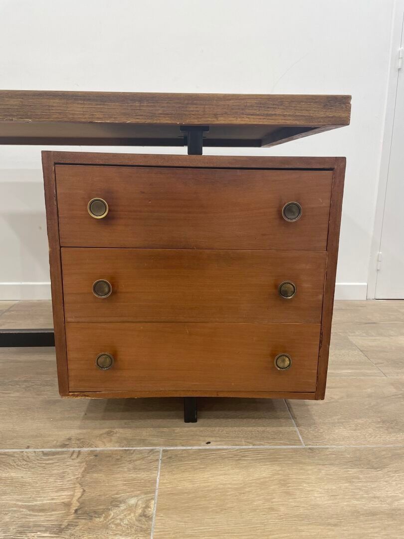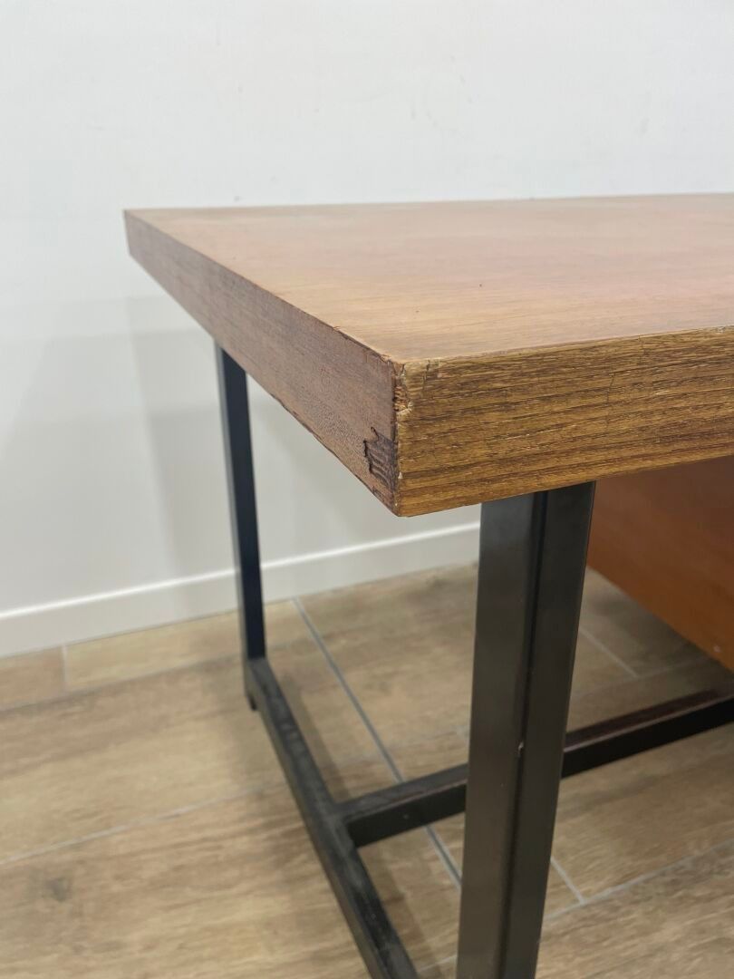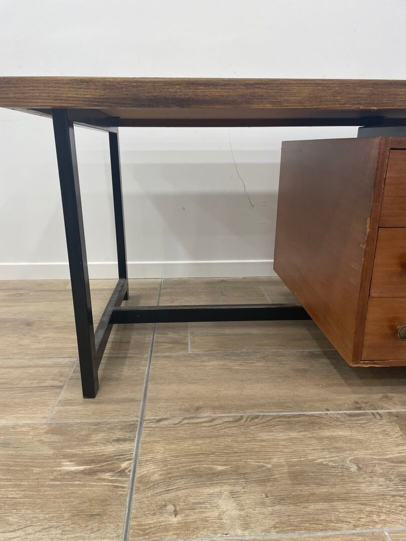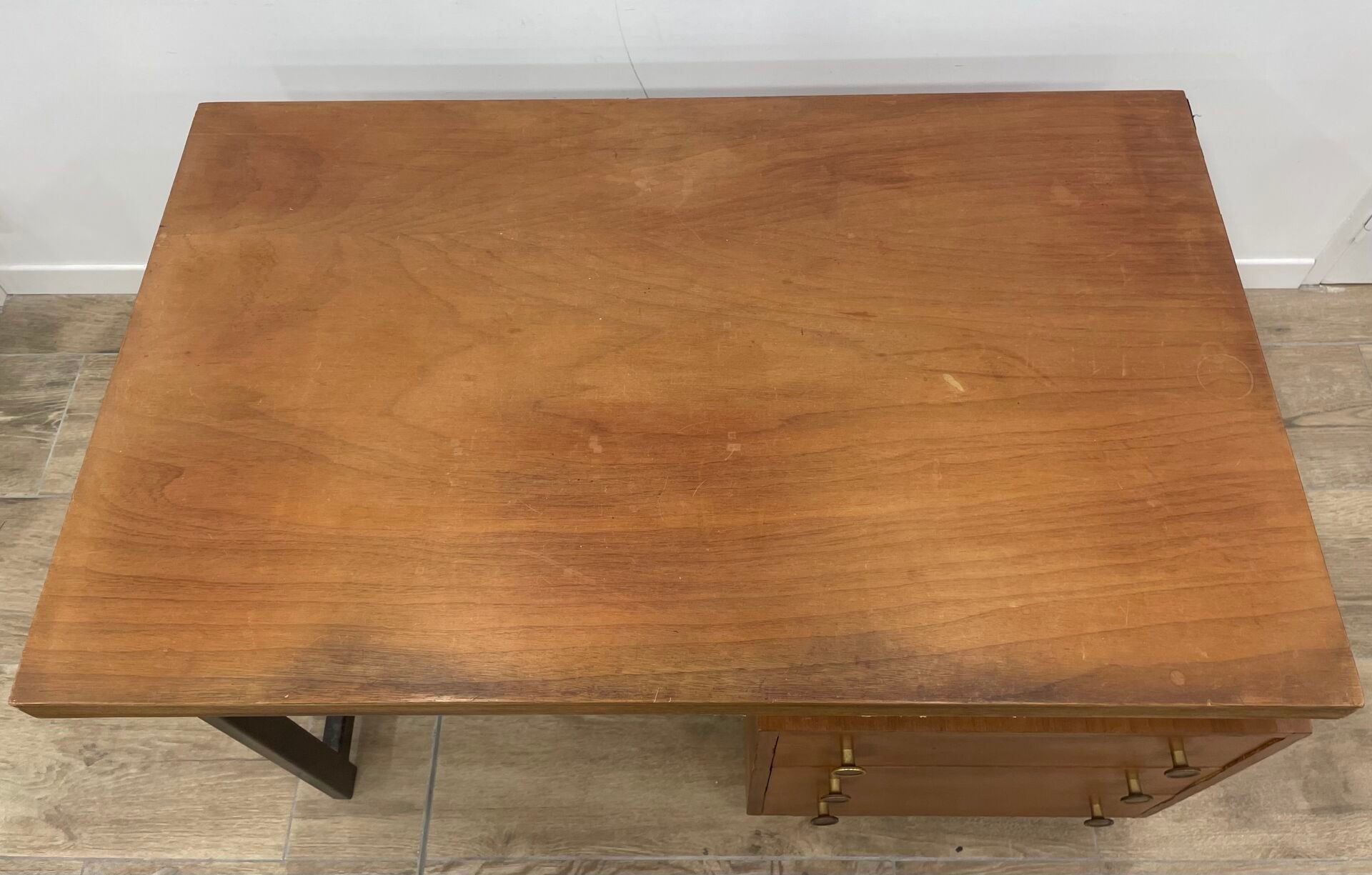 Rectangular veneered desk with side pedestal opening to 3 drawers, black lacquered metal structure.
