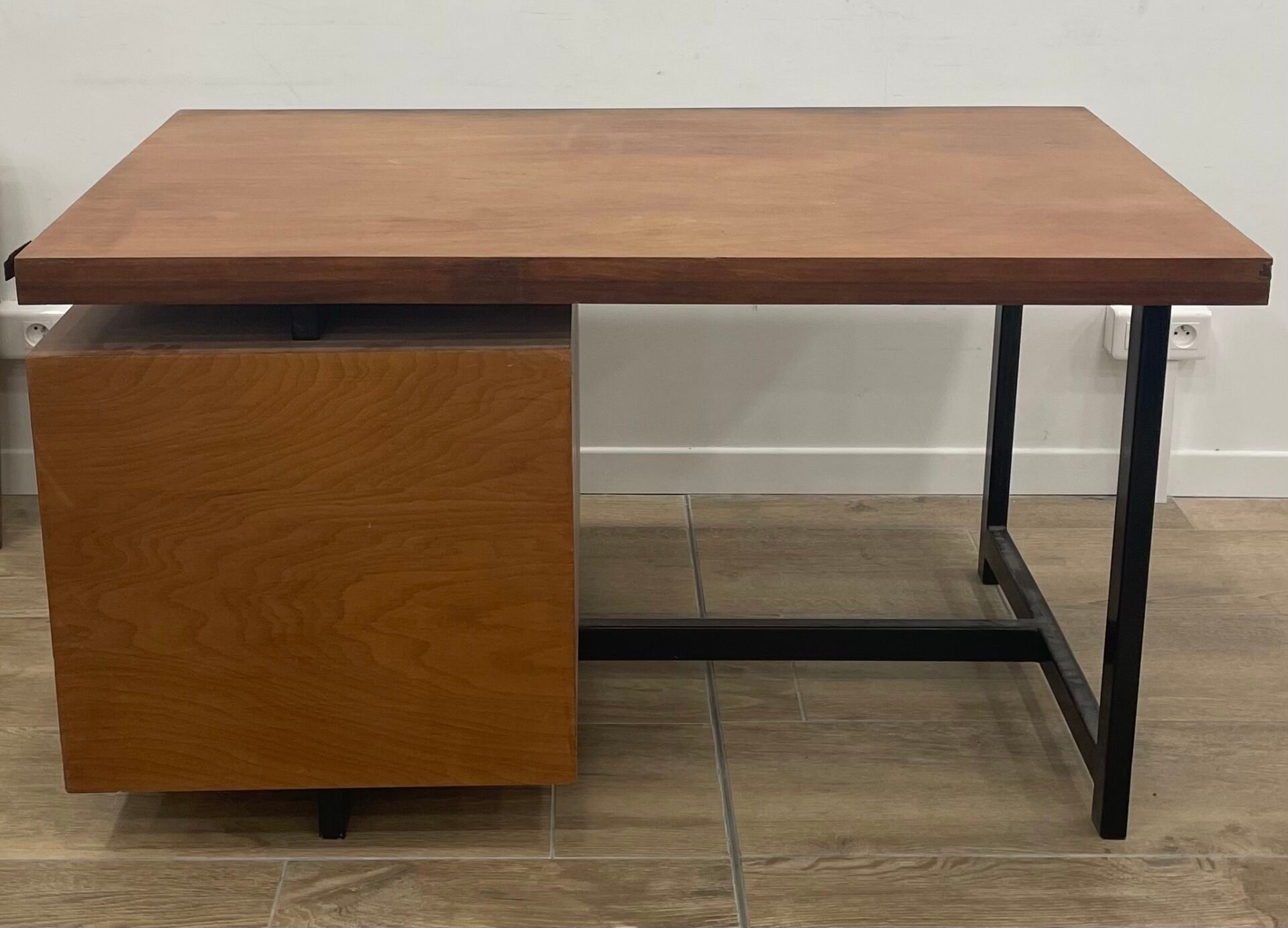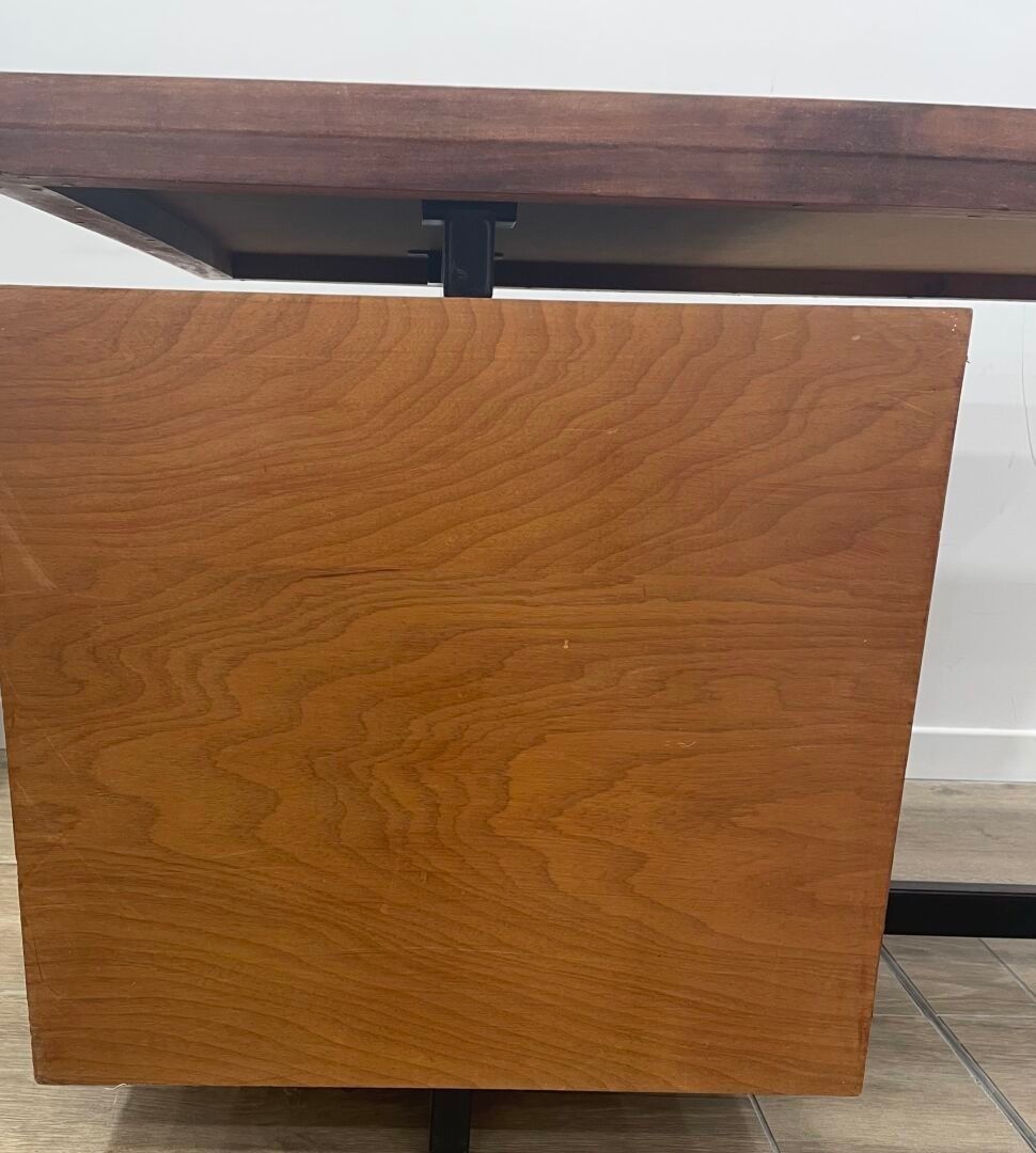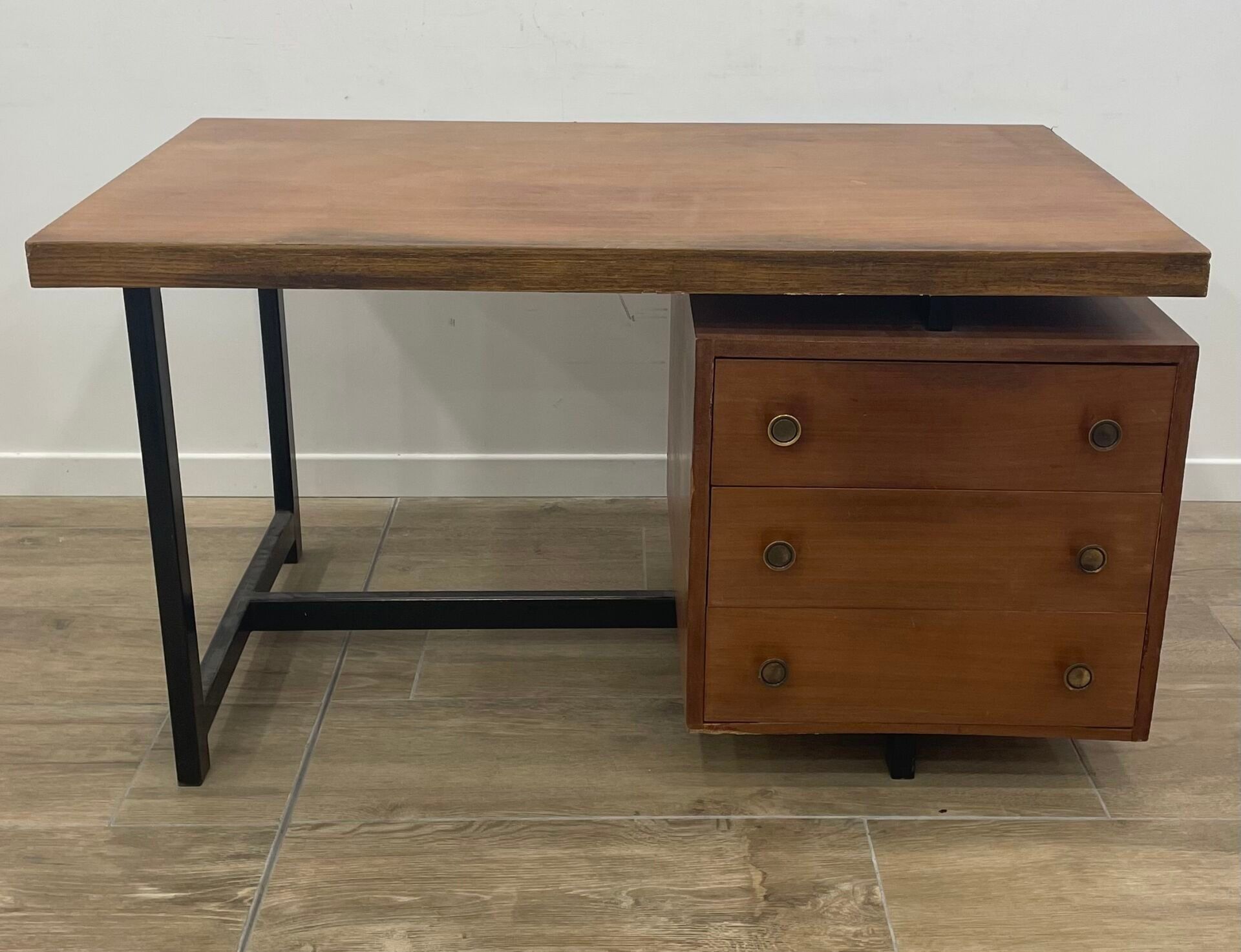 Rectangular veneered desk with side pedestal opening to 3 drawers, black lacquered metal structure.