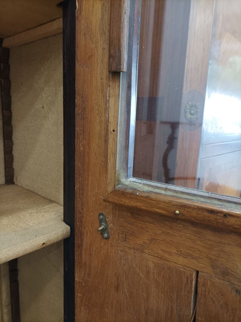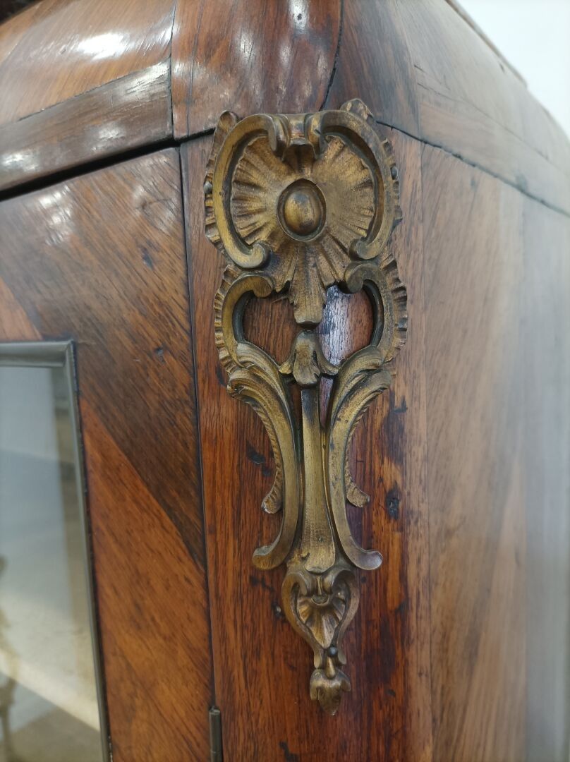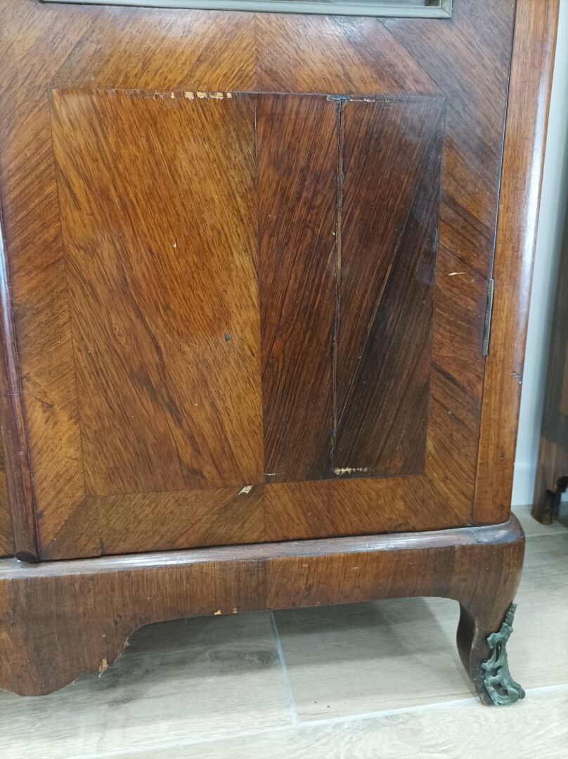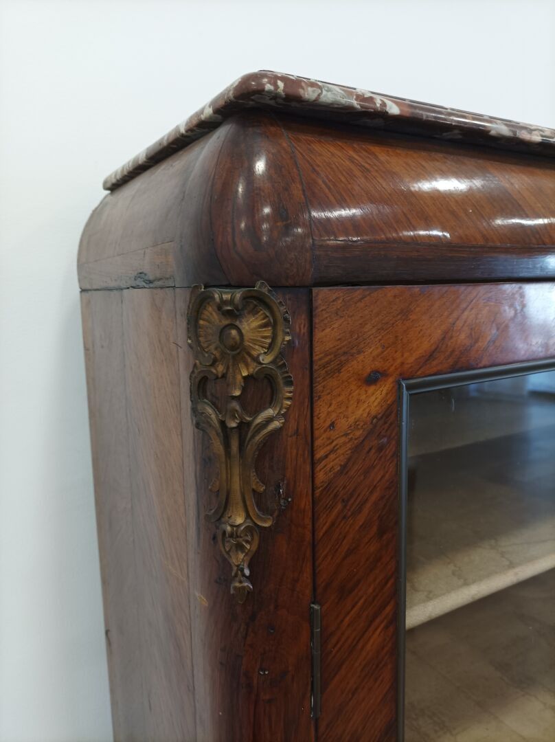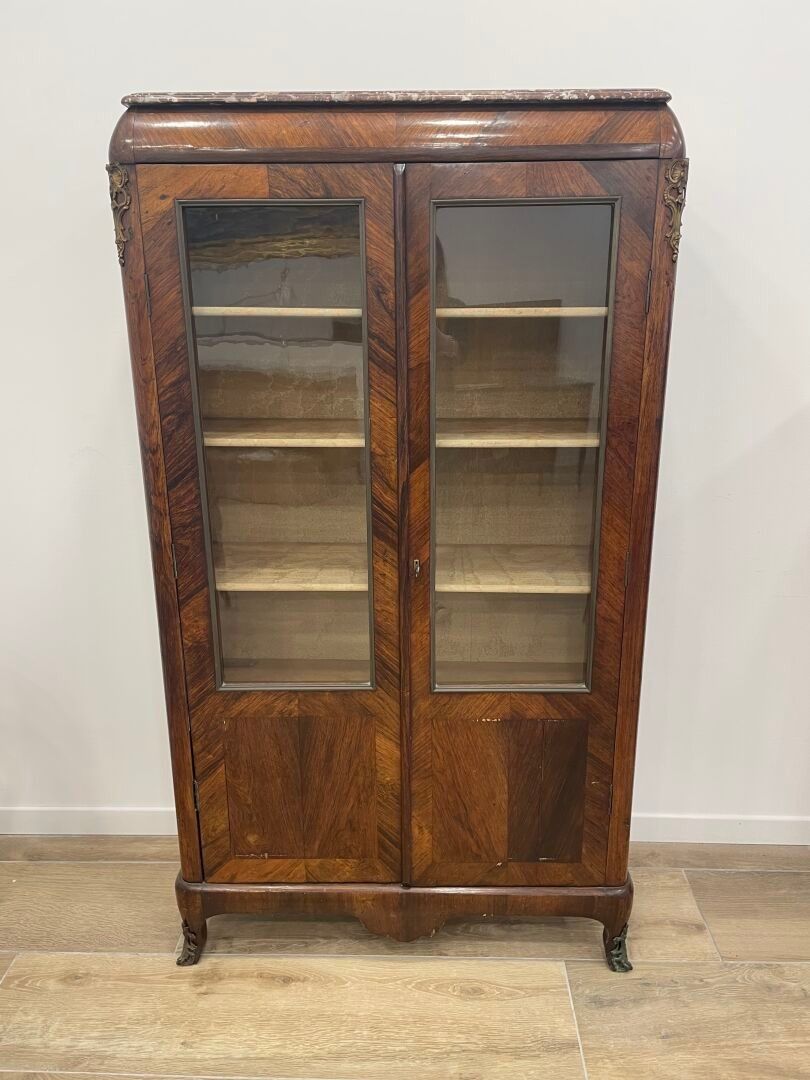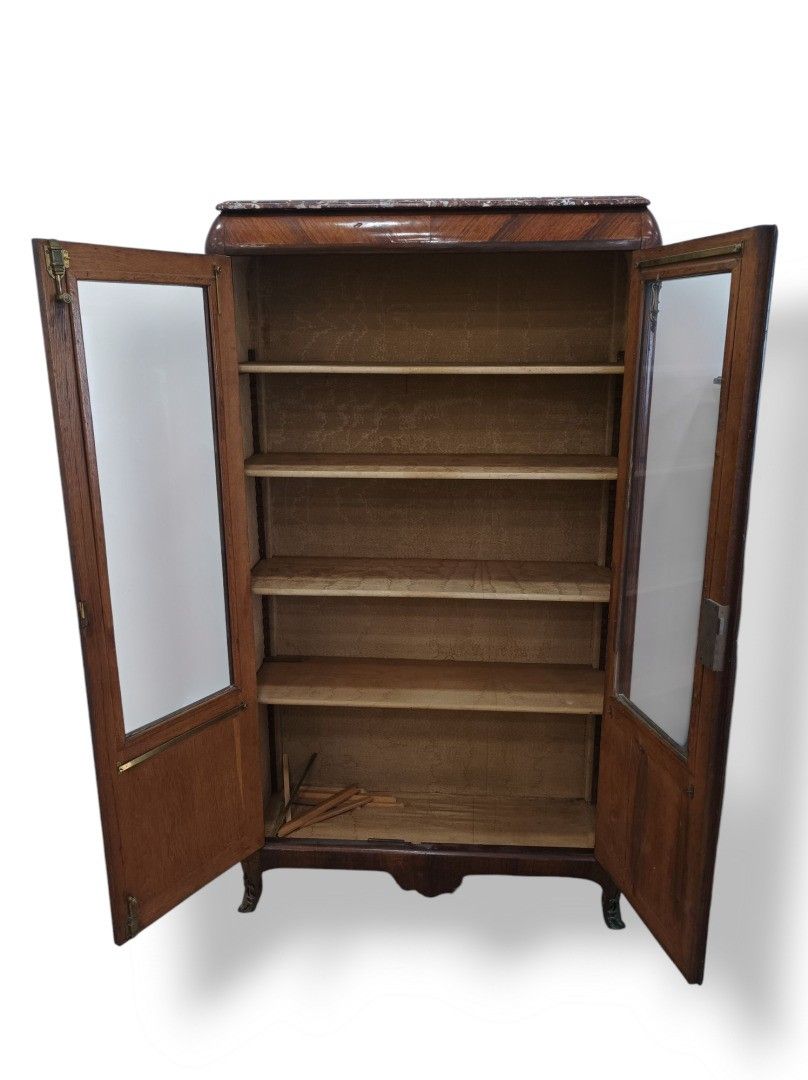 Veneered display cabinet opening to two partly glazed doors, the rounded jambs with small cambered feet surmounted by a griotte red marble top cushioned by an inverted doucine.
