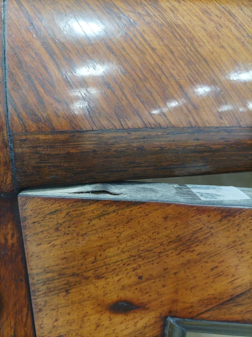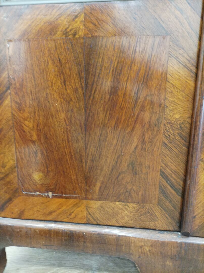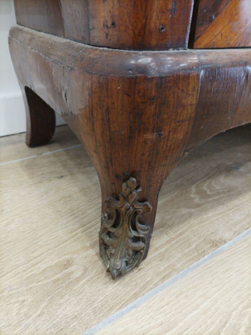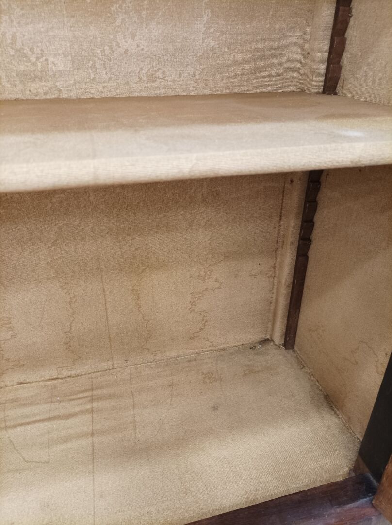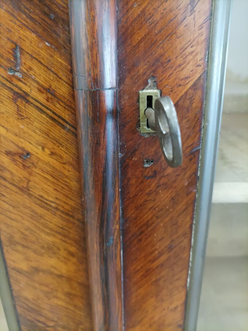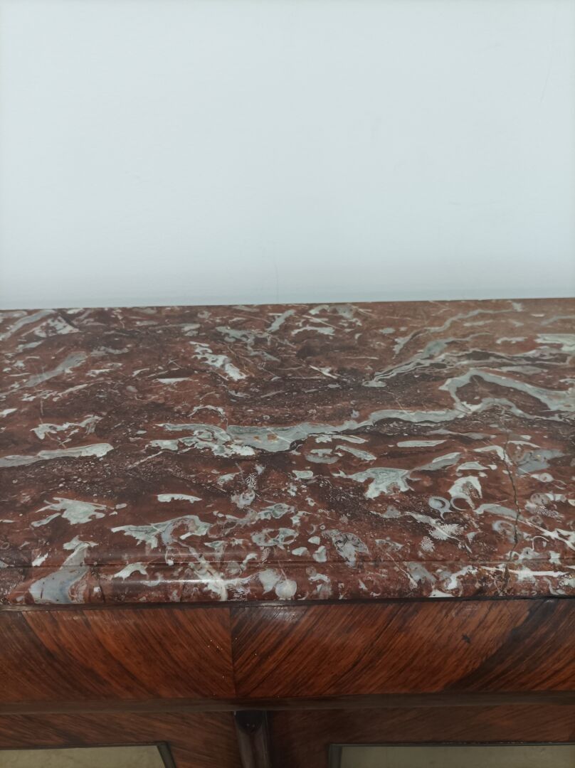 Veneered display cabinet opening to two partly glazed doors, the rounded jambs with small cambered feet surmounted by a griotte red marble top cushioned by an inverted doucine.