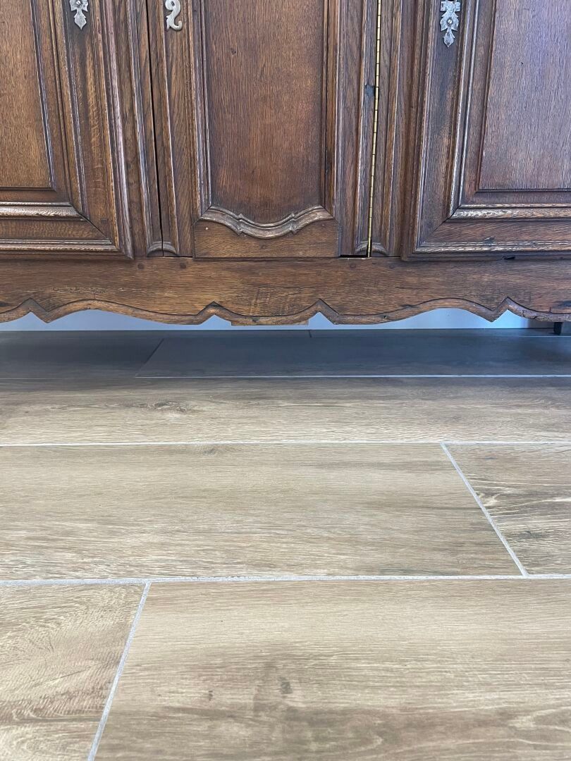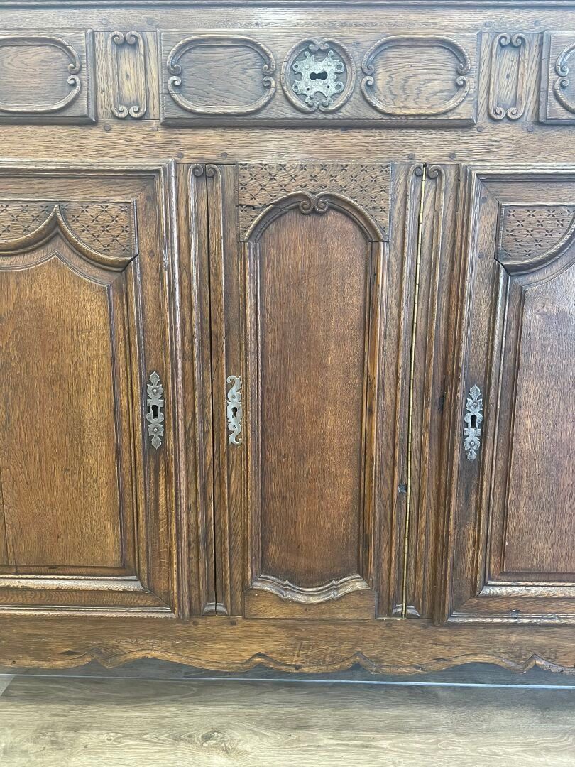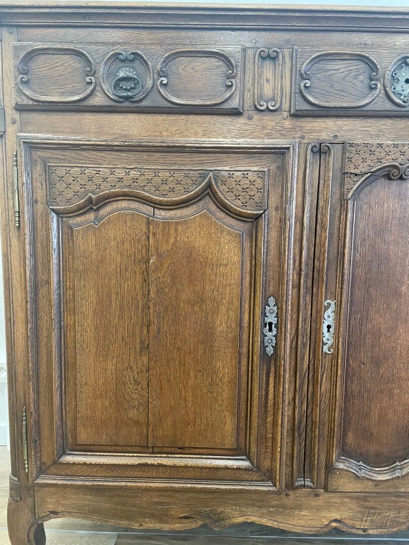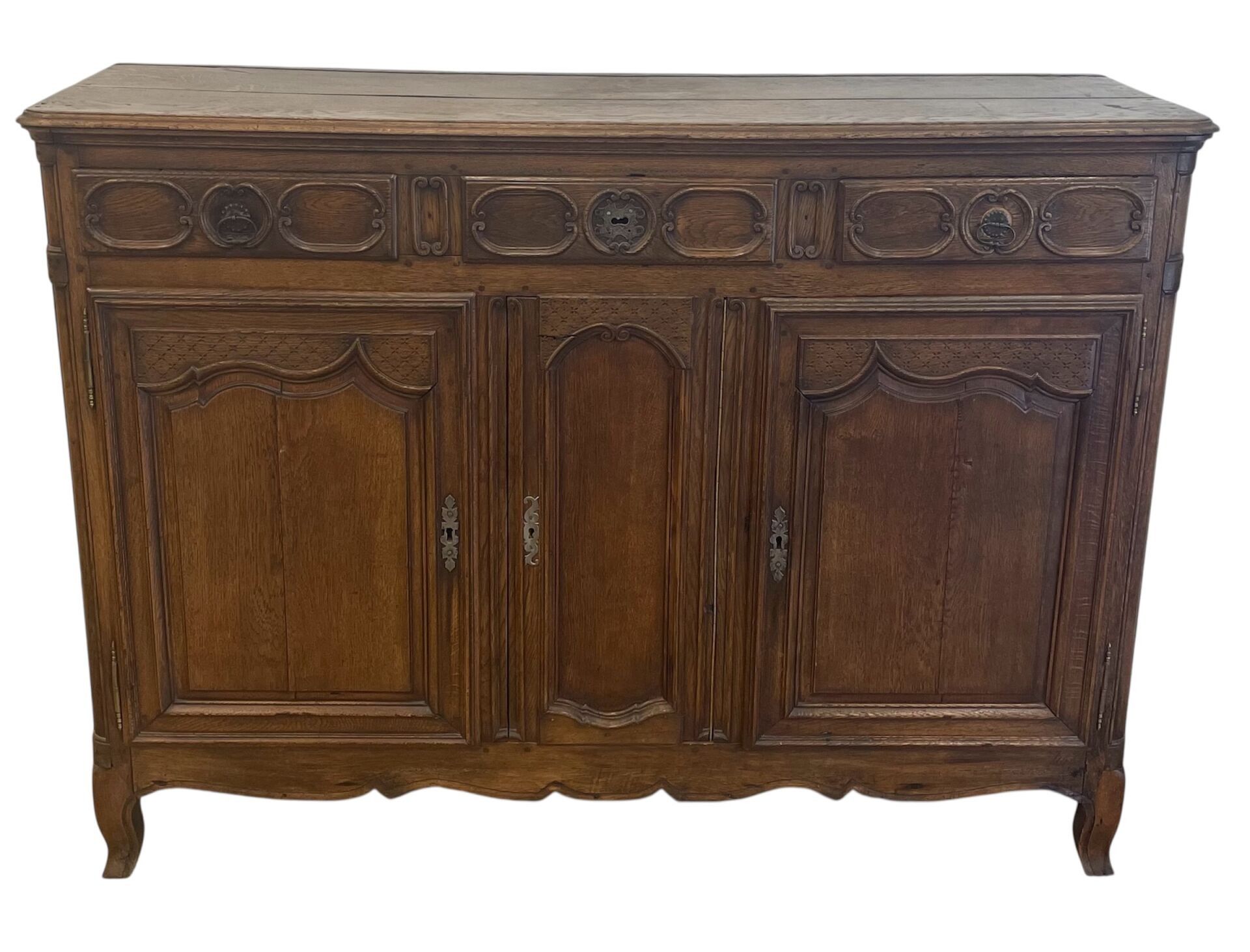 Moulded and carved oak cabinet opening to 3 drawers and 3 doors.