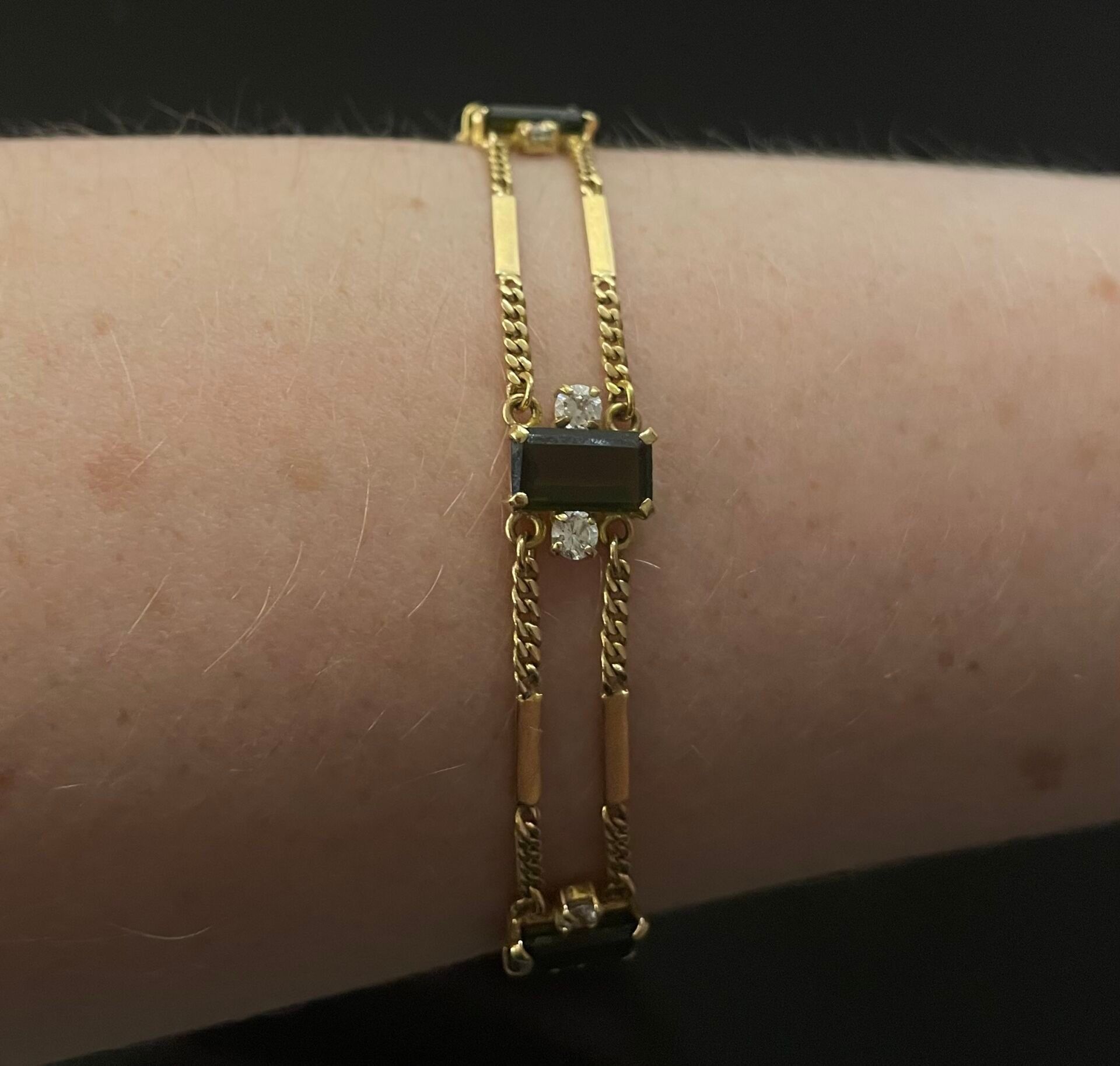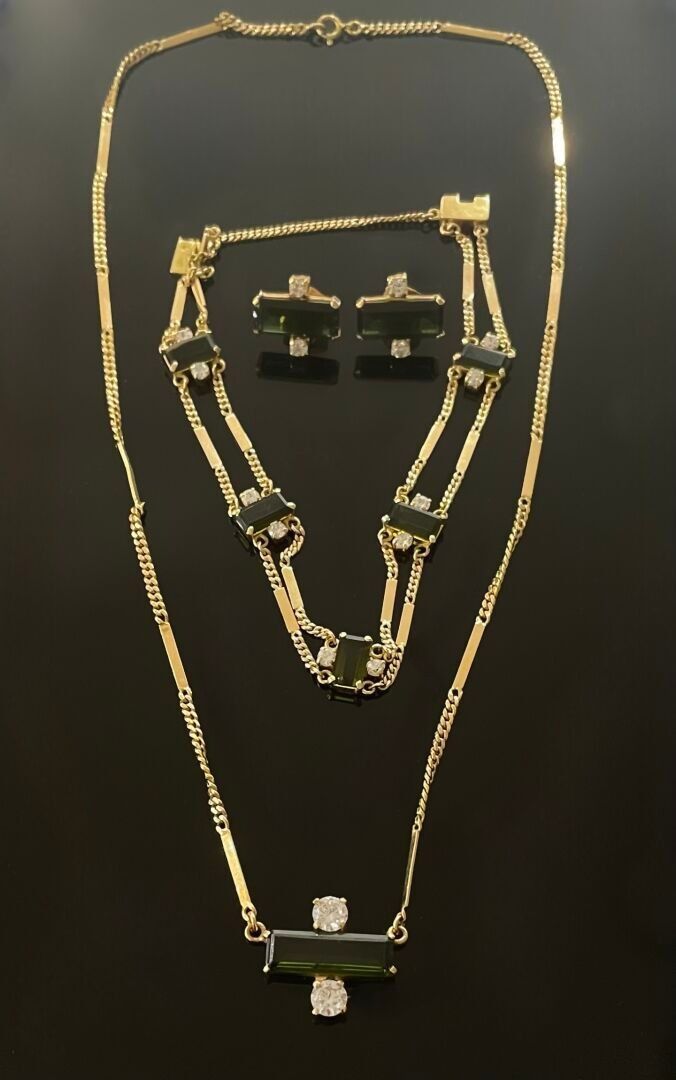 JEWELRY in yellow gold (750) set with green stones and brilliants, comprising a bracelet, a necklace and a pair of earrings