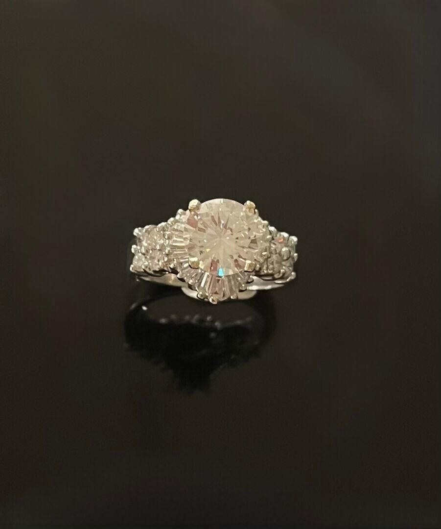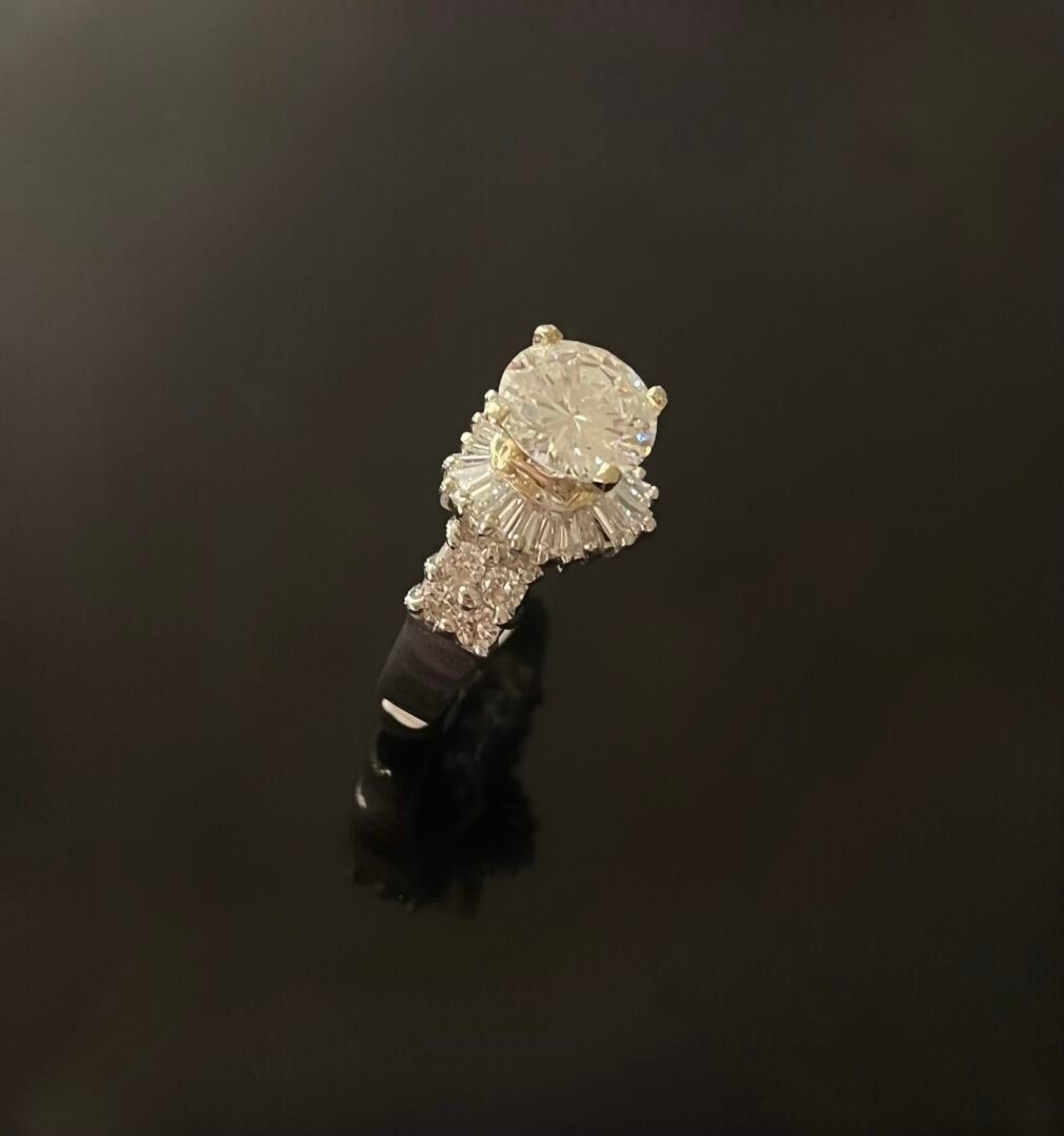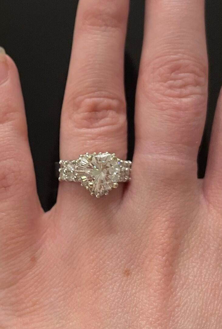 Solitaire ring in white gold (750) holding a central diamond weighing 1.72 carats set in baguette-cut diamonds forming a heart surrounded by brilliant-cut diamonds.