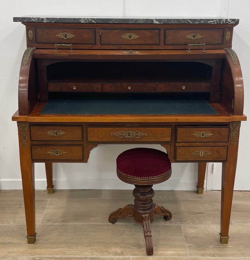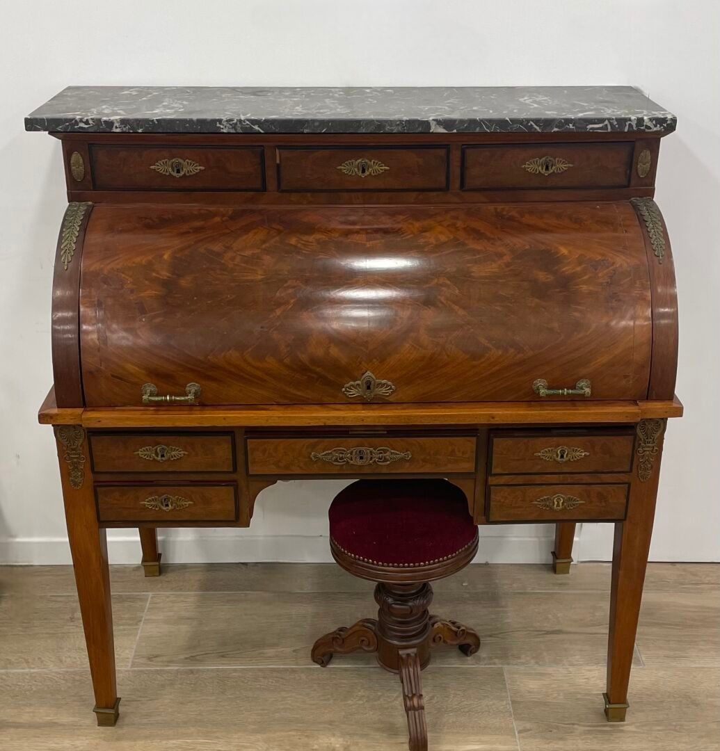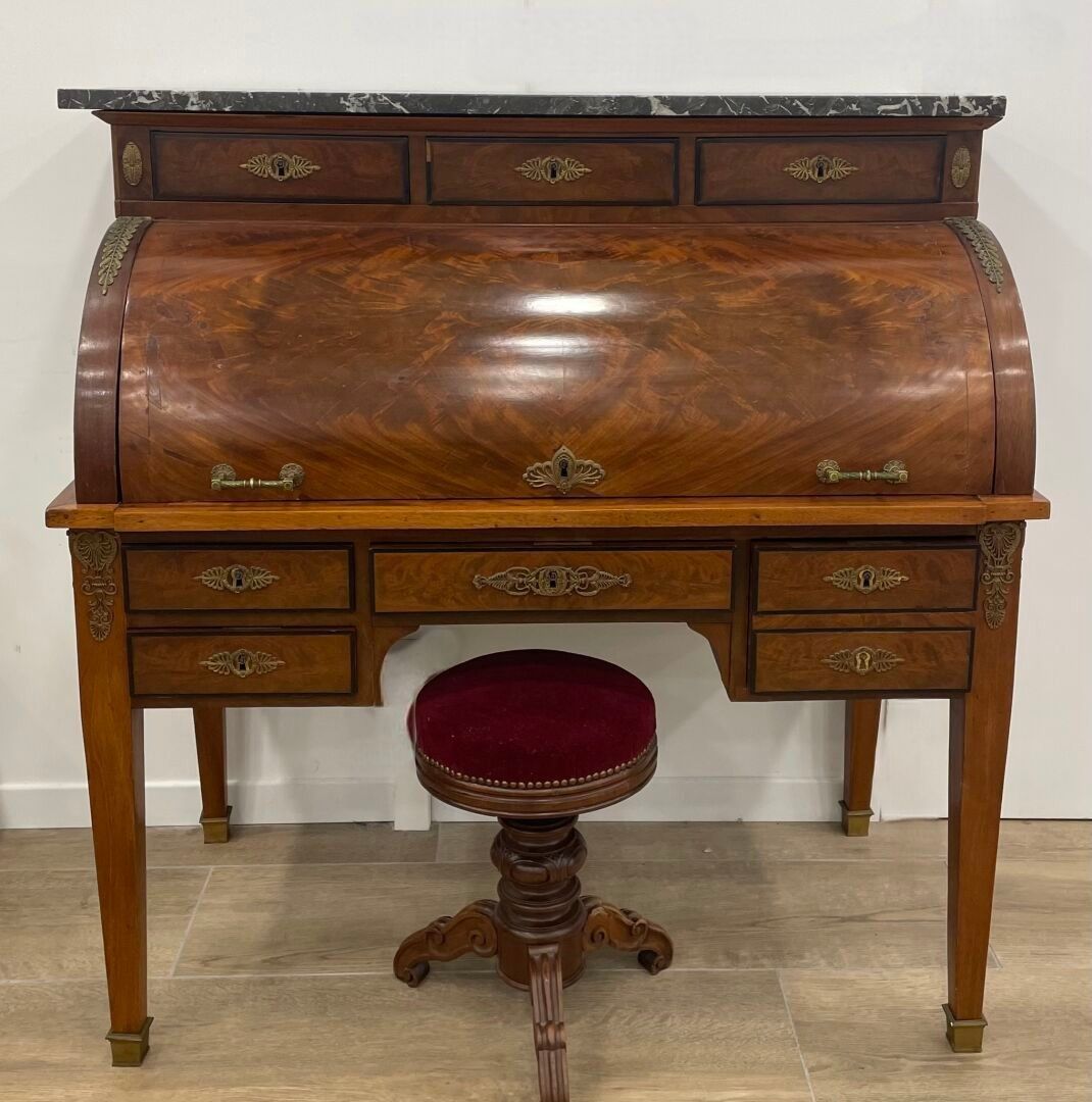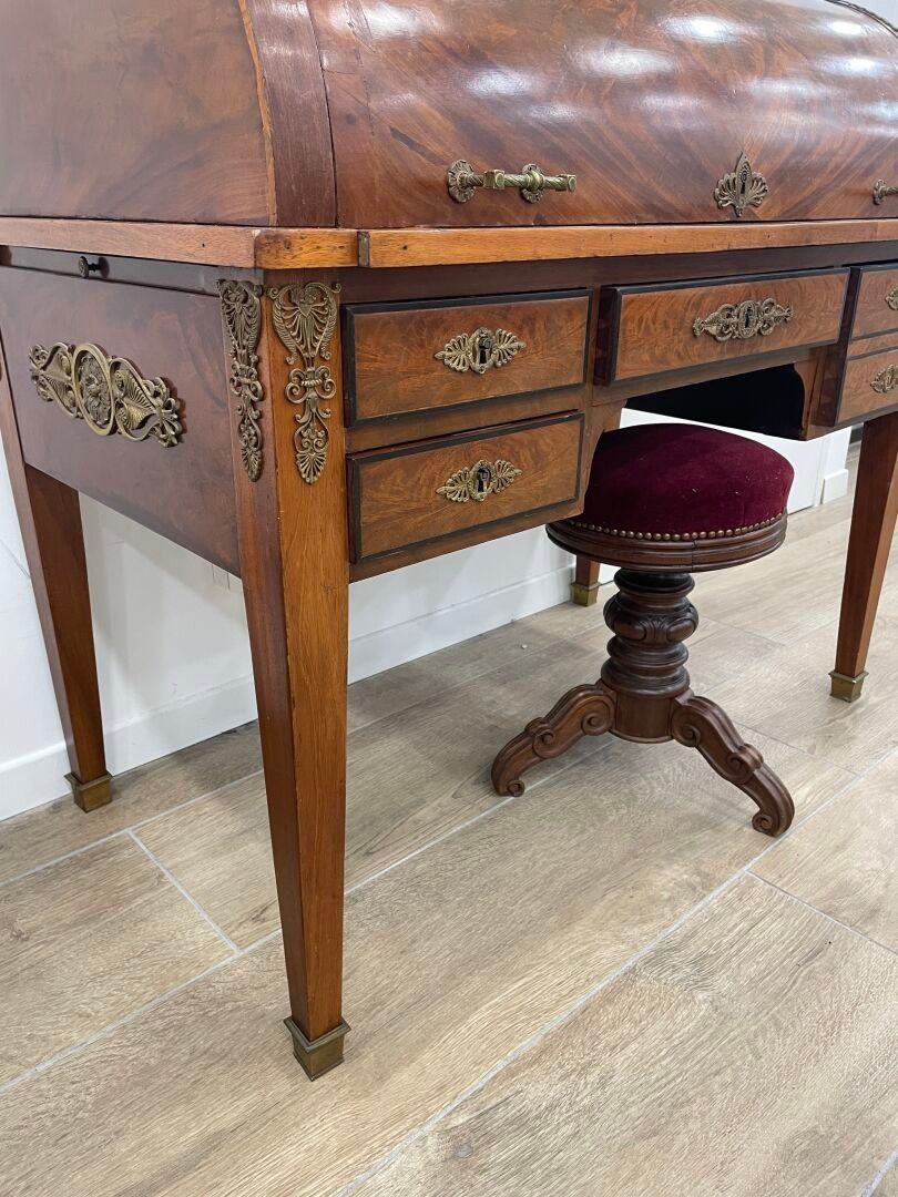 Large mahogany and flame mahogany veneered cylinder desk. Th…