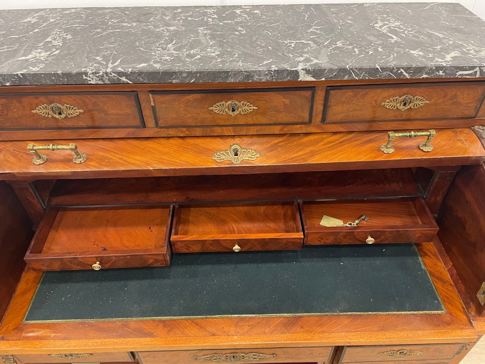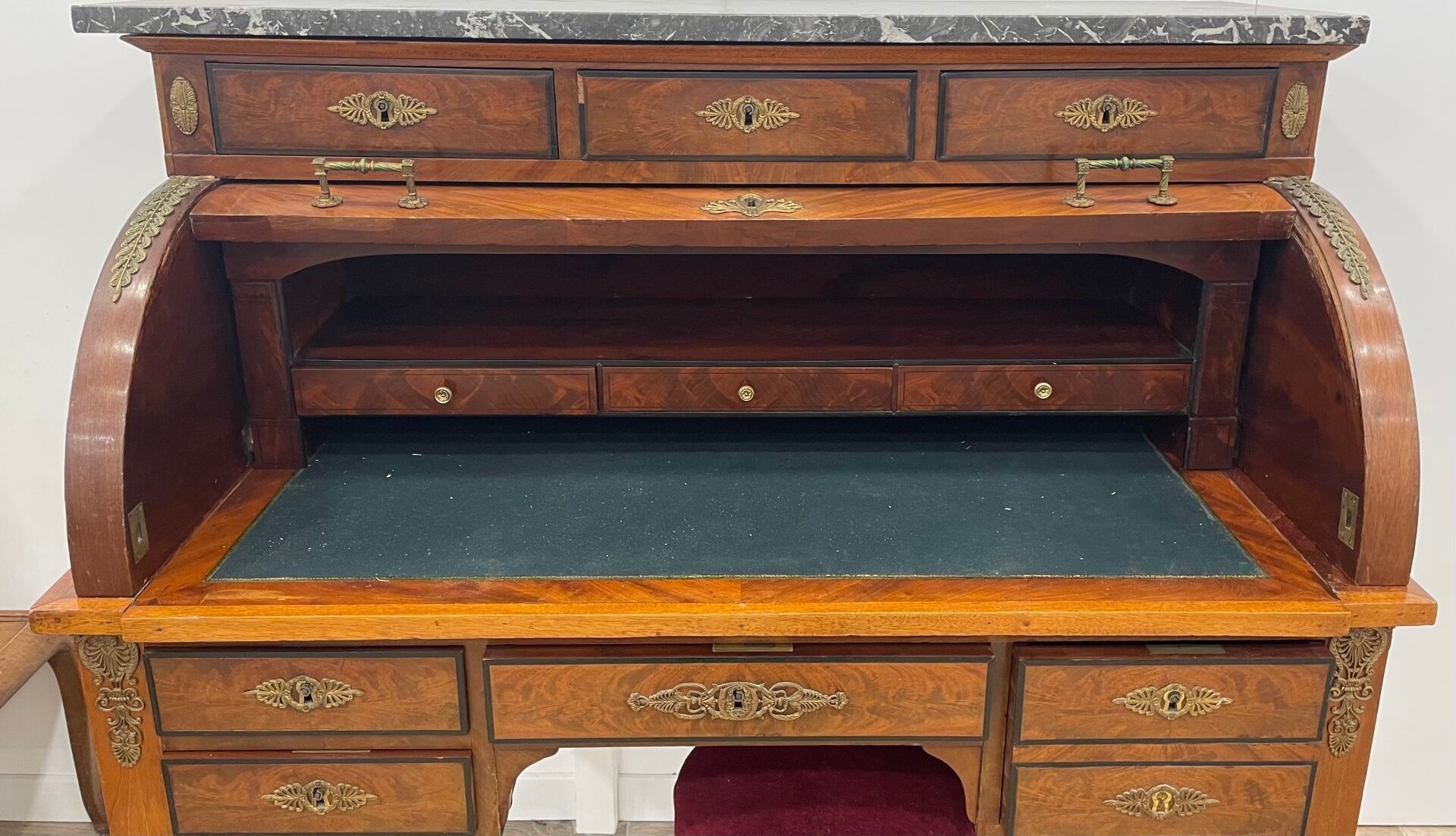 Large mahogany and flame mahogany veneered cylinder desk. The top opens with three drawers and the cylinder reveals three drawers. The top and side pulls are upholstered in green leather. Five drawers in the lower section.