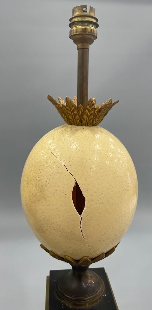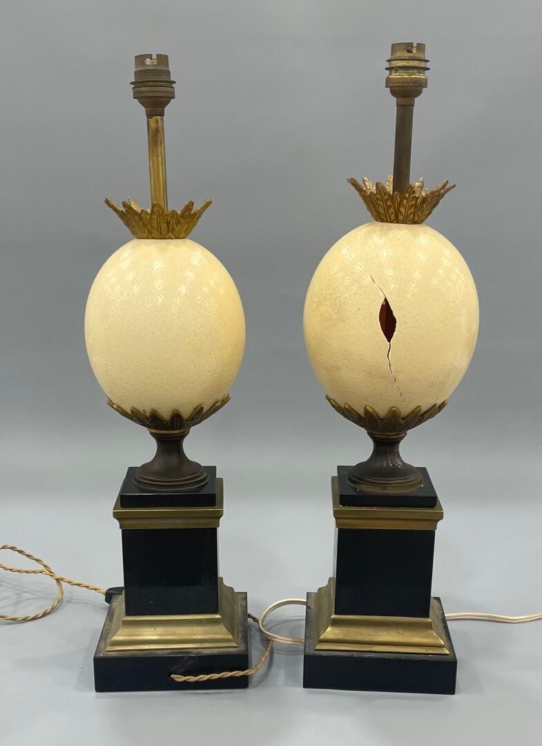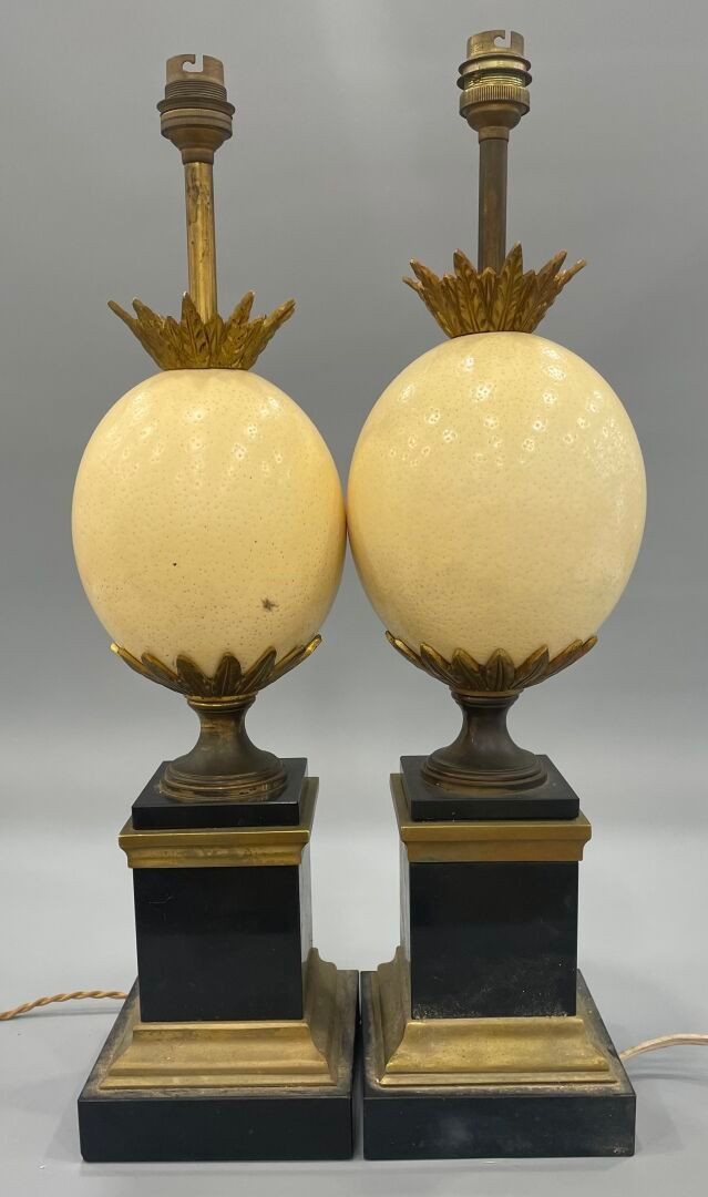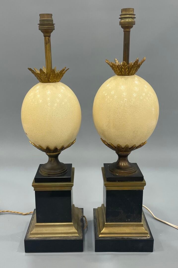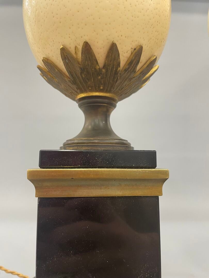 Pair of "ostrich egg" lamps in black marble, lacquered metal and brass.