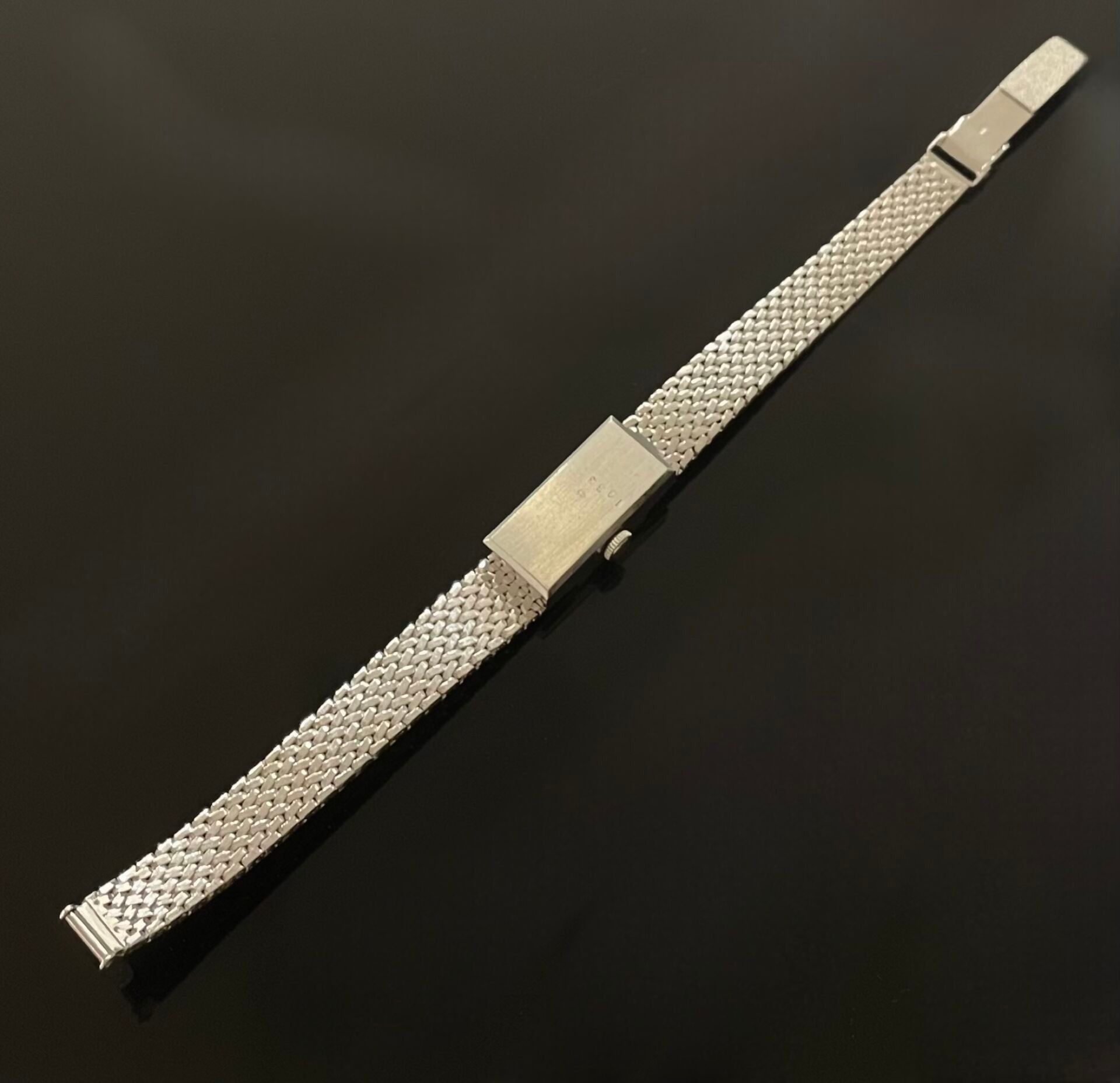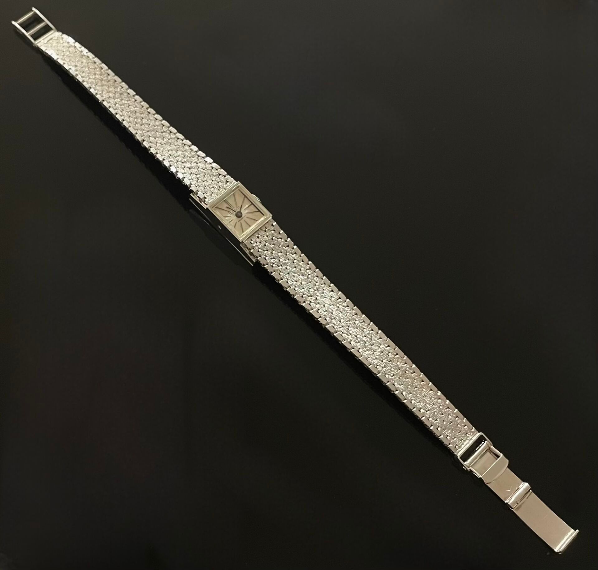 Lady's wristwatch in white gold (750), radiant grey dial with baton hour-markers, mechanical movement, supple ribbon strap.