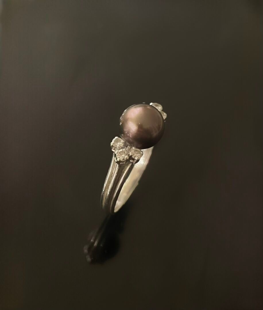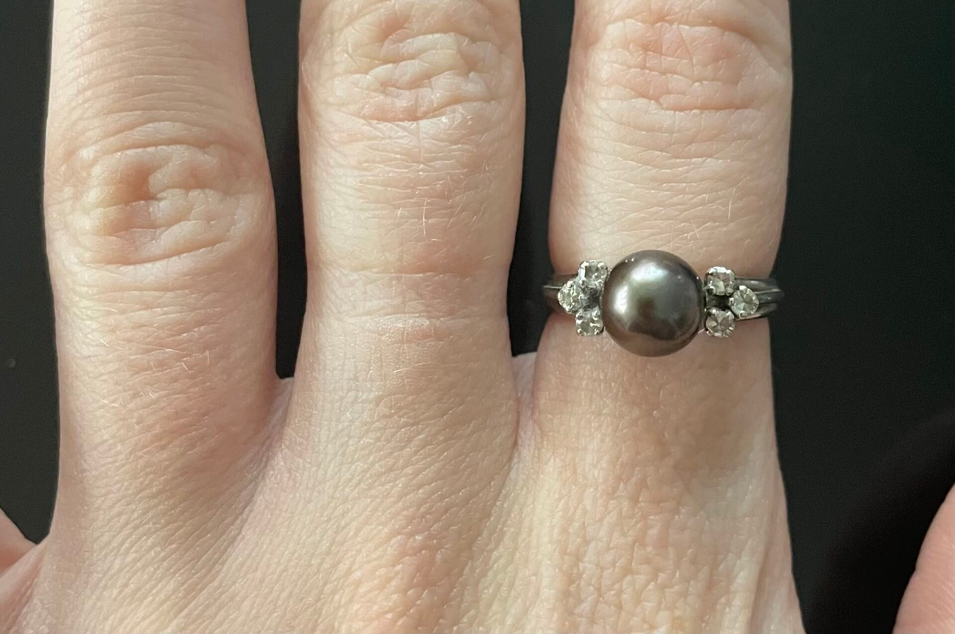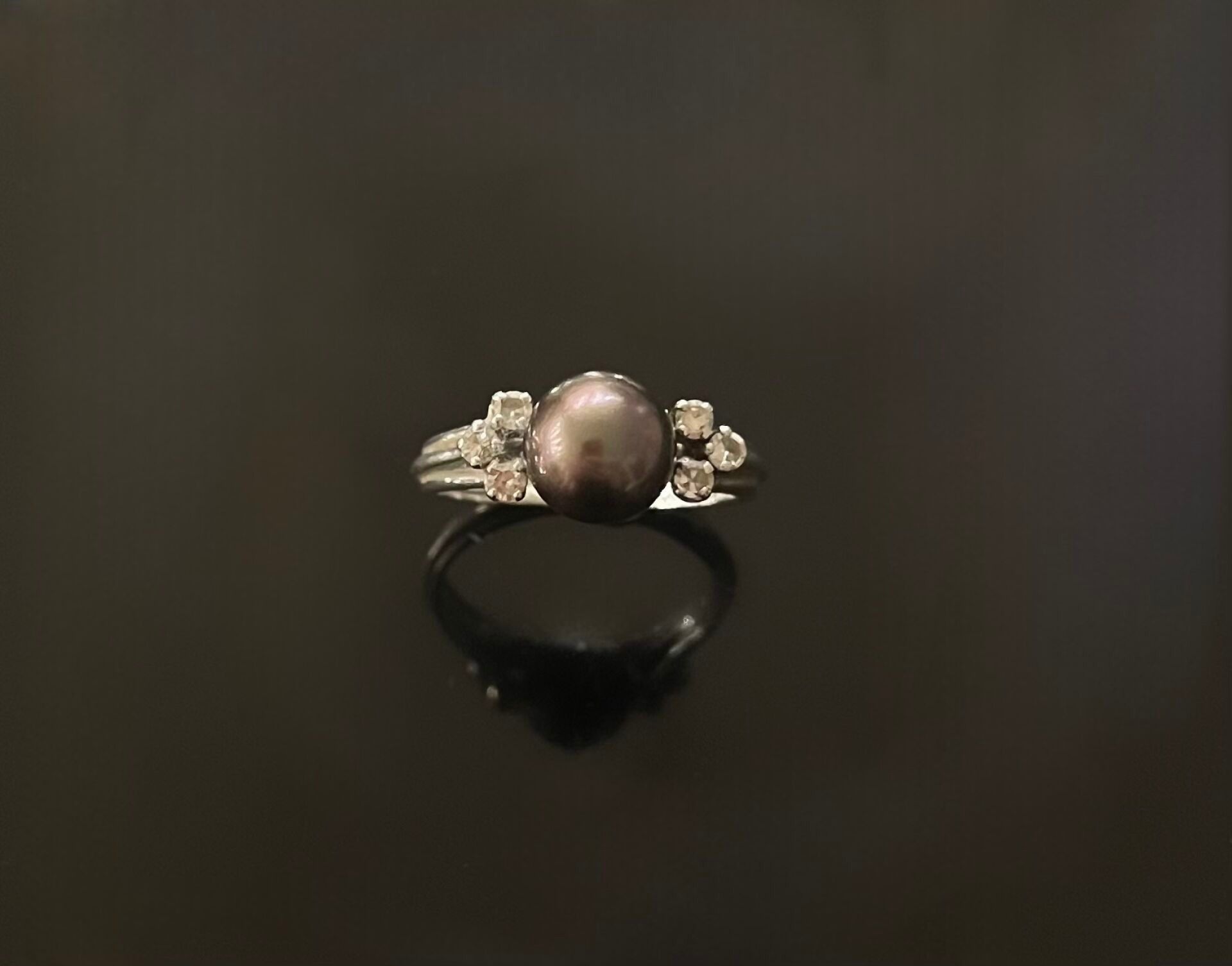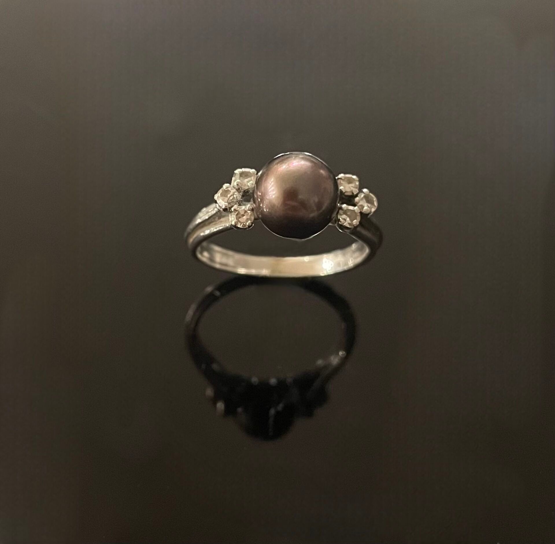 RING in white gold (750) set with a grey pearl and three small brilliants on each shoulder